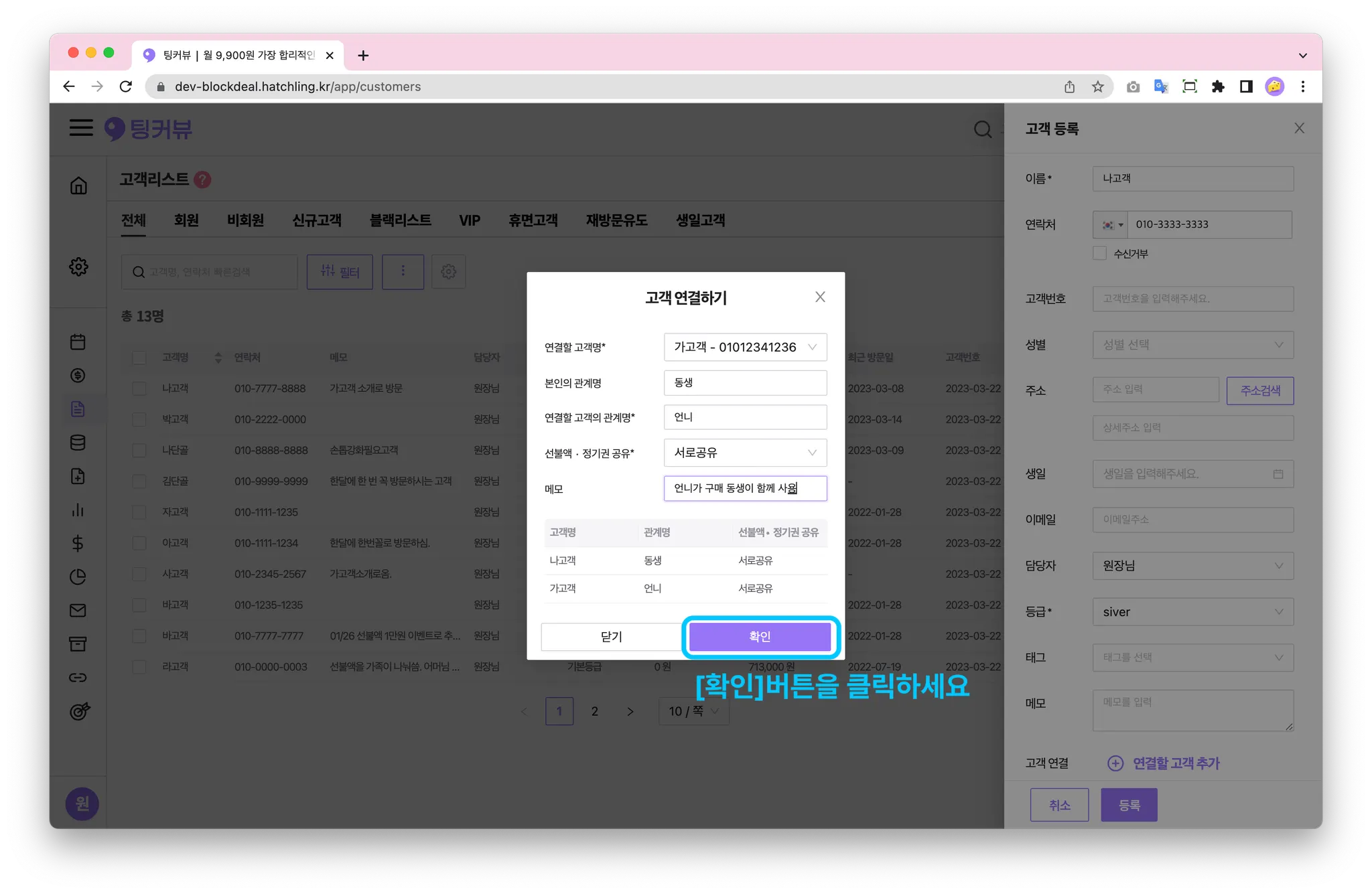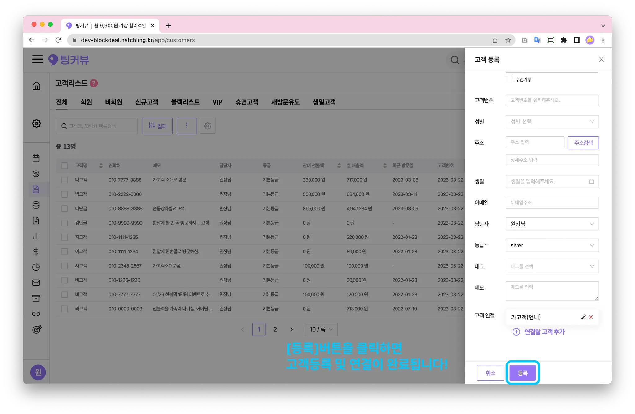 [등록]버튼을 클릭하면 고객등록 및 연결이 완료됩니다!