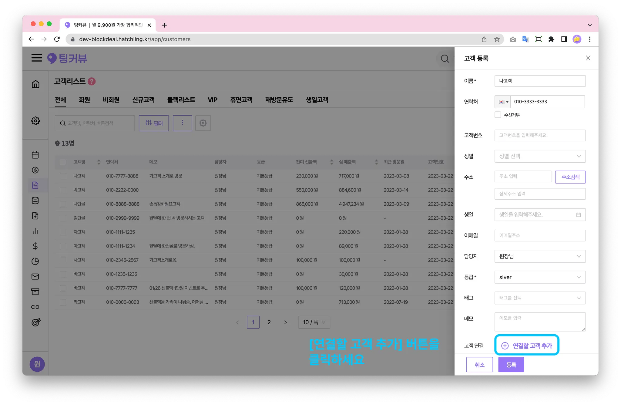 [고객등록] 화면 → 고객연결 → [ + 연결할 고객 추가 ] 버튼을 클릭하세요