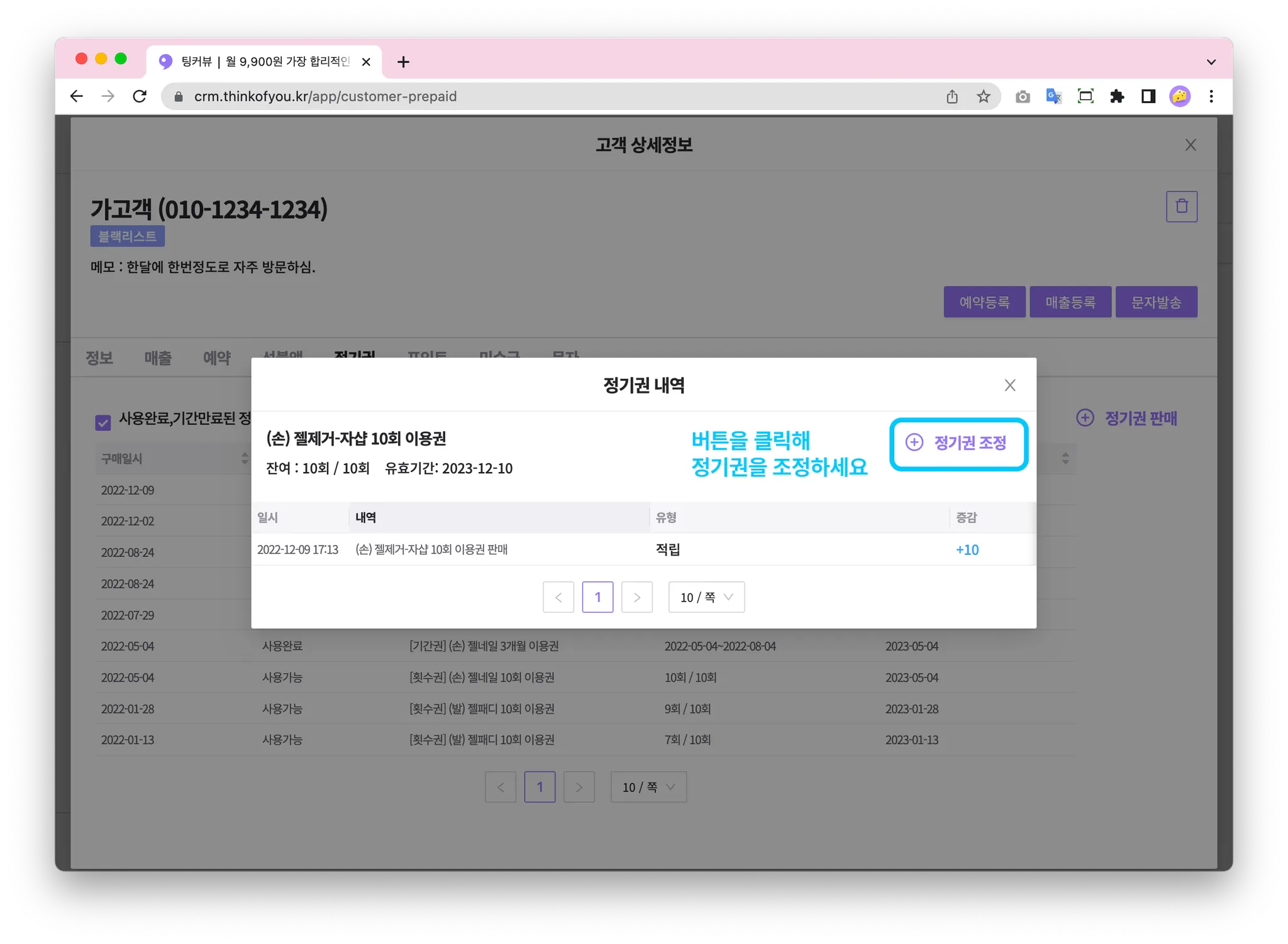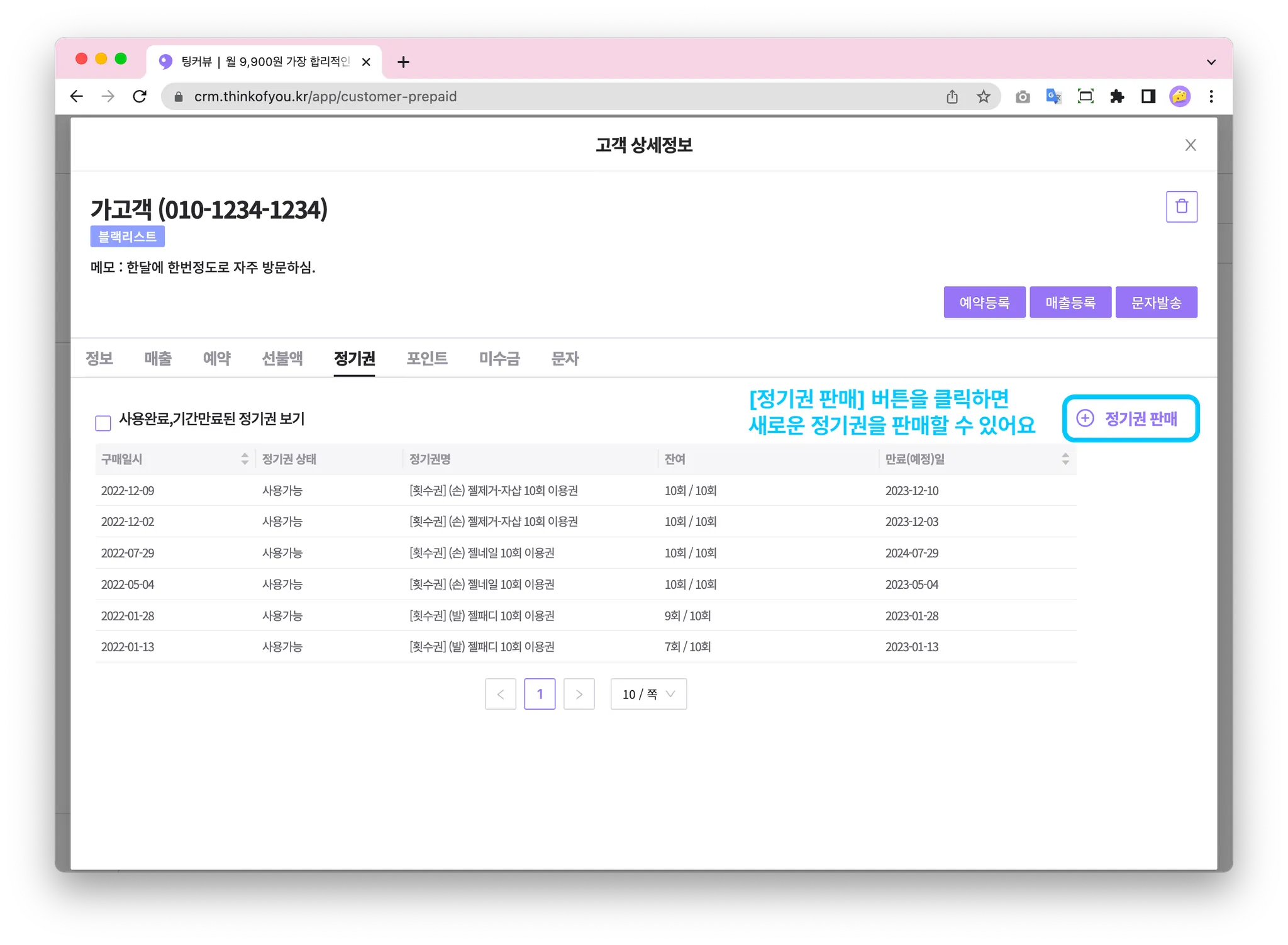 정기권을 클릭하면 고객의 정기권을 관리할 수 있는 화면으로 이동합니다