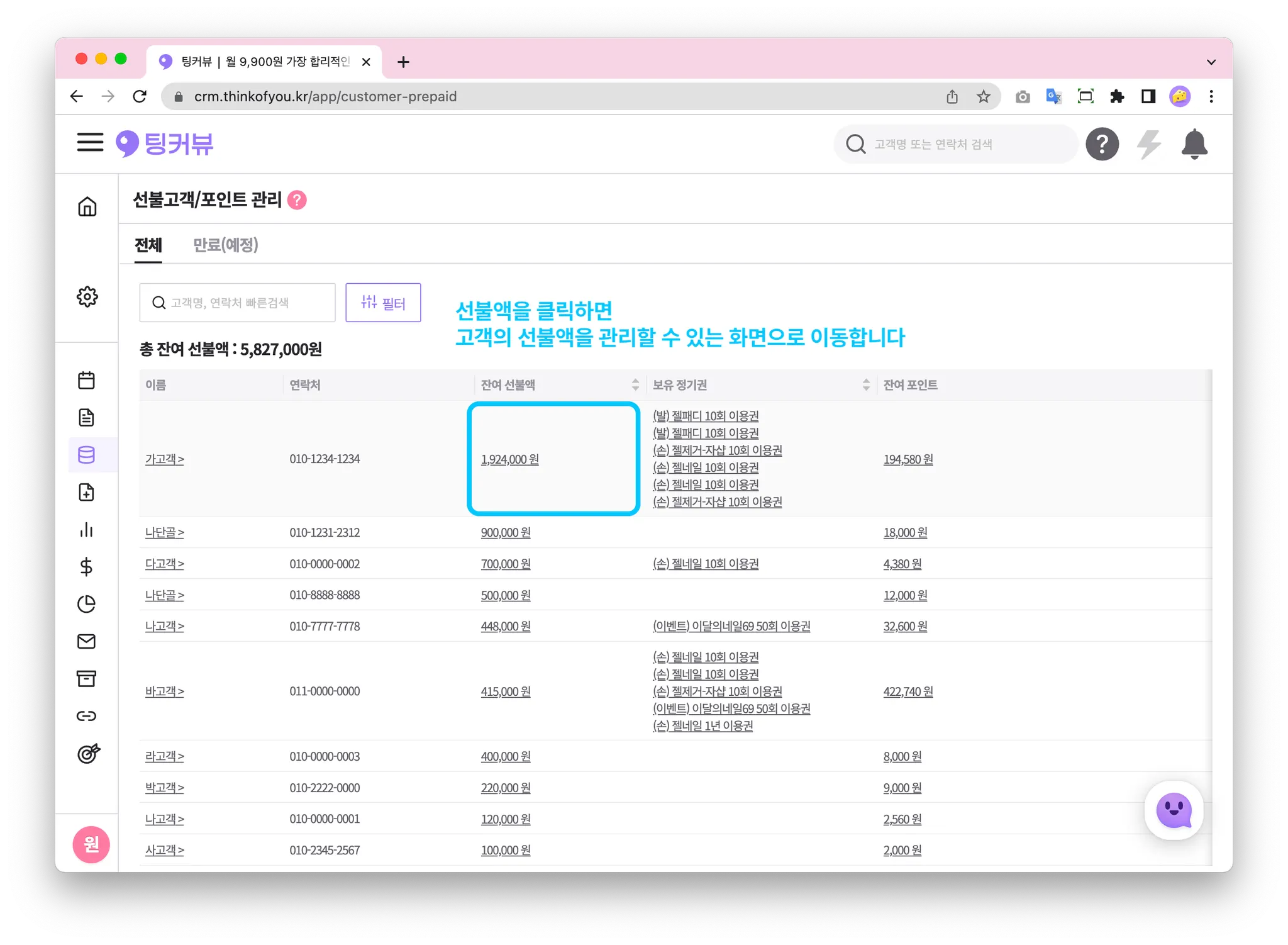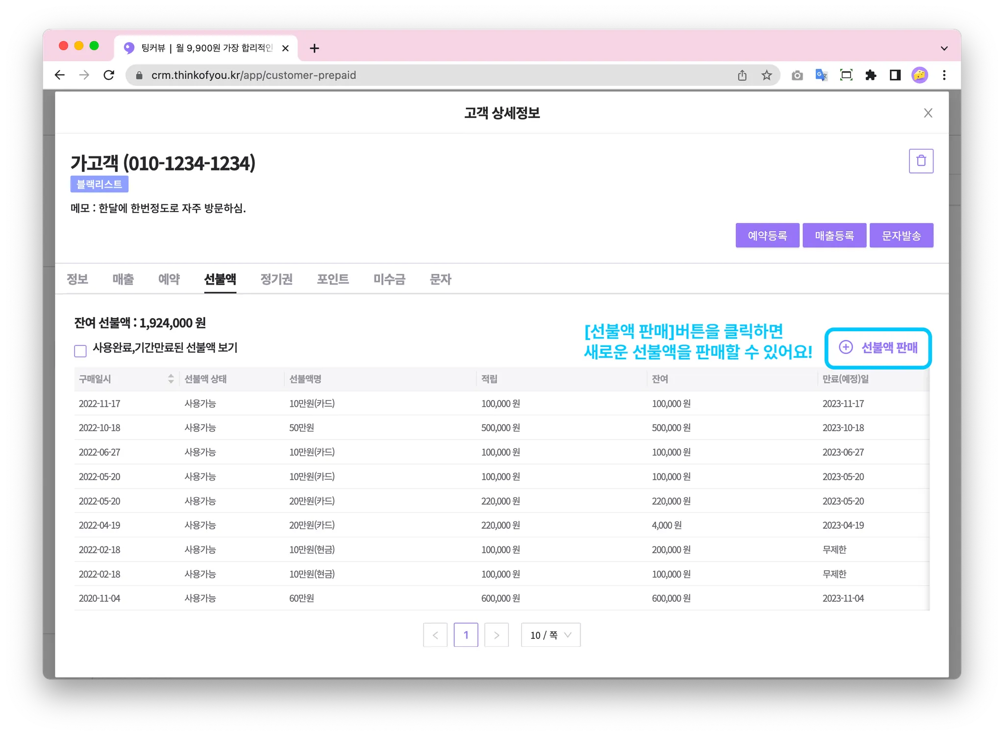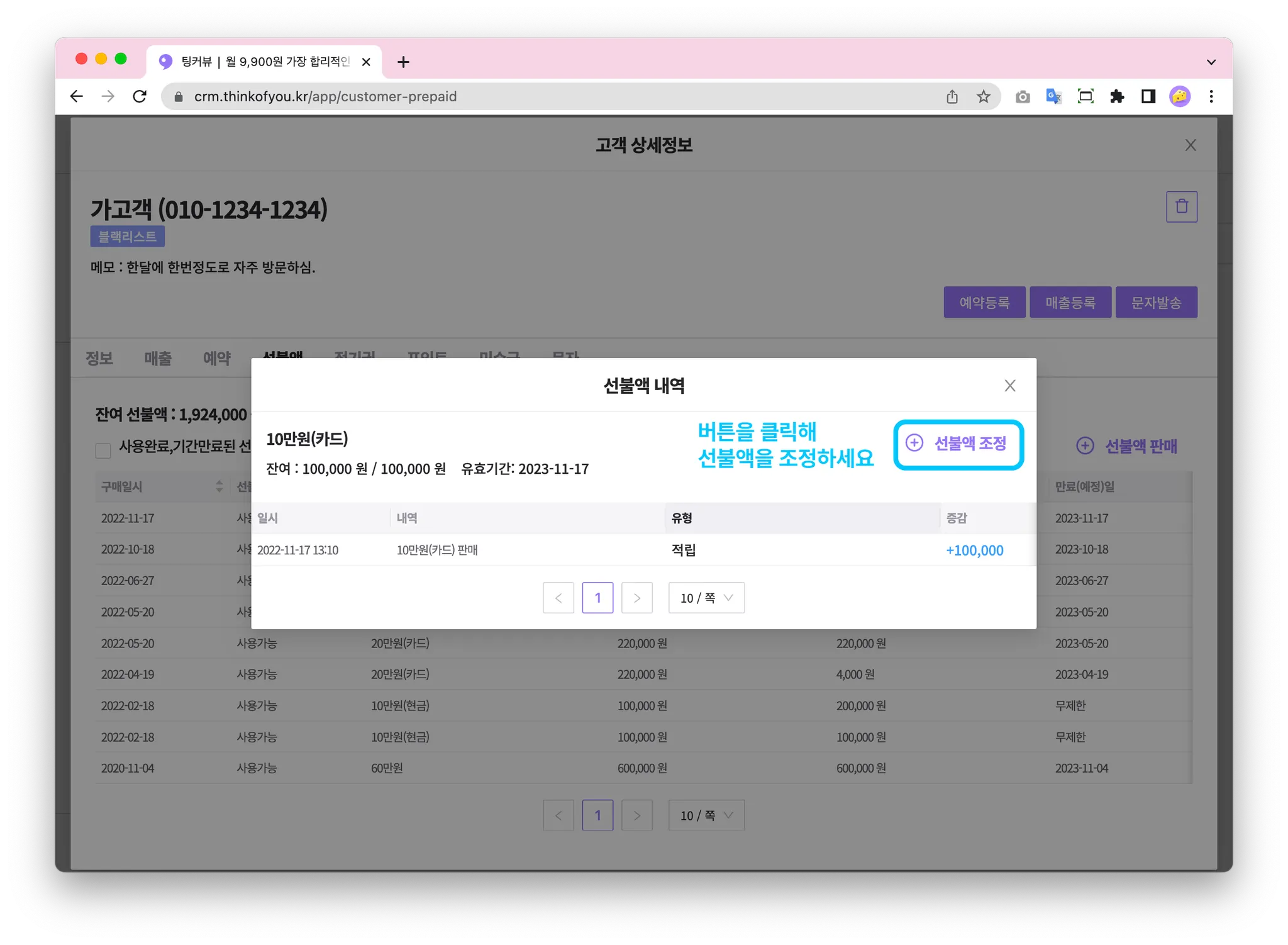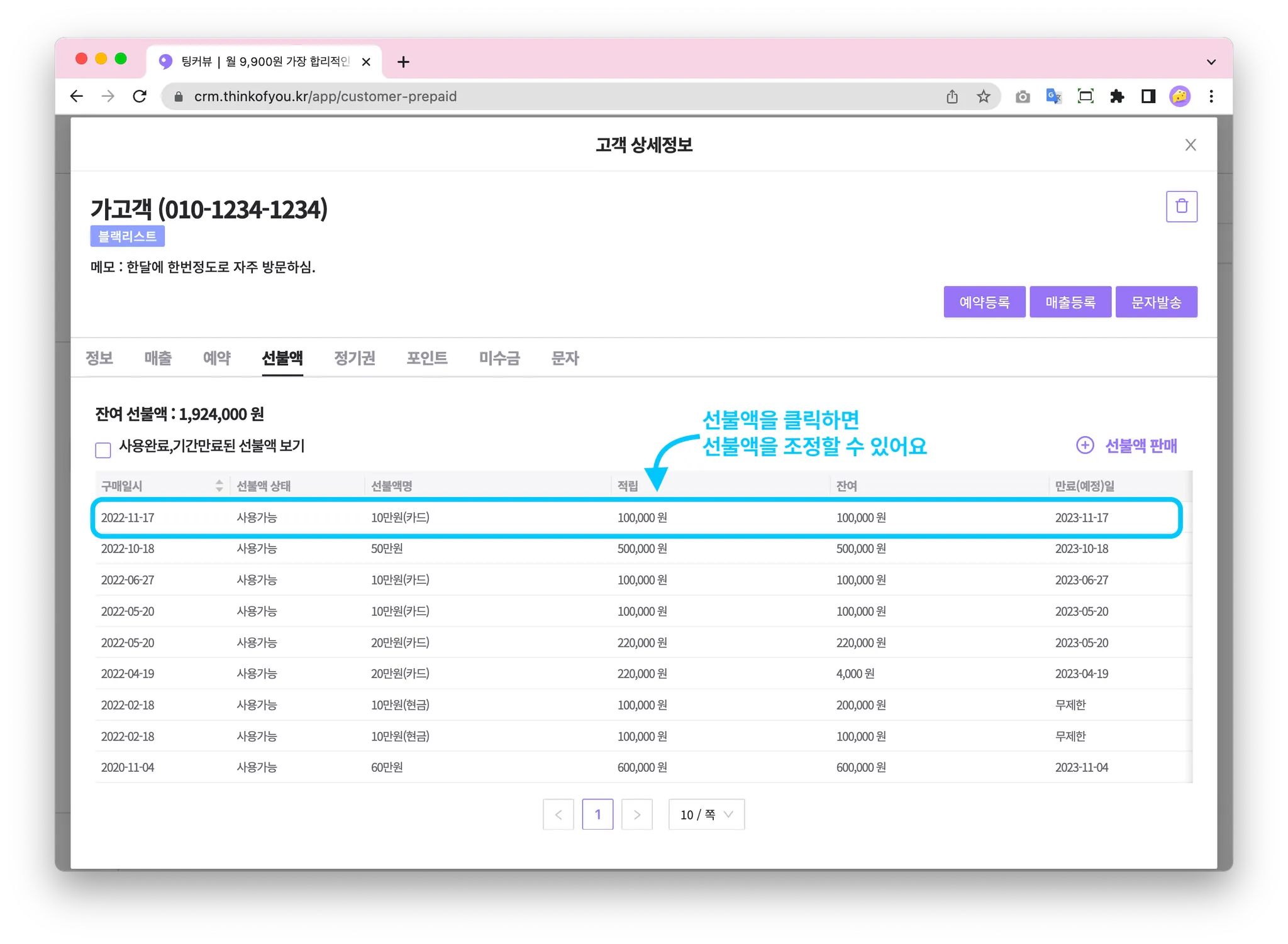 선불액을 클릭하면 고객의 선불액을 관리할 수 있는 화면으로 이동합니다