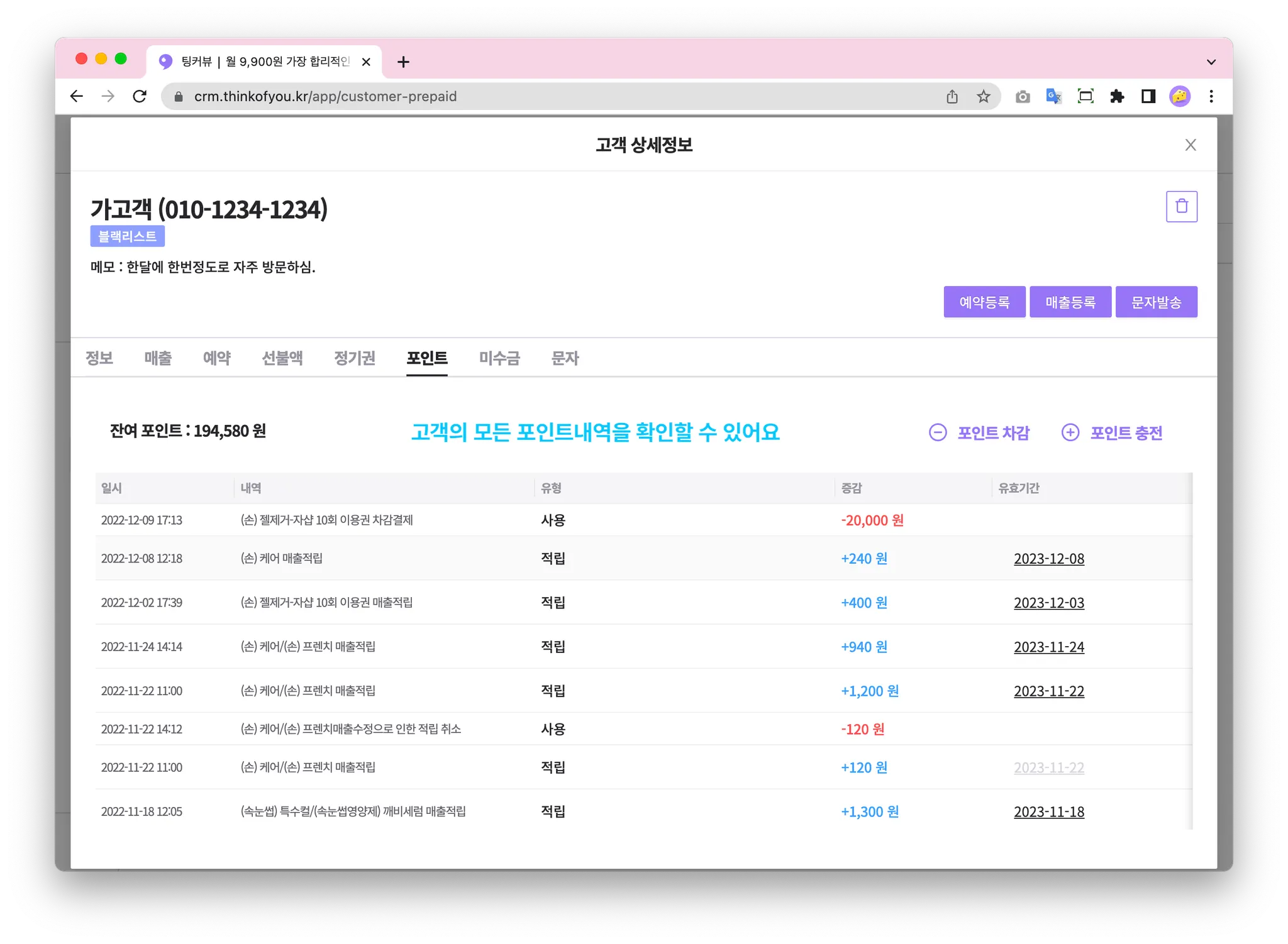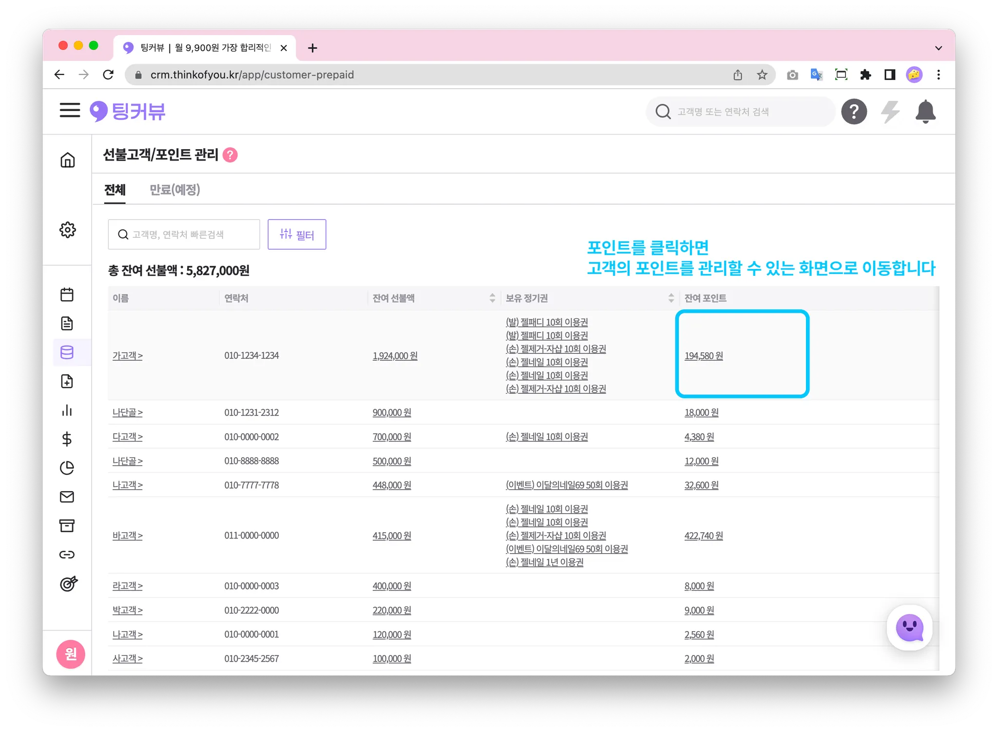 포인트를 클릭하면 고객의 포인트를 관리할 수 있는 화면으로 이동합니다