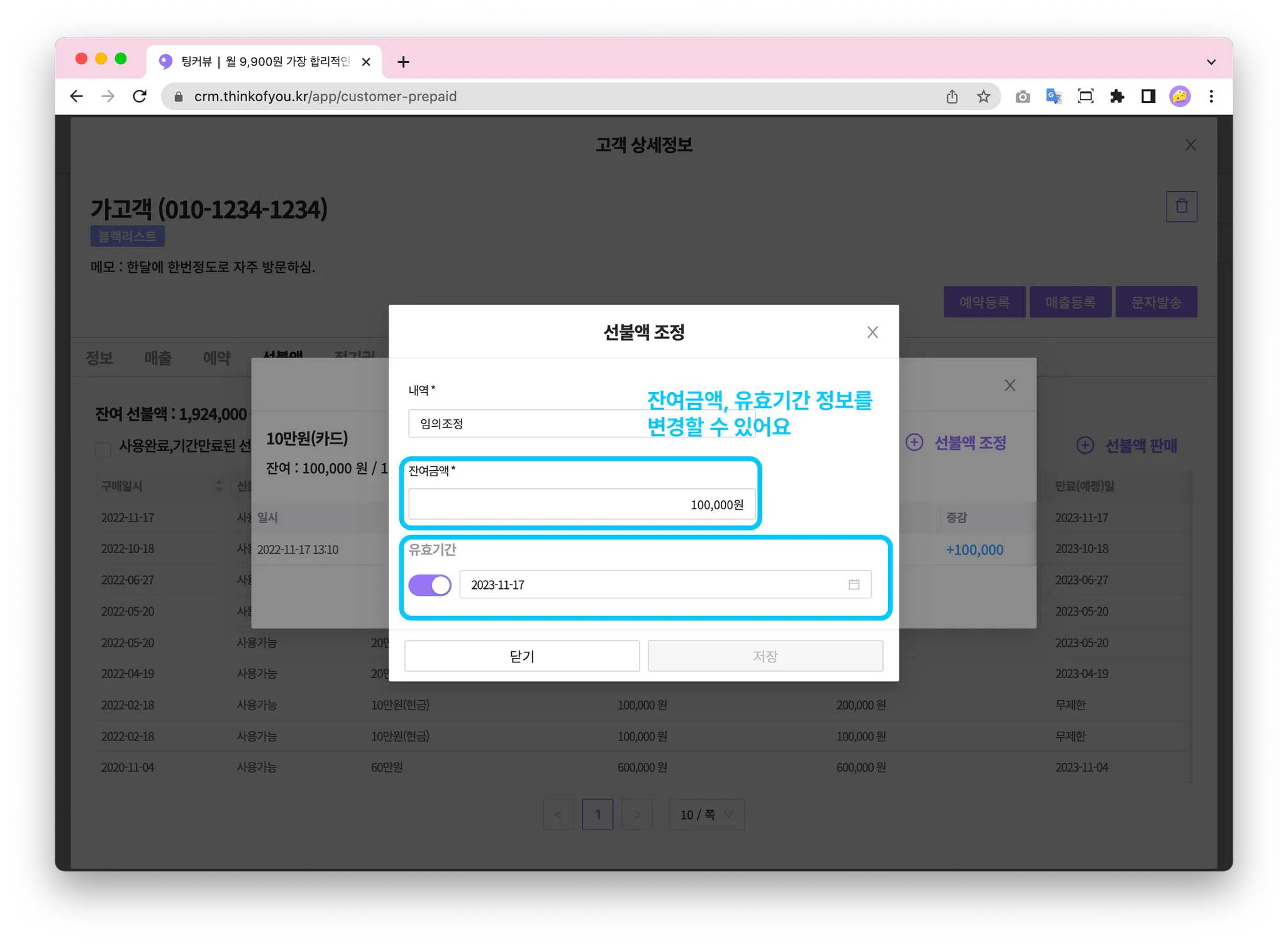 선불액을 클릭하면 잔여금액, 유효기간 변경 등 선불액을 조정할 수 있어요!