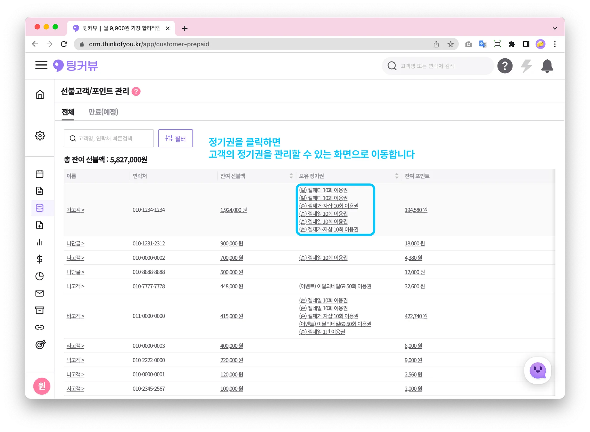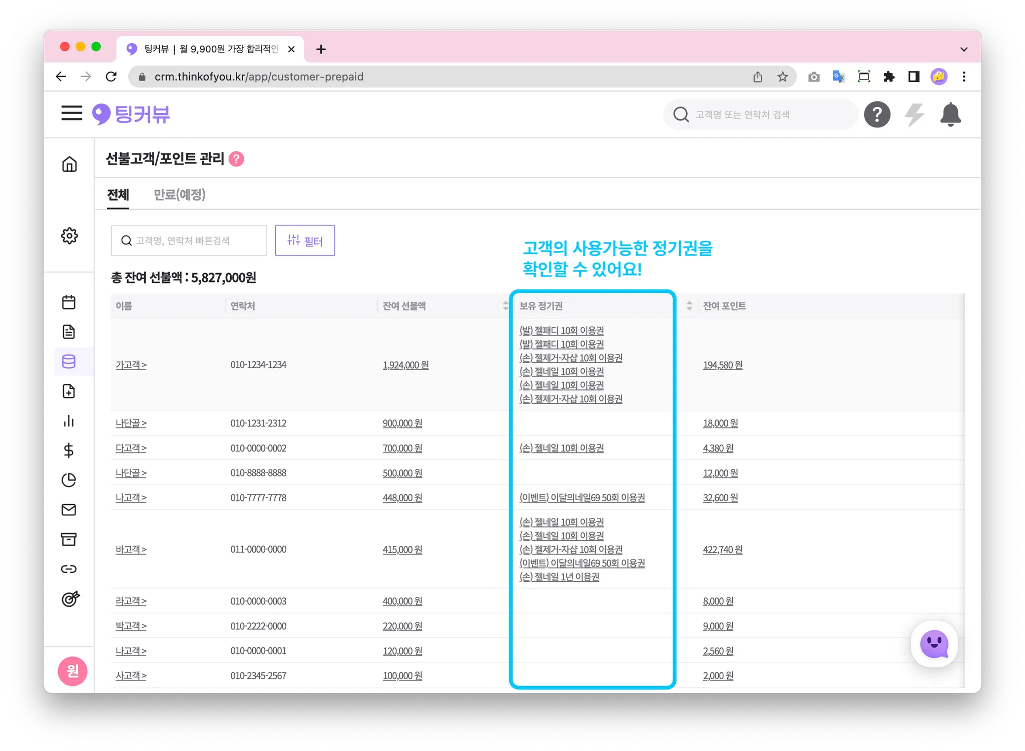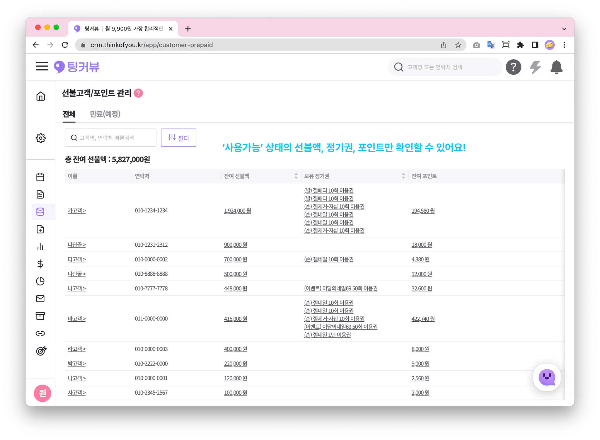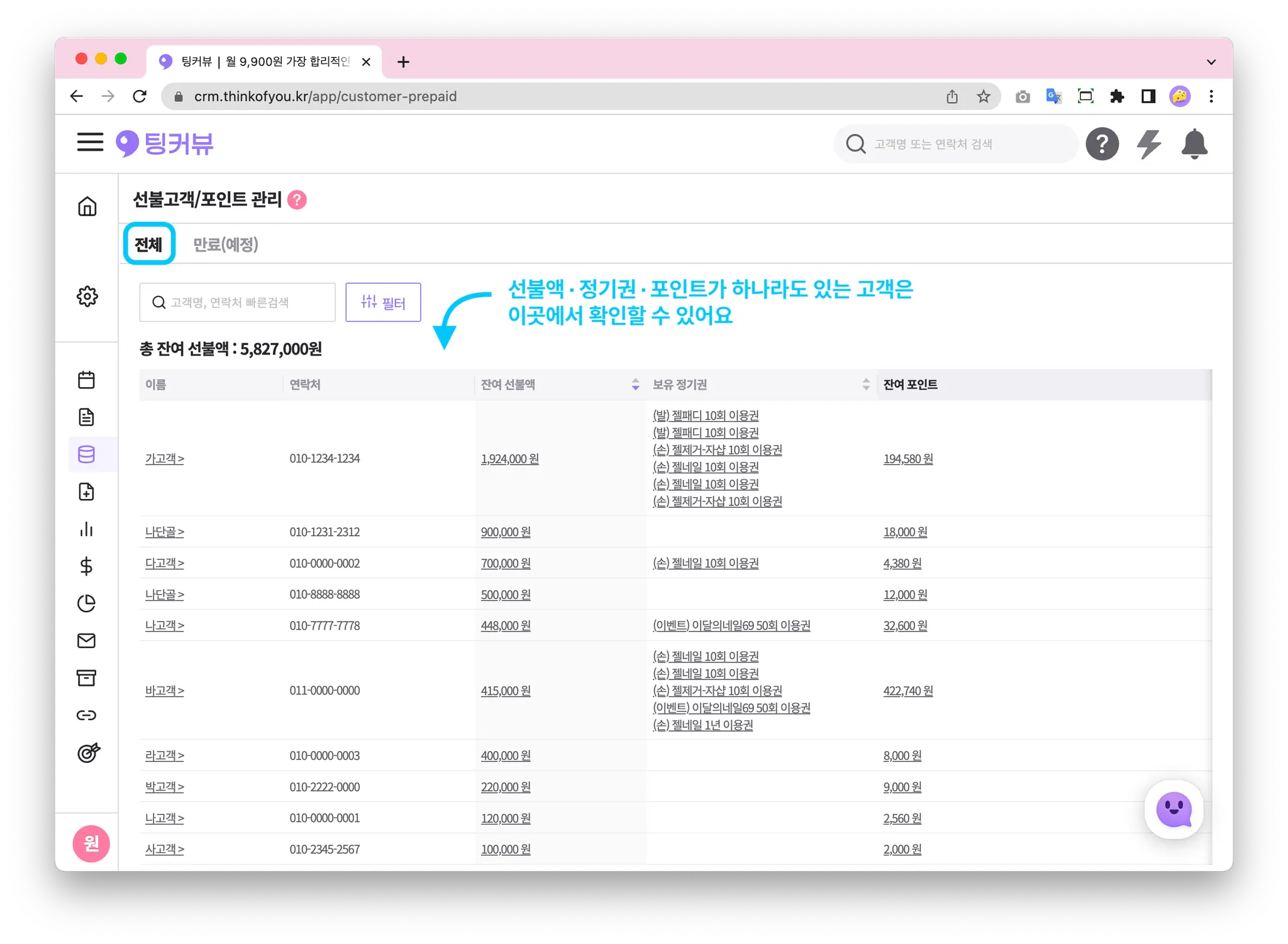 전체고객 중 선불액∙정기권∙포인트가 하나라도 있으면 이 페이지에서 확인할 수 있어요!