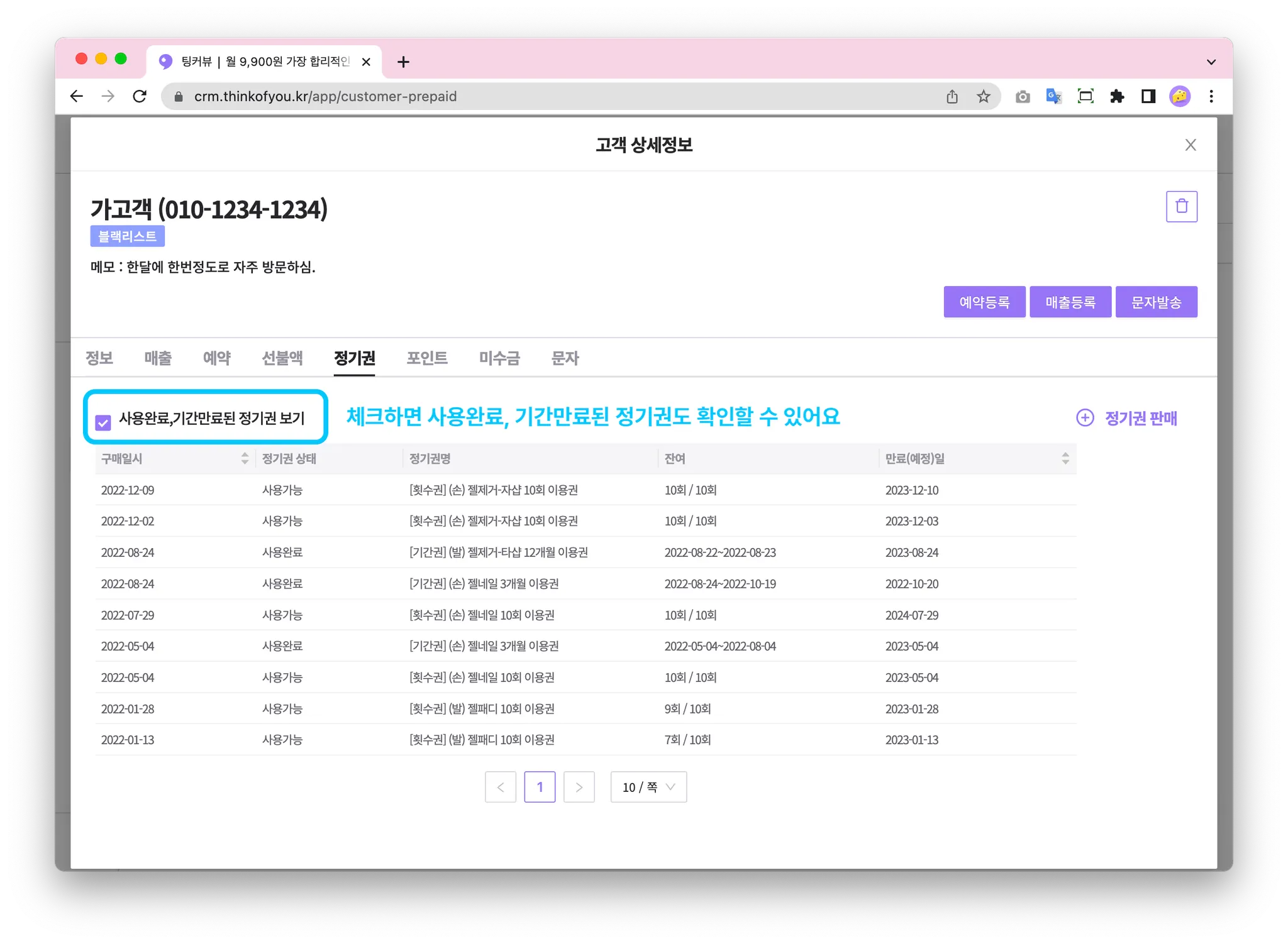체크박스를 체크하면 사용완료, 기간만료된 정기권도 확인할 수 있어요