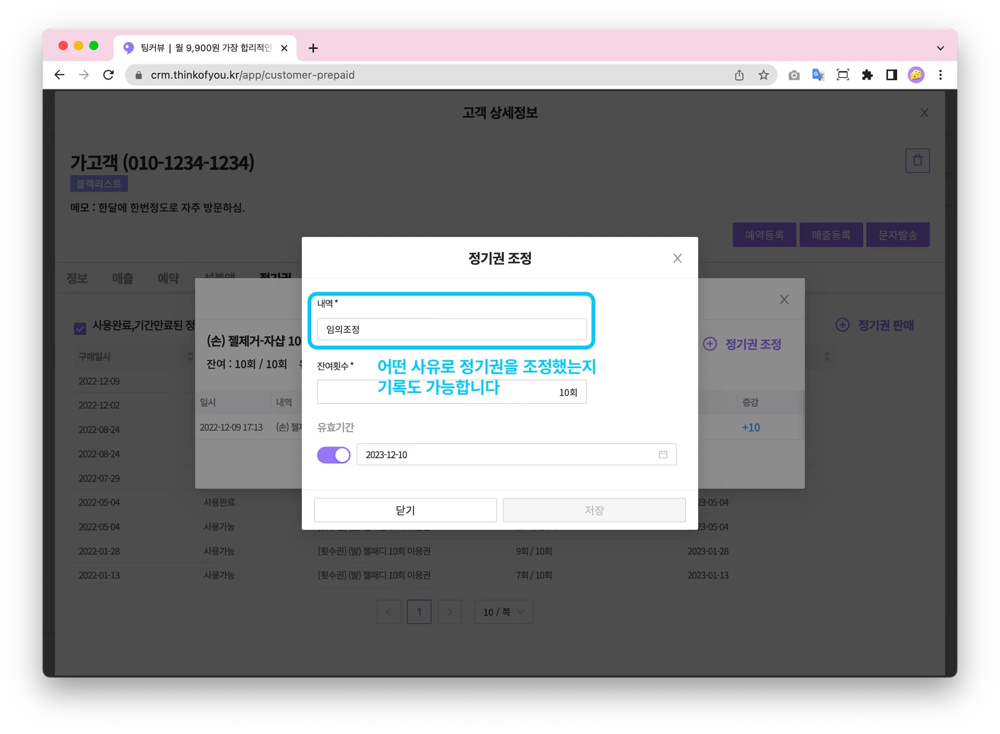 어떤 사유로 정기권을 조정했는지 기록도 가능합니다