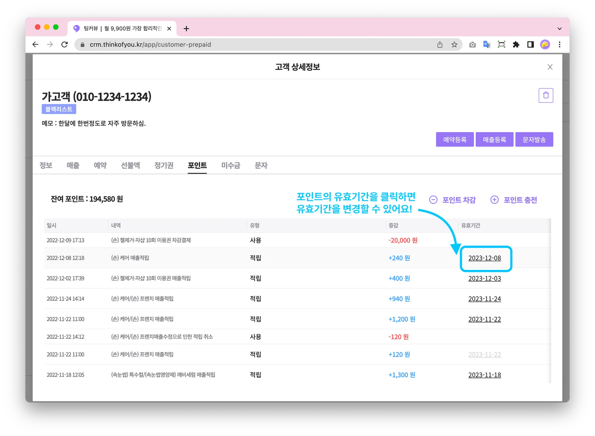포인트의 유효기간을 클릭하면 유효기간을 변경할 수 있어요!