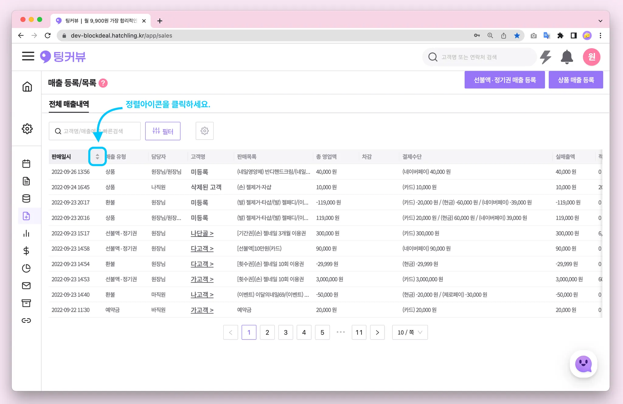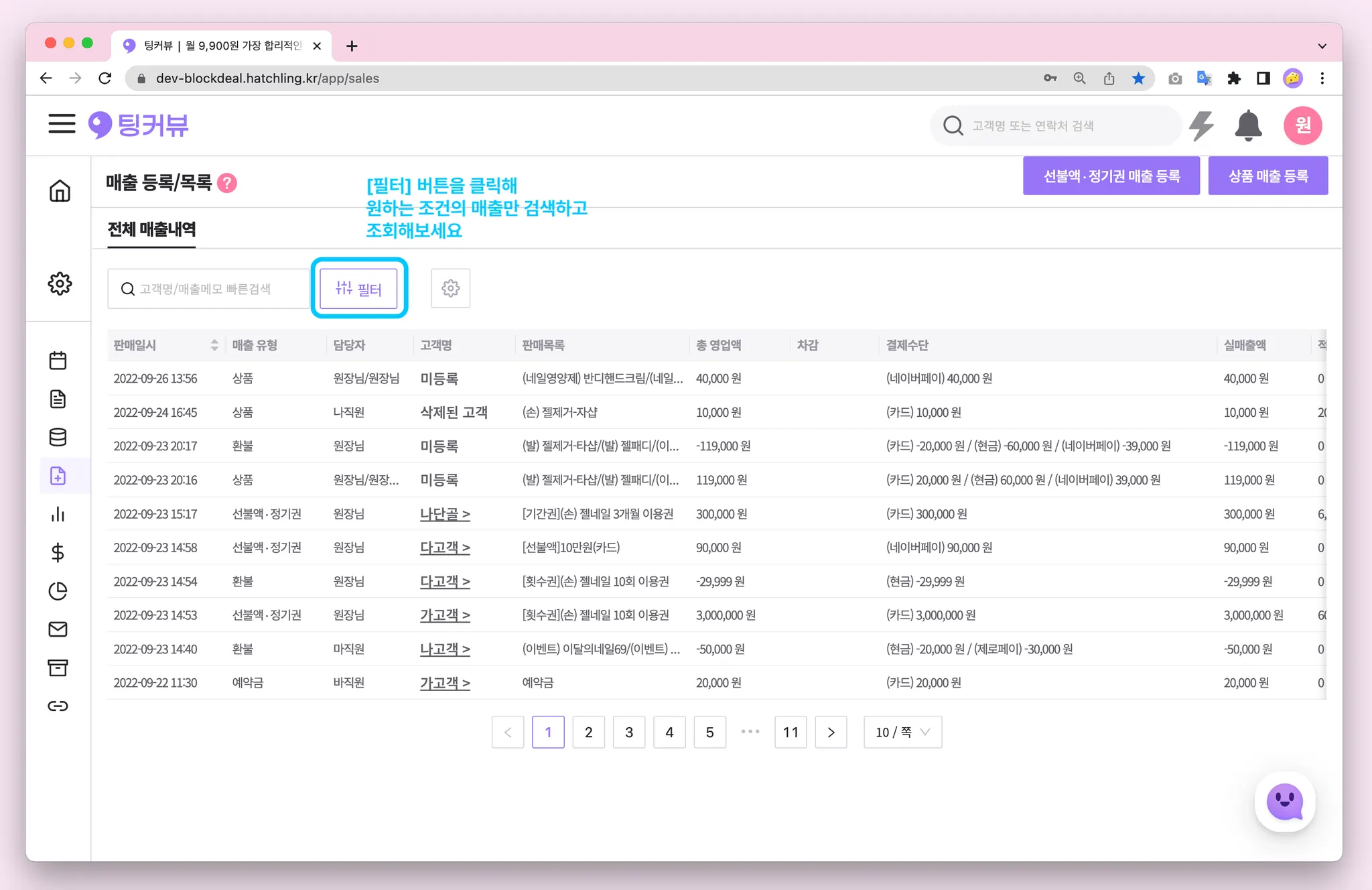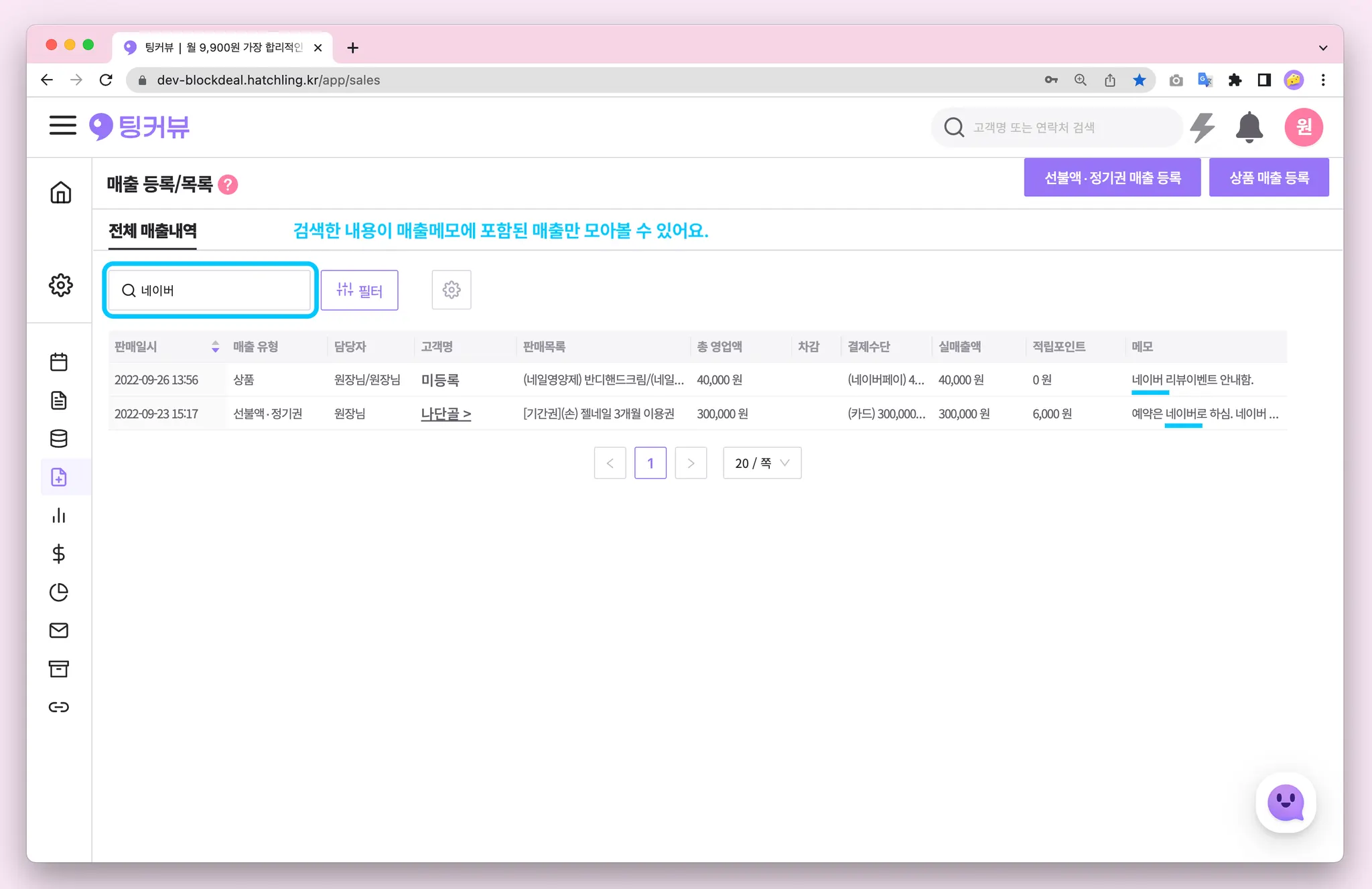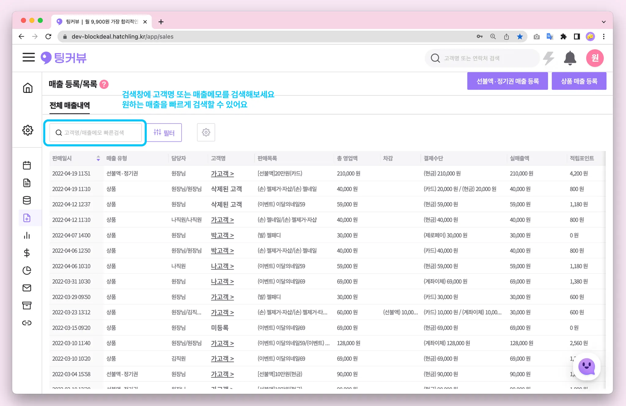 검색창에 고객명 또는 매출메모를 검색해보세요! 원하는 매출을 빠르게 검색할 수 있어요