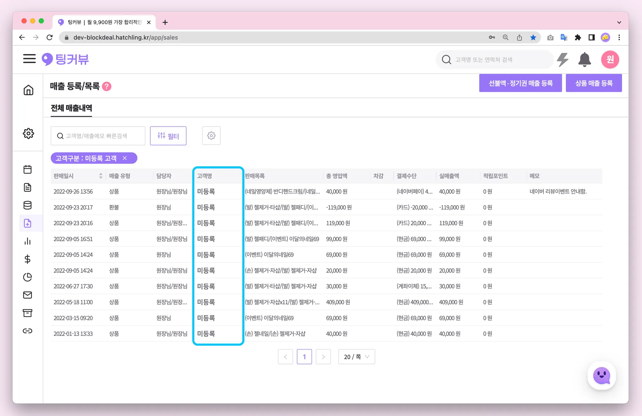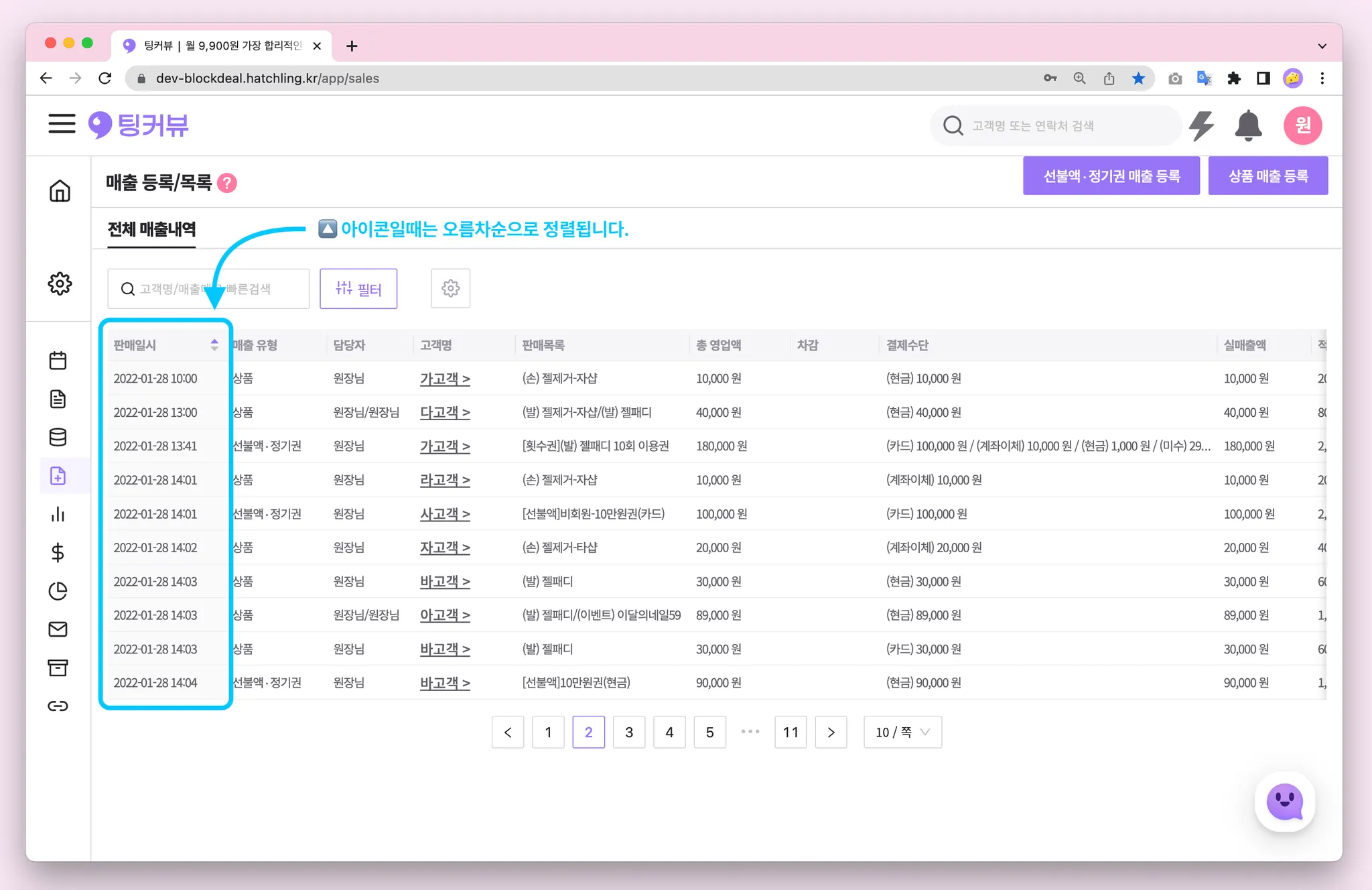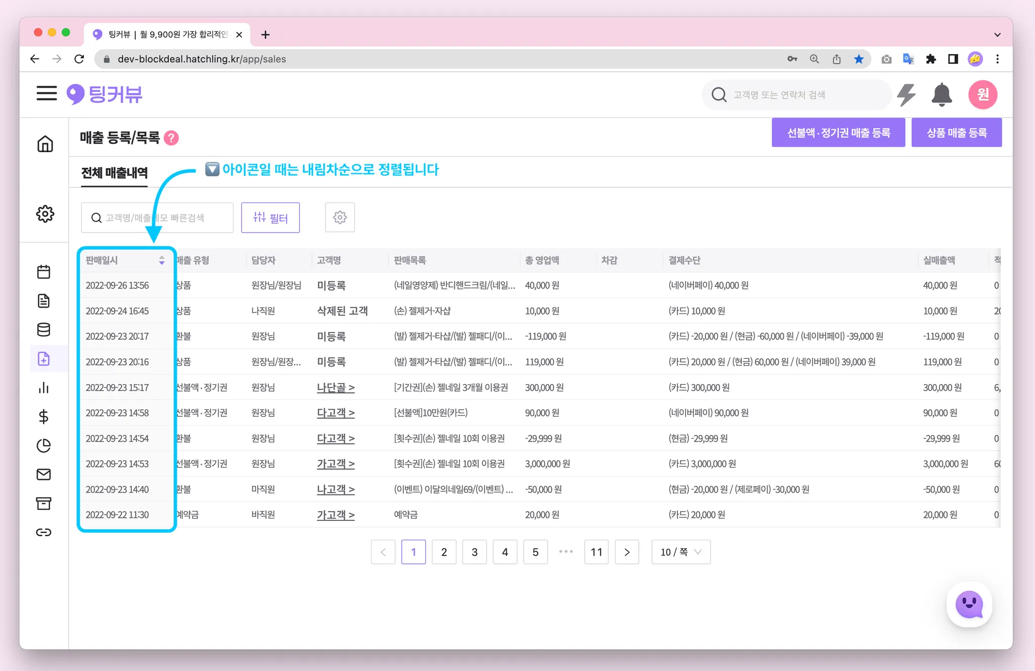 검색창에 고객명 또는 매출메모를 검색해보세요! 원하는 매출을 빠르게 검색할 수 있어요