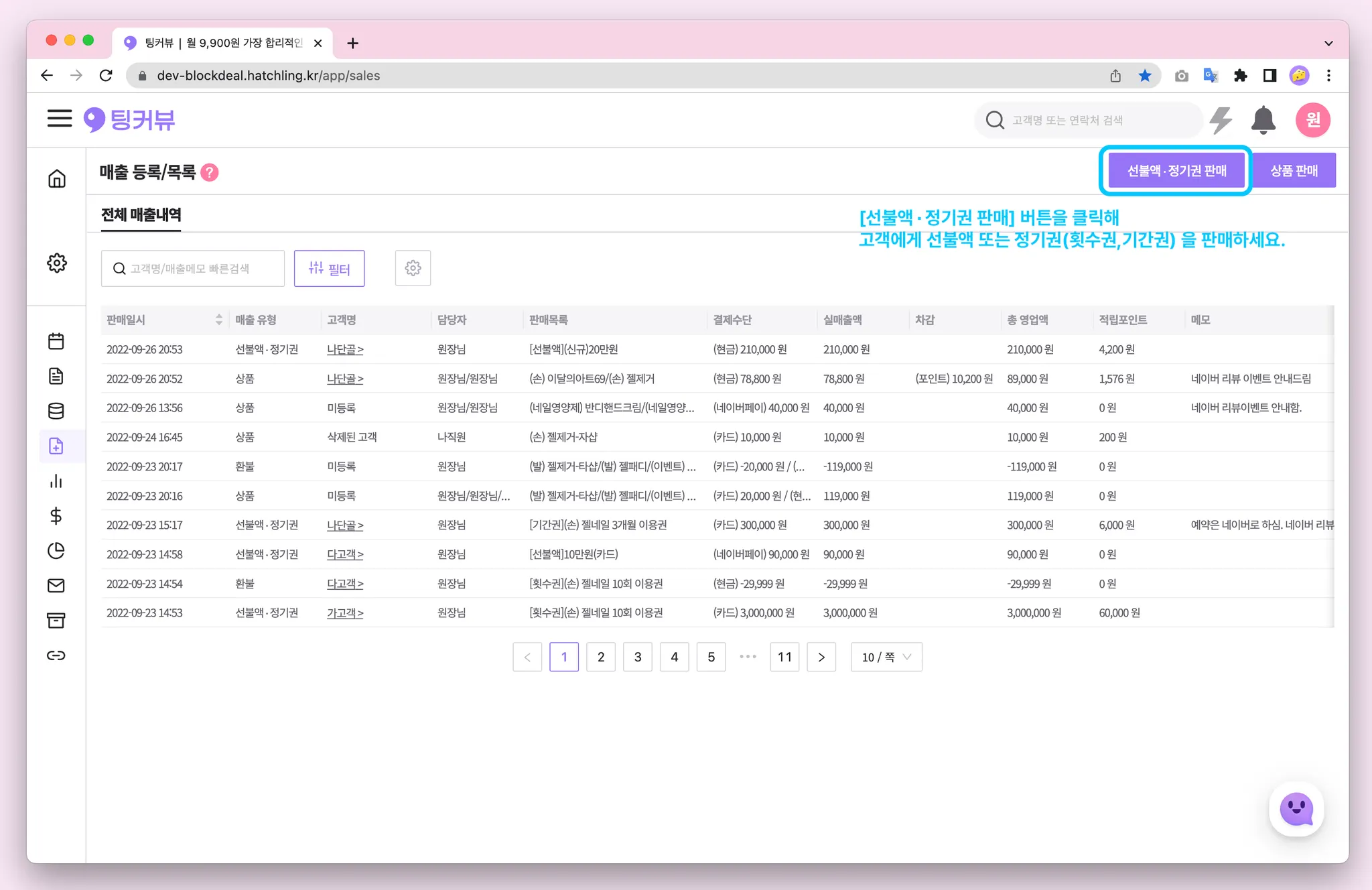 고객에게 선불액 또는 정기권(횟수권,기간권)을 판매하고 싶다면, 우측상단의 [선불액∙정기권 판매]버튼을 클릭하세요!