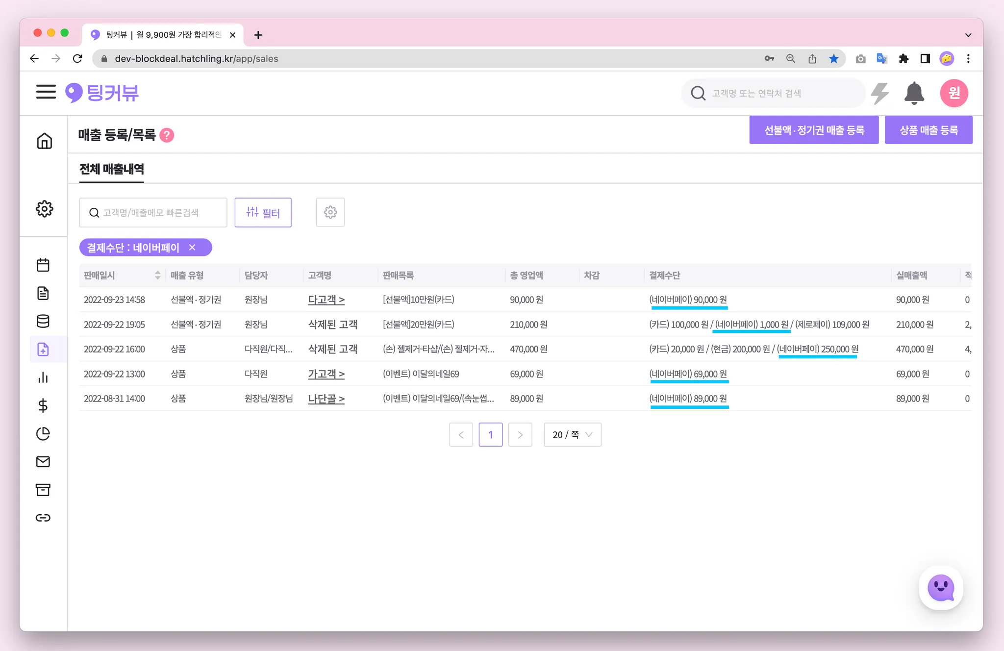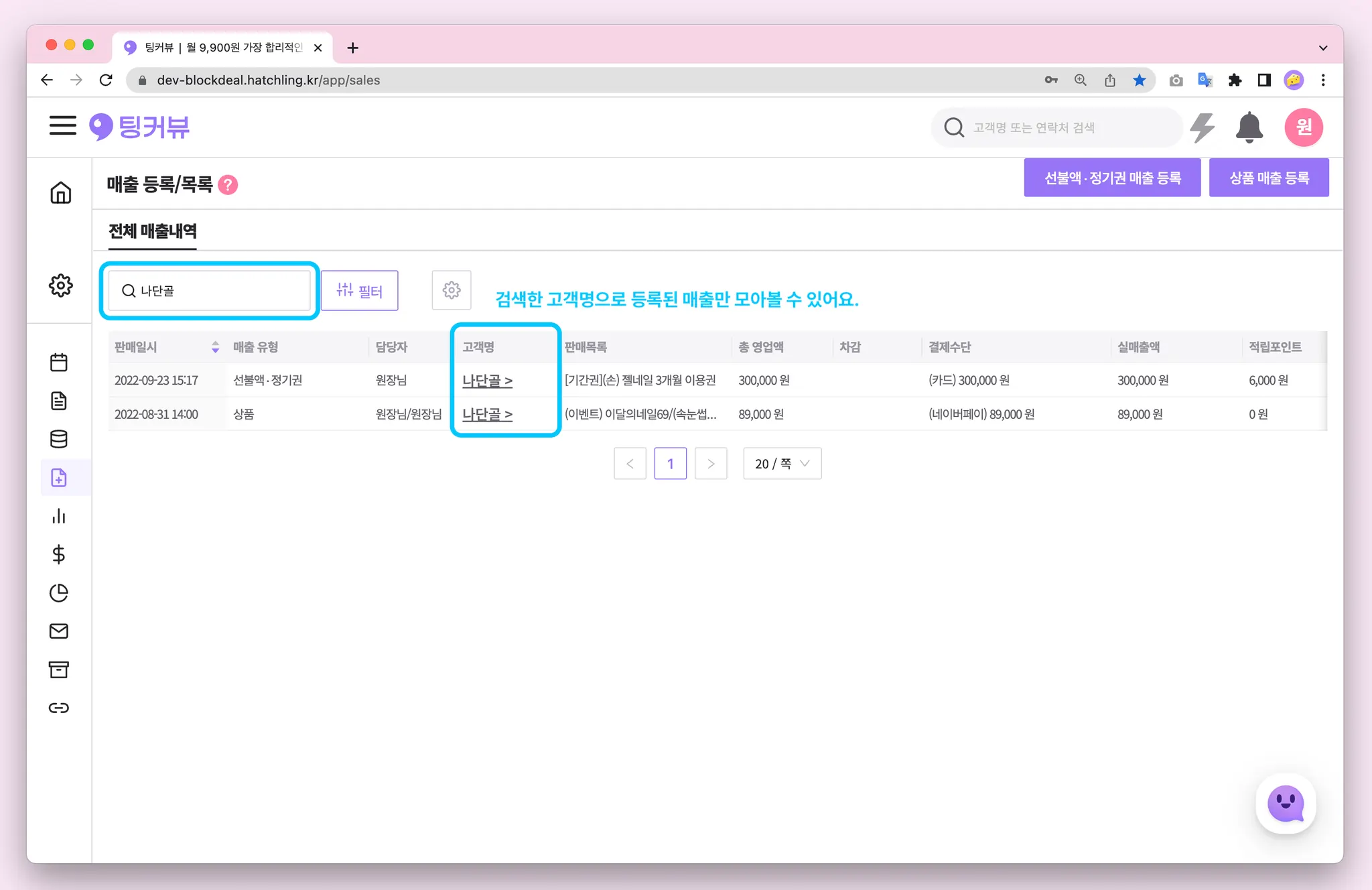 고객명을 검색해보세요! 검색한 고객명으로 등록된 매출만 모아볼 수 있어요!