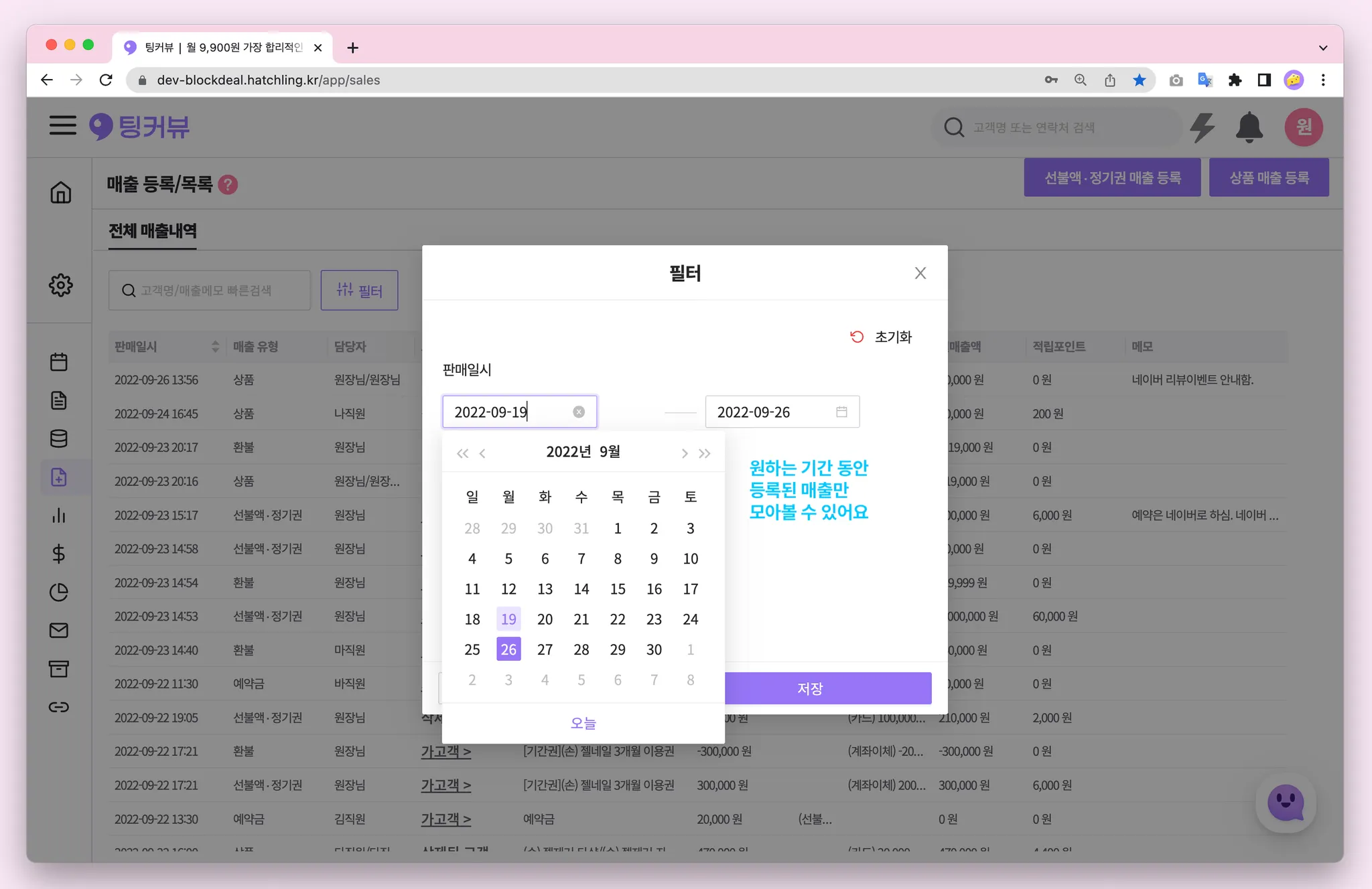 판매일시 필터에서 원하는 시작일과 종료일을 선택하세요.