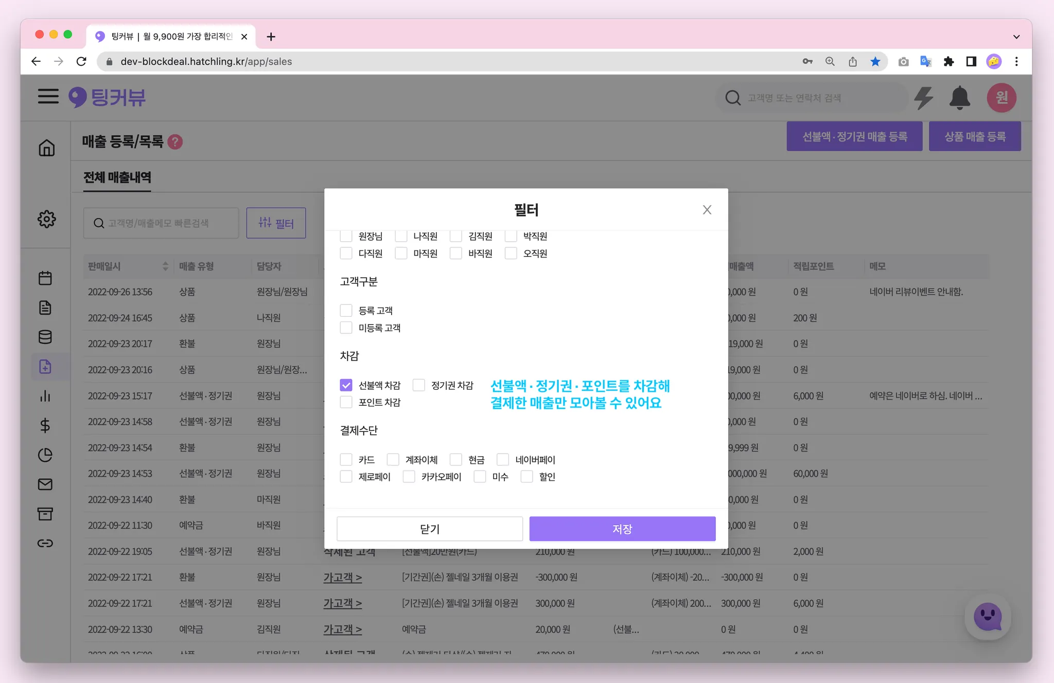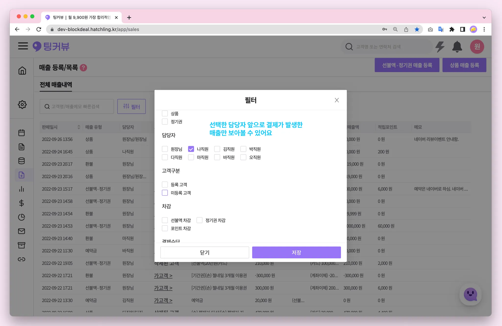 [저장]버튼을 클릭하면 선택한 담당자 앞으로 결제금액이 발생한 매출만 조회할 수 있어요!