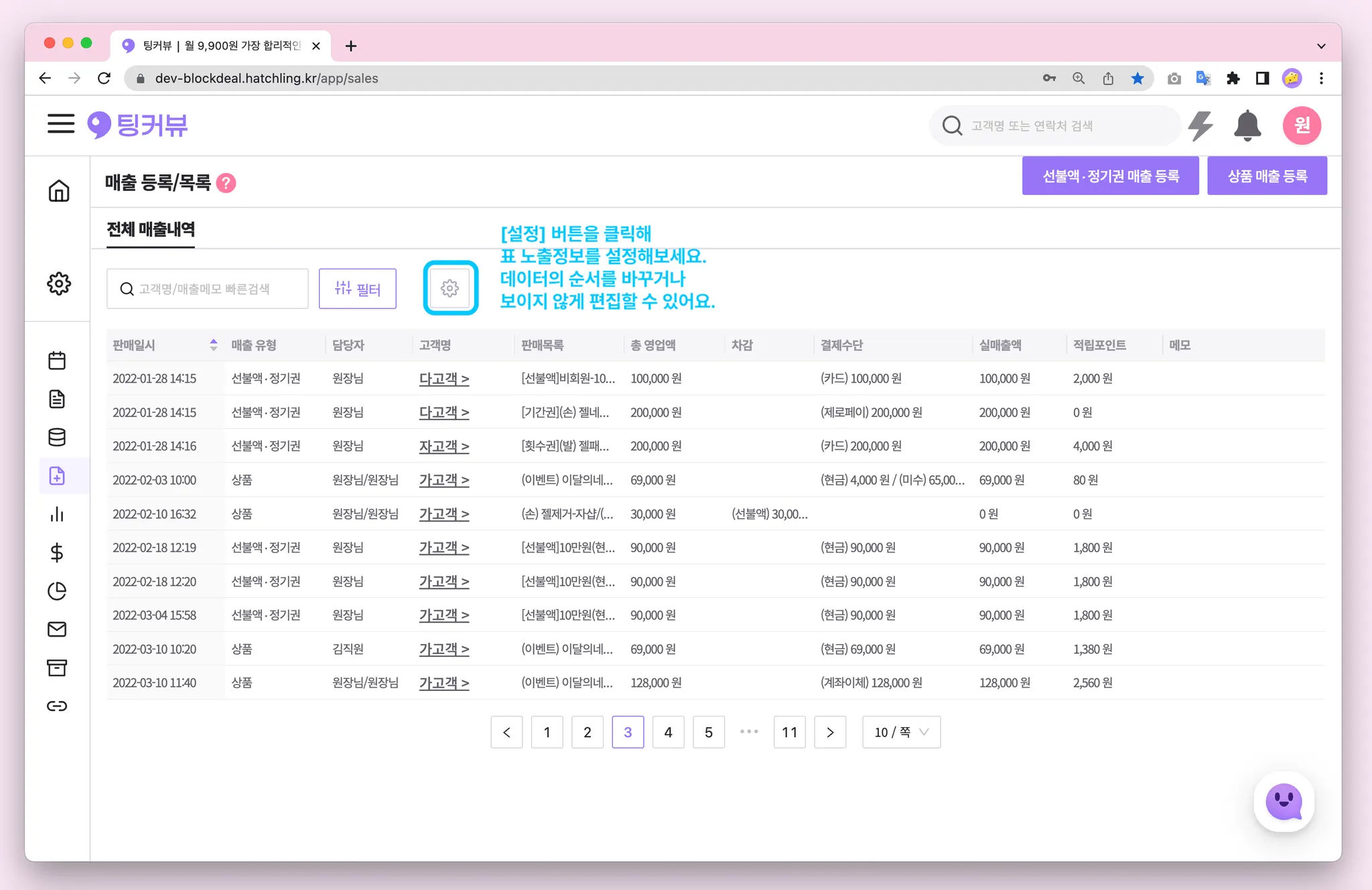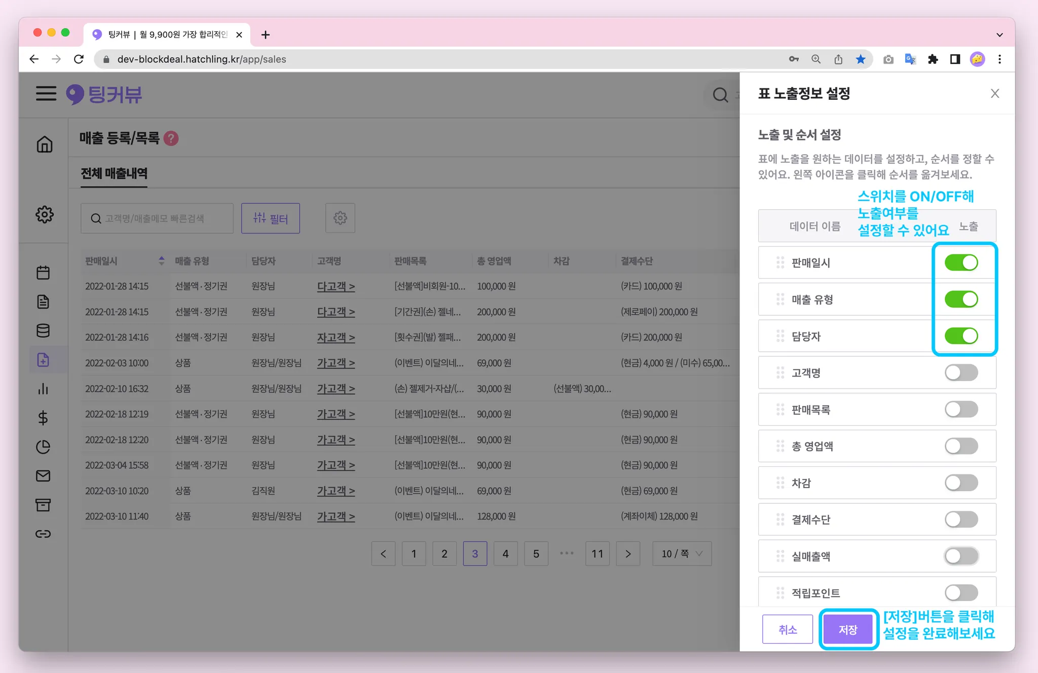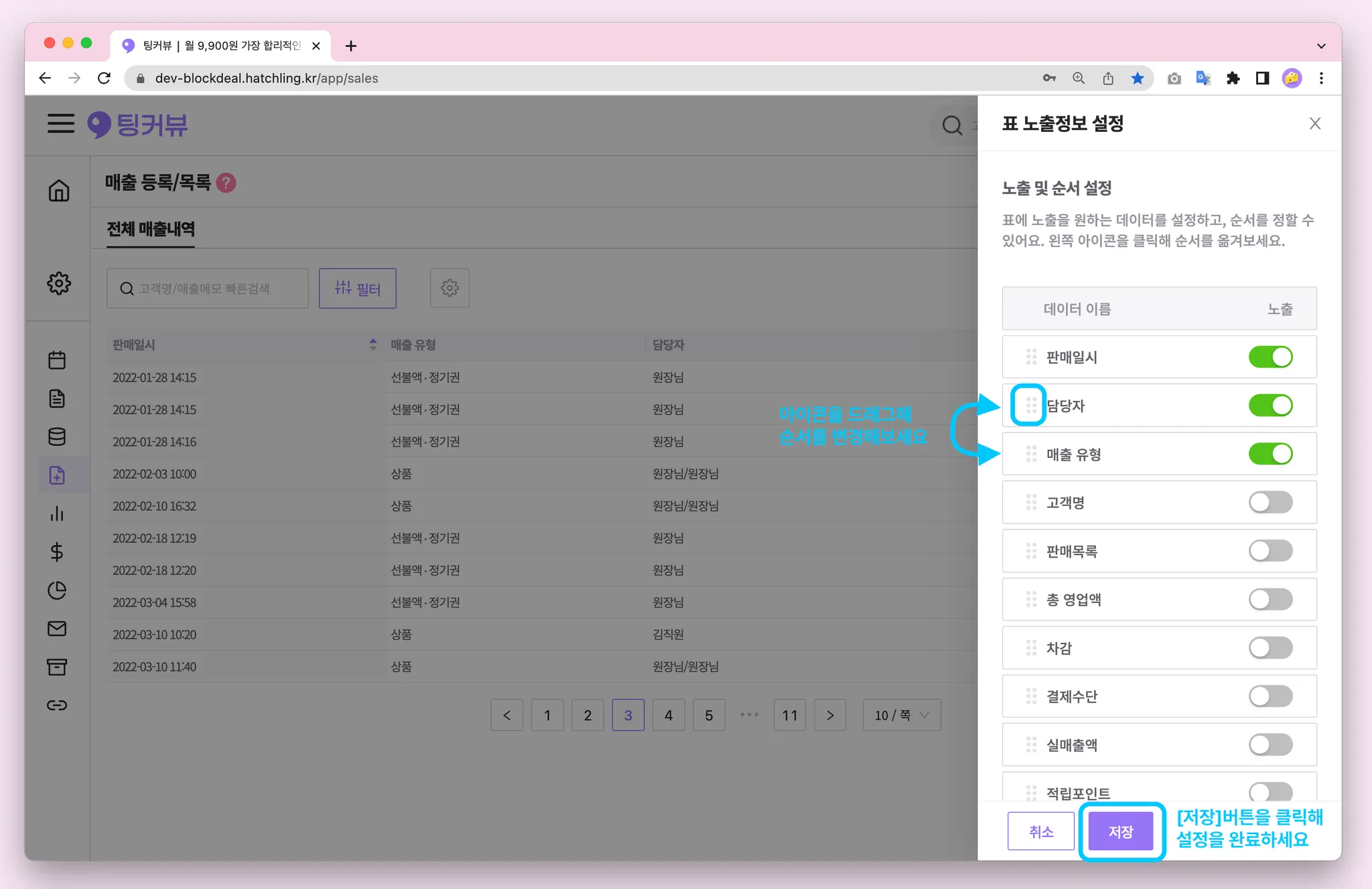 [설정] 버튼을 클릭해 표 노출정보를 설정해보세요. 데이터의 순서를 바꾸거나 보이지 않게 편집할 수 있어요!