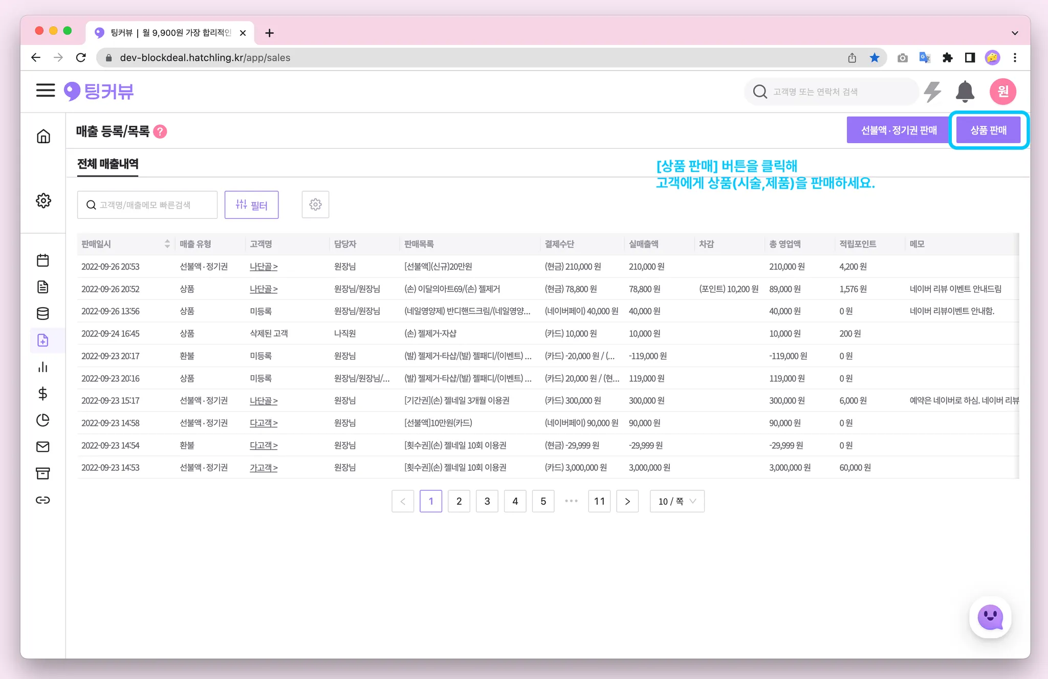 고객에게 상품(시술,제품)을 판매하고 싶다면, 우측상단의 [상품 판매]버튼을 클릭하세요!