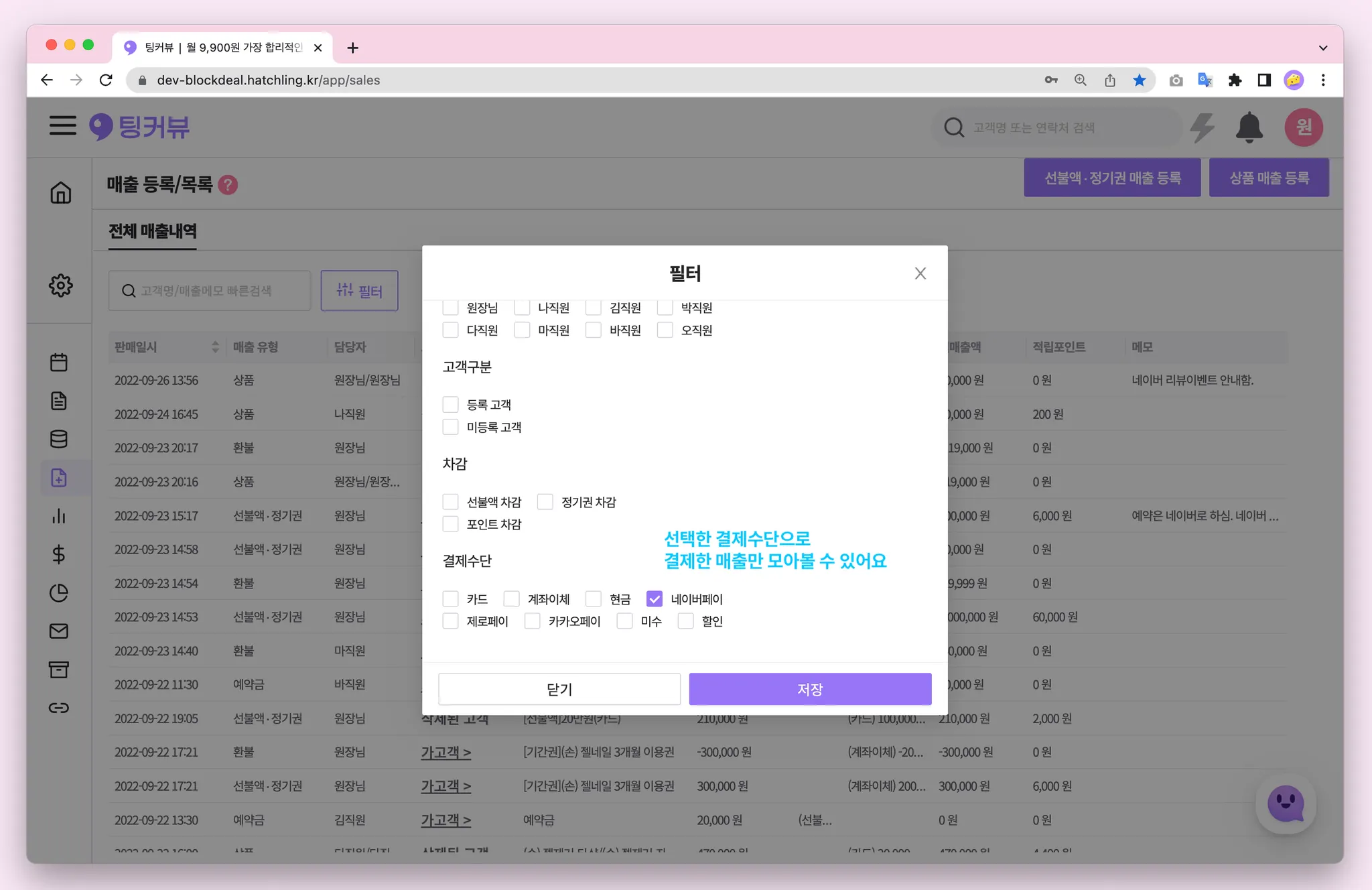 [저장]버튼을 클릭하면 선택한 결제수단이 있는 매출만 조회할 수 있어요!