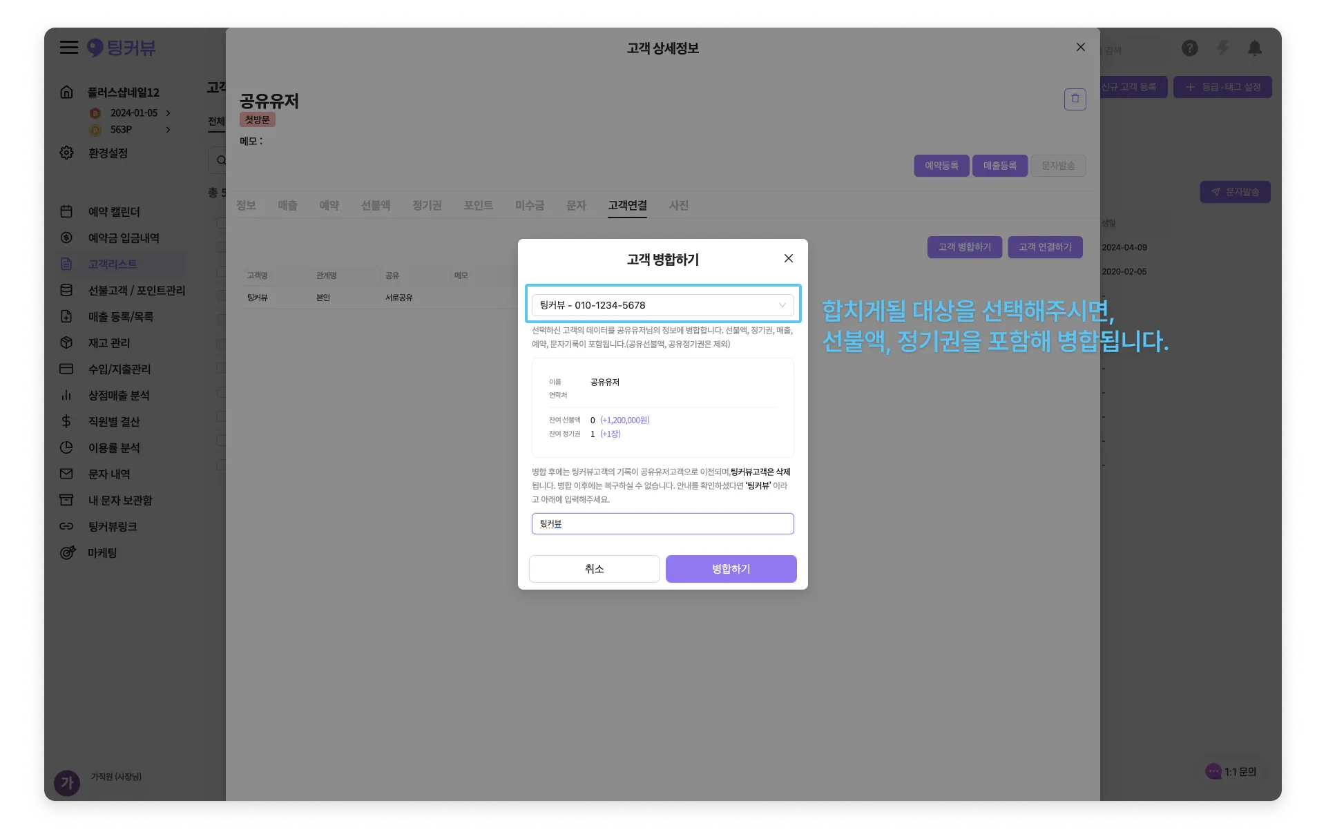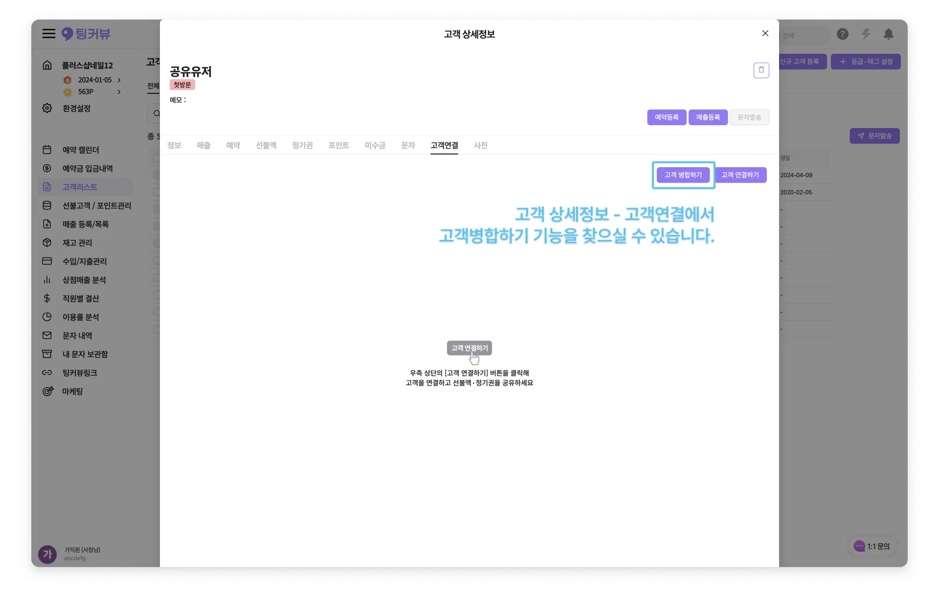 고객정보가 여러개 나뉘어졌을때, 고객합치기를 통해 ‘고객정보’, ‘잔여 선불액’, ‘잔여 정기권’을 합치실 수 있어요. 고객상세정보 → 고객연결 → 고객병합하기 에서 고객정보를 통합하여 하나의 정보로 관리하세요.