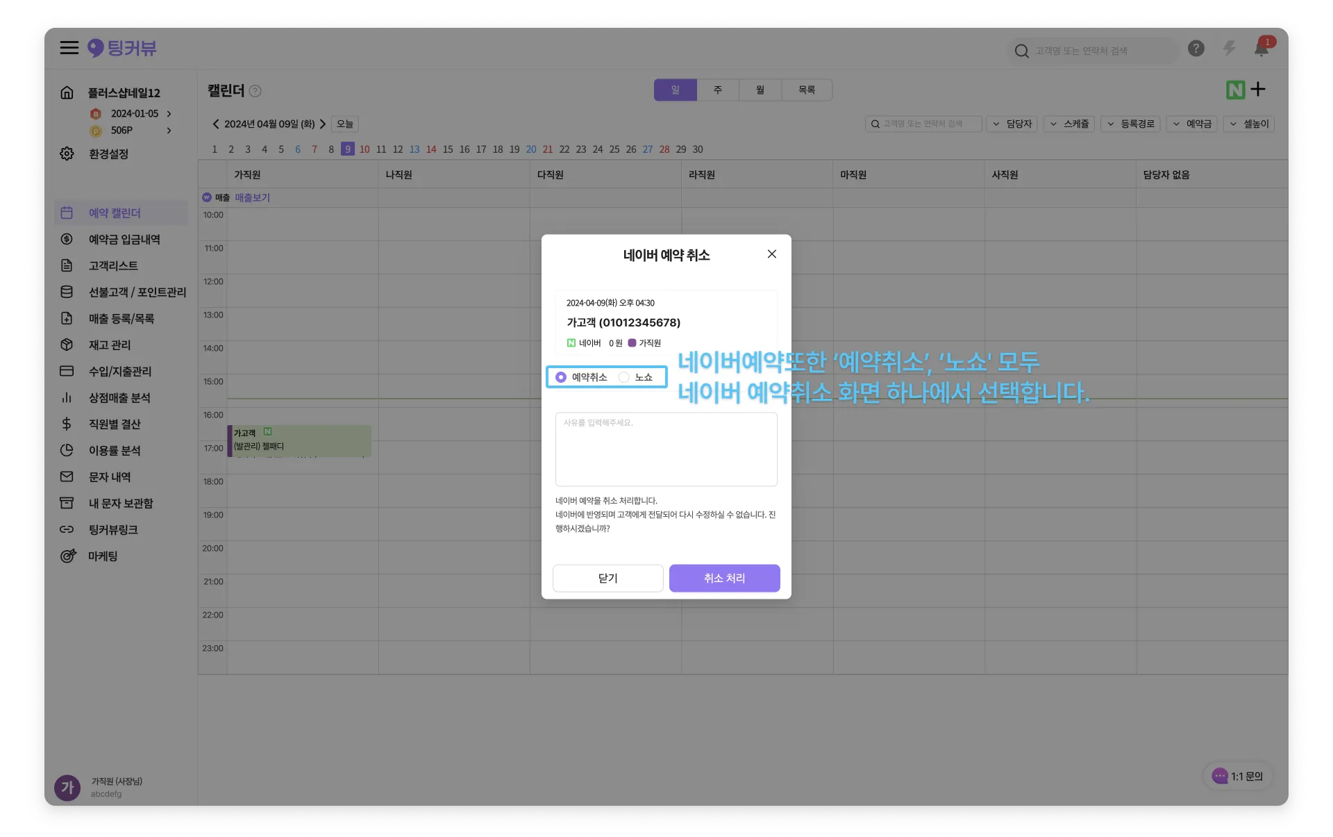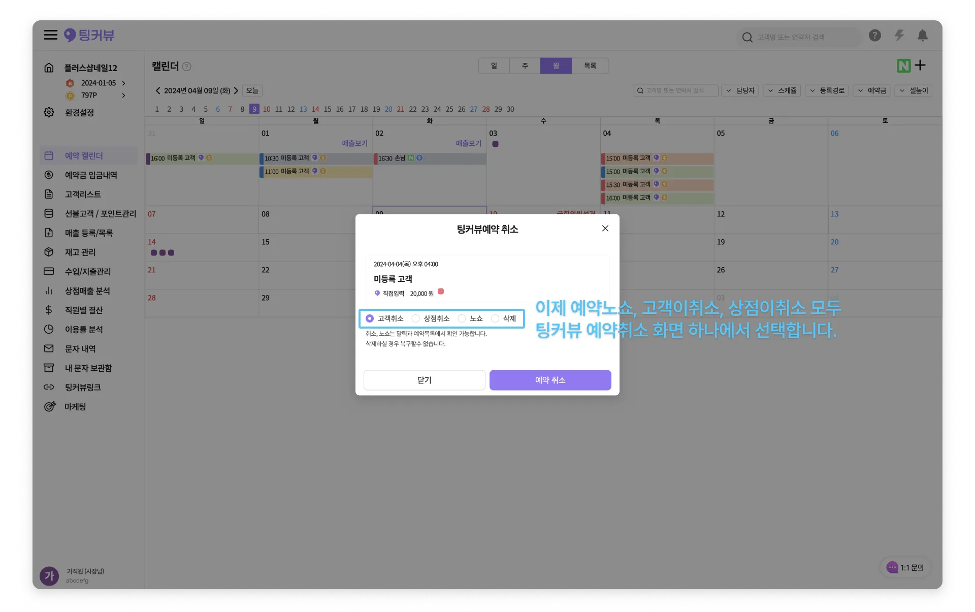이제 노쇼도 예약취소 목록에 포함됩니다. 고객이취소, 상점이취소, 예약노쇼 어떤 취소유형이던지 예약취소 후 예약 취소유형을 선택해주세요.