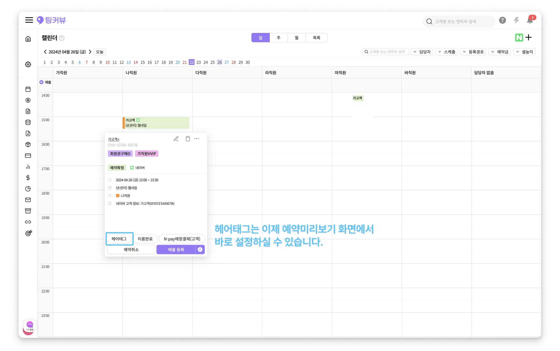 매출등록 후 이용완료를 해야하는게 불편하셨나요? 이제는 네이버예약 관련 기능들은 따로 관리하실 수 있어요.