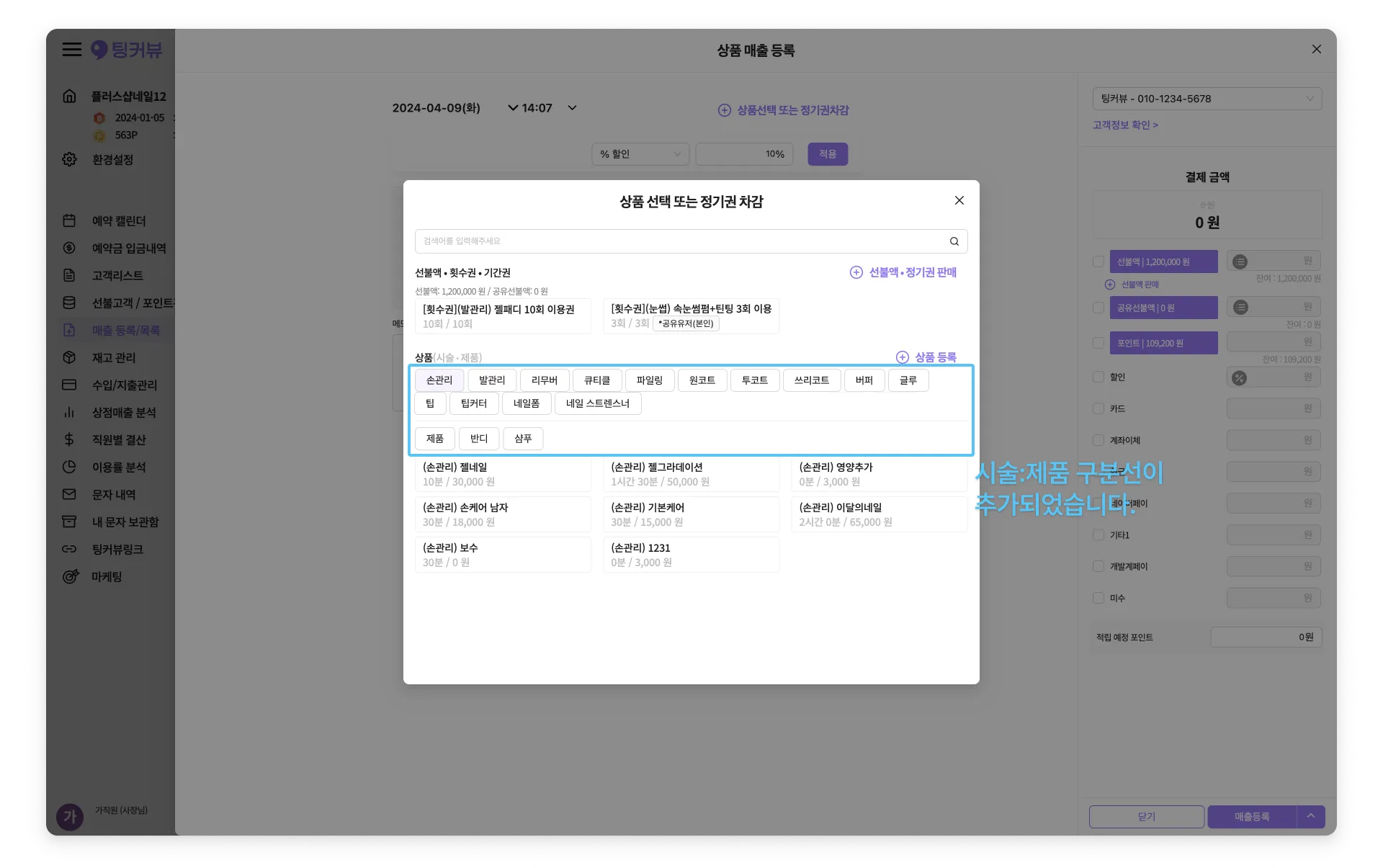 이제 ‘상품선택 또는 정기권 차감’화면에서 ‘시술’과 ‘제품’은 구분선을 통해 구분하실수 있습니다.