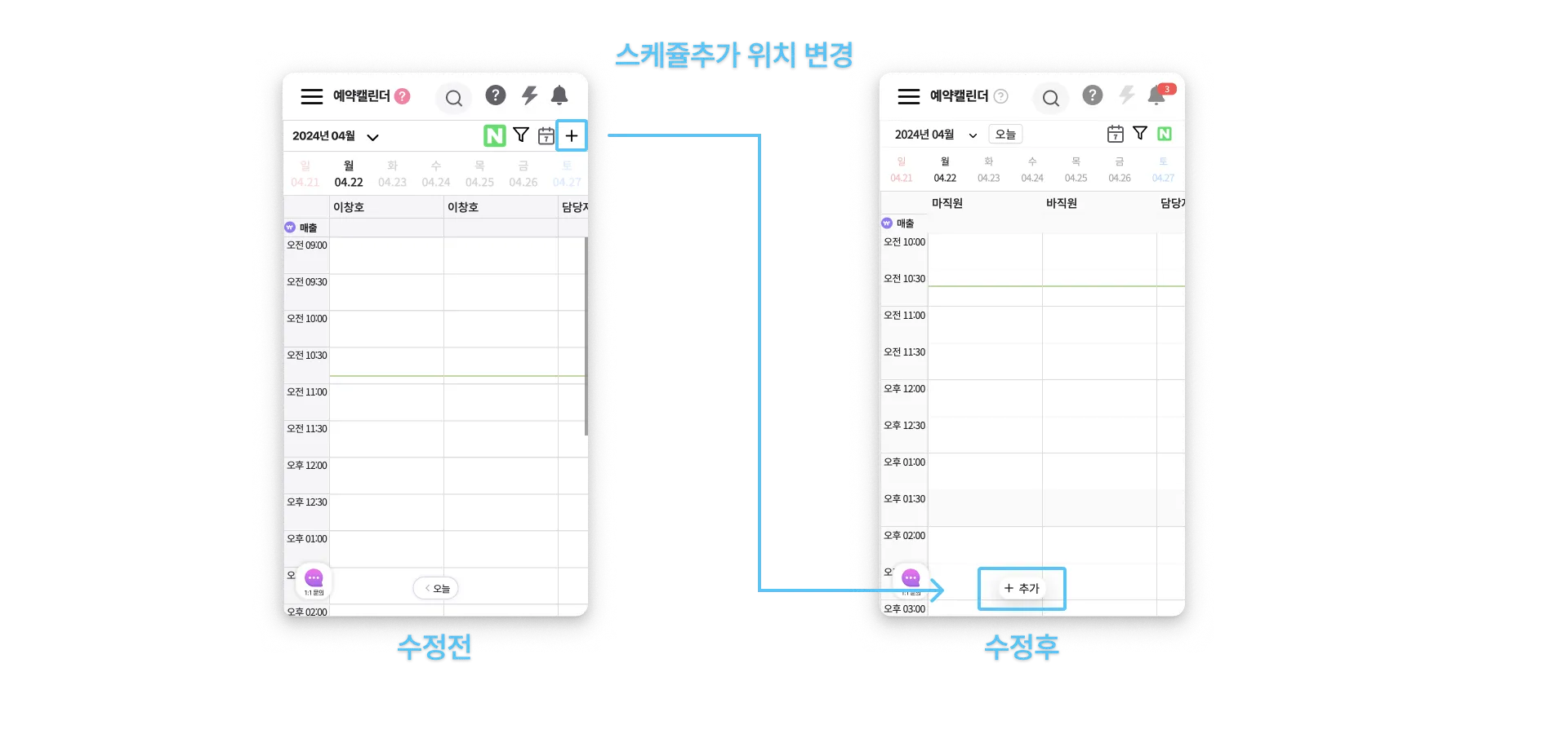모바일 일정생성 아이콘의 위치가 변경되었습니다.