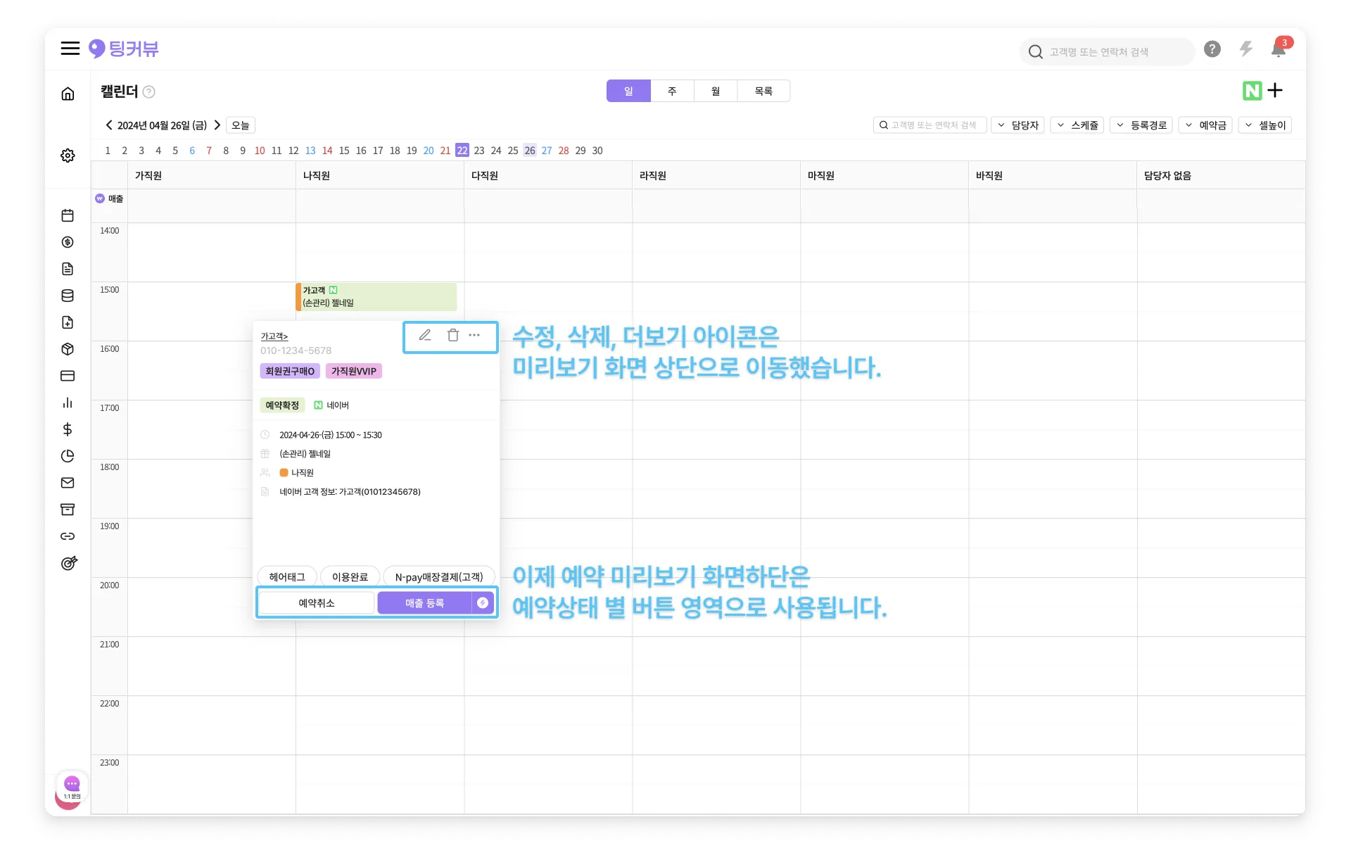 미리보기 화면 하단은 예약, 매출관련 버튼영역으로 사용됩니다.