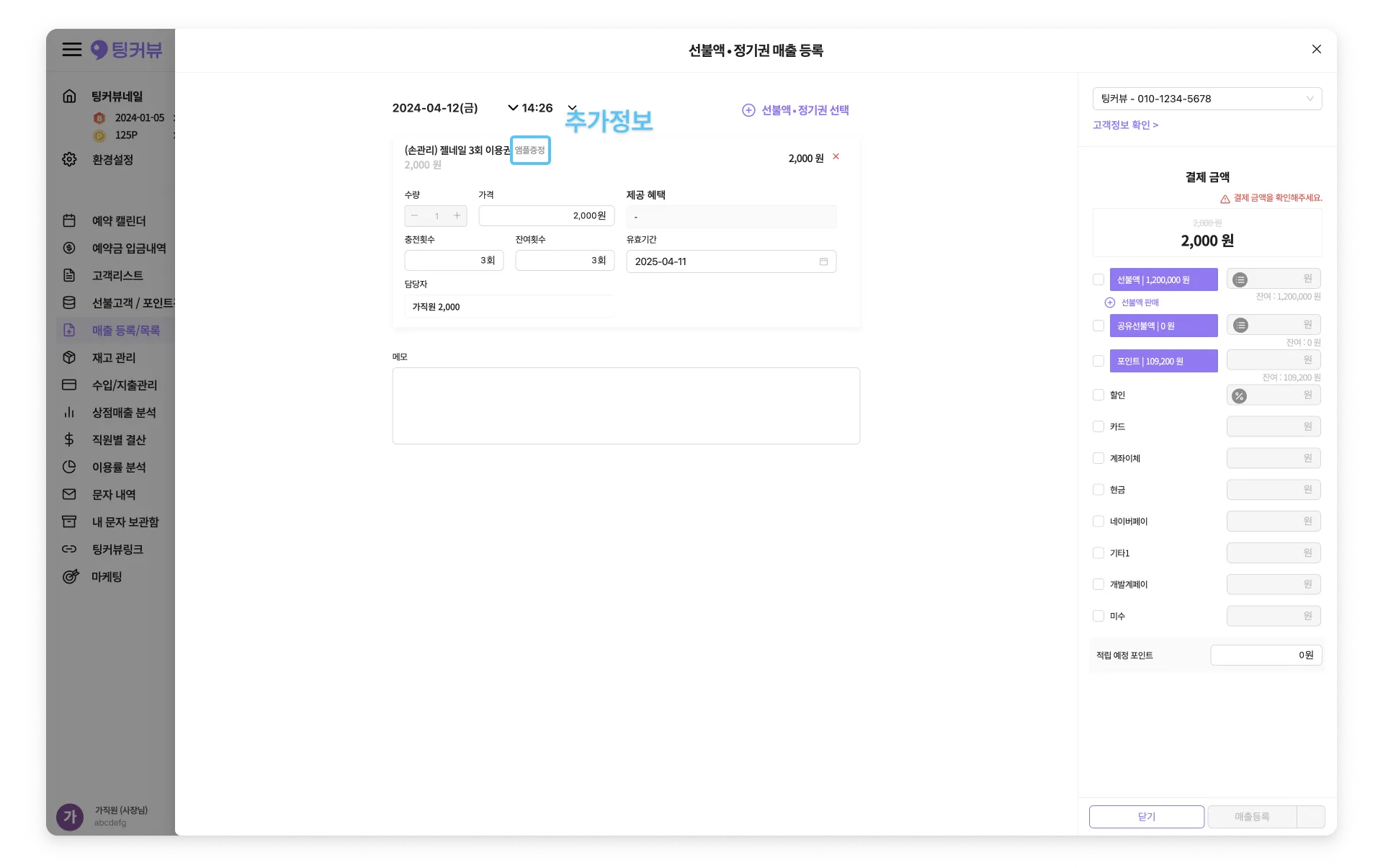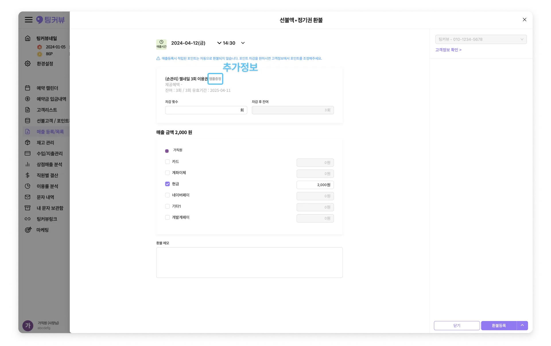 선불액∙정기권의 추가정보가 ‘선불액∙정기권 매출 등록화면’, ‘선불액∙정기권 상품선택’, ‘선불액∙정기권 환불’화면에도 표시됩니다.