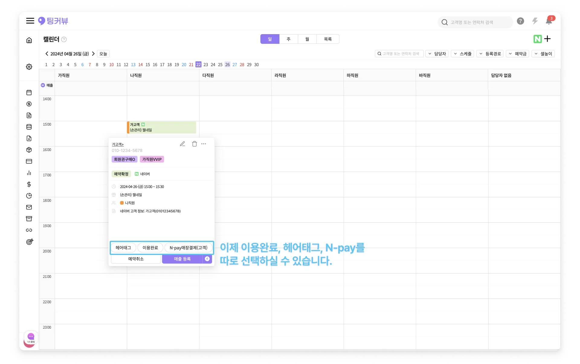 N-pay 현장결제, 헤어태그, 이용완료 처리 등 네이버 기능 업무들을 종합했습니다.