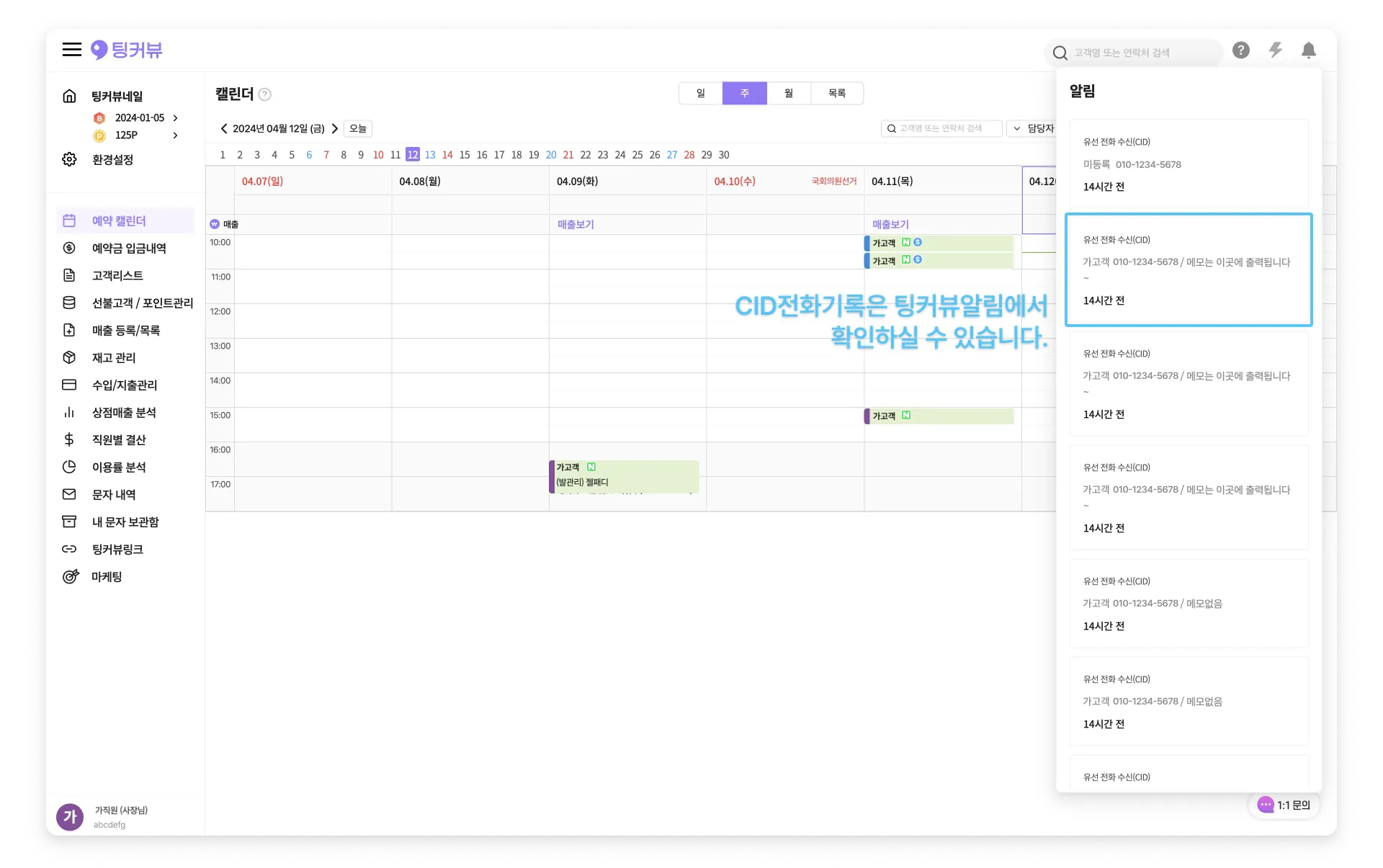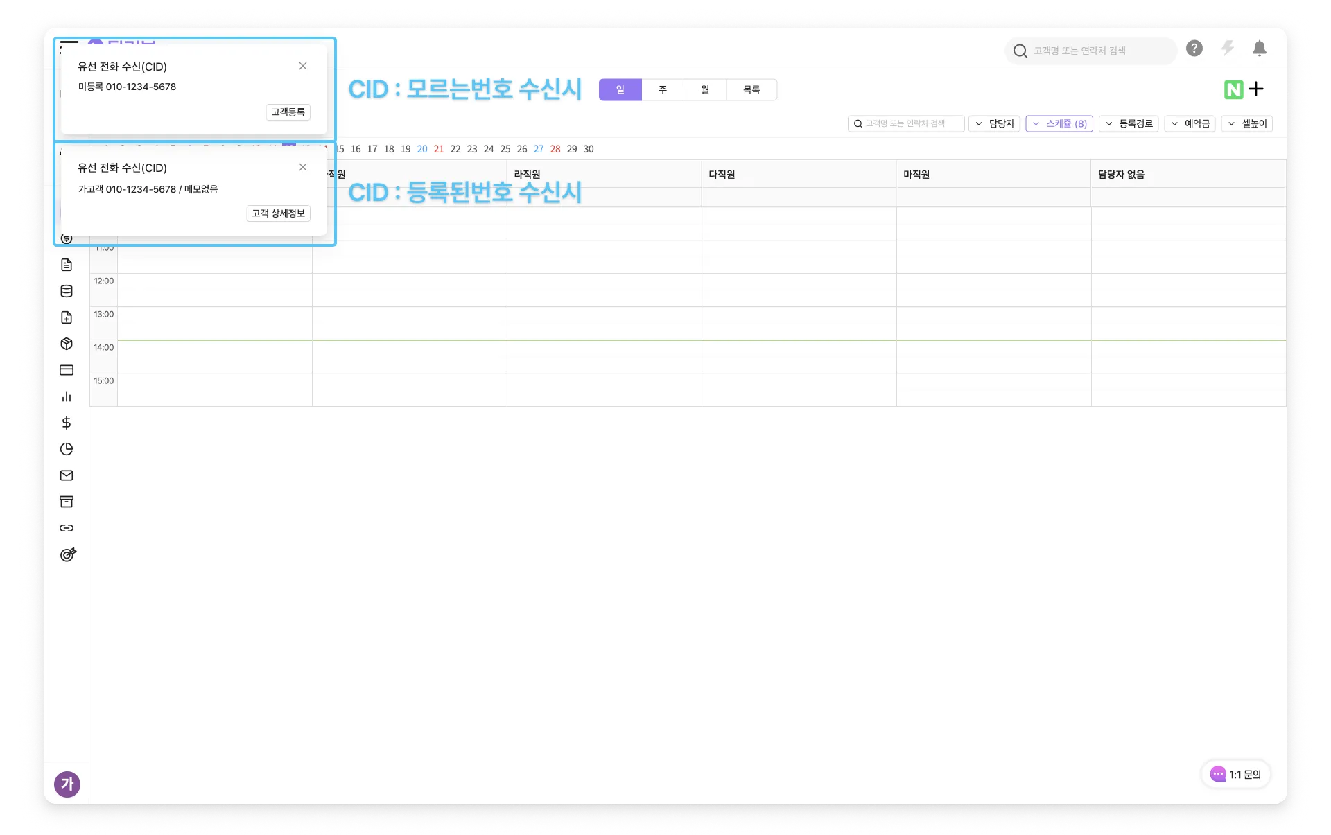CID전화는 알림아이콘을 통해 수신 기록들을 확인하실 수 있습니다. 수신기록에는 고객번호, 고객메모등의 정보가 포함됩니다.