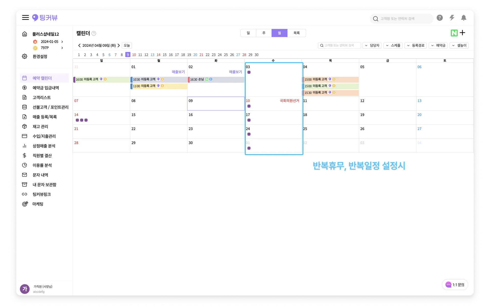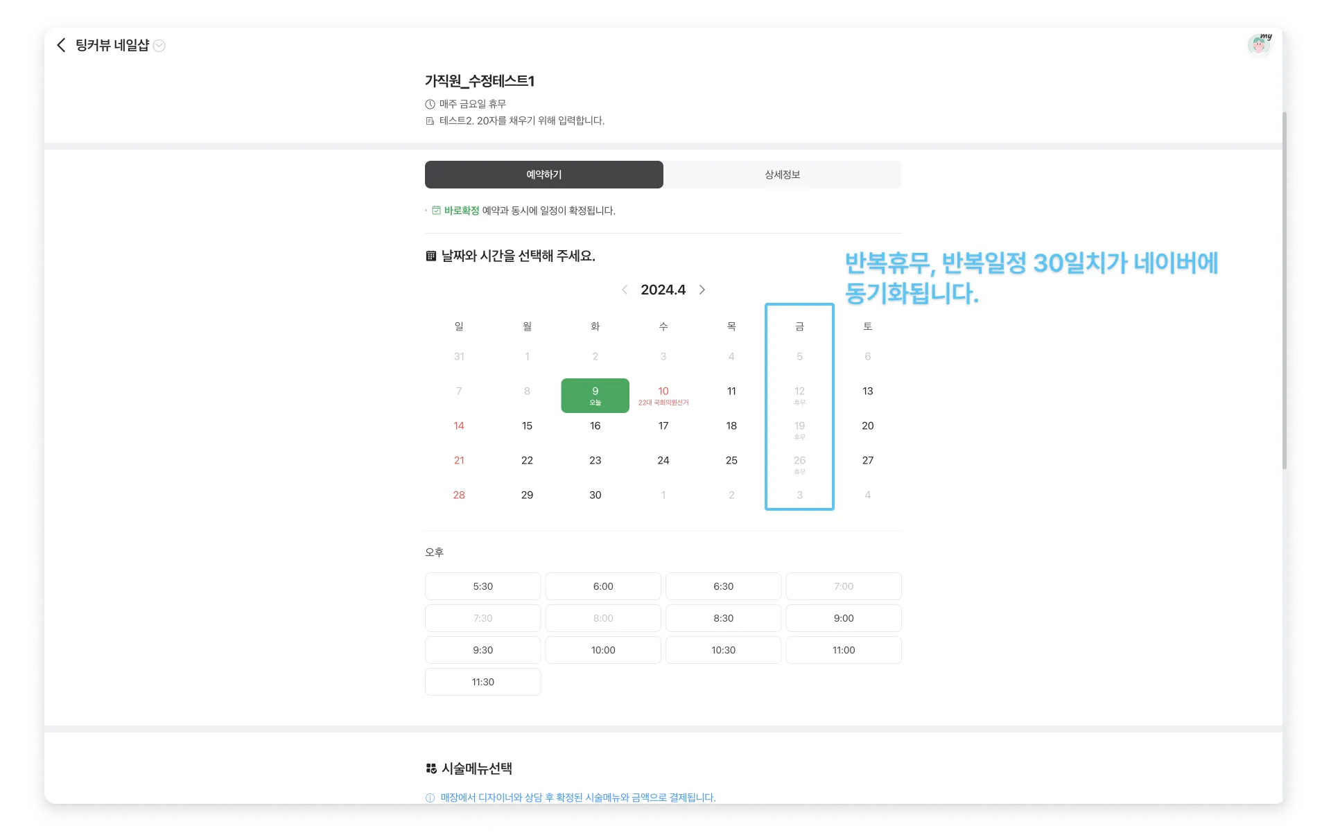 네이버예약에 팅커뷰에서 설정한 ‘반복 휴무’, ‘반복 일정’스케줄이 30일치 씩 반영됩니다.