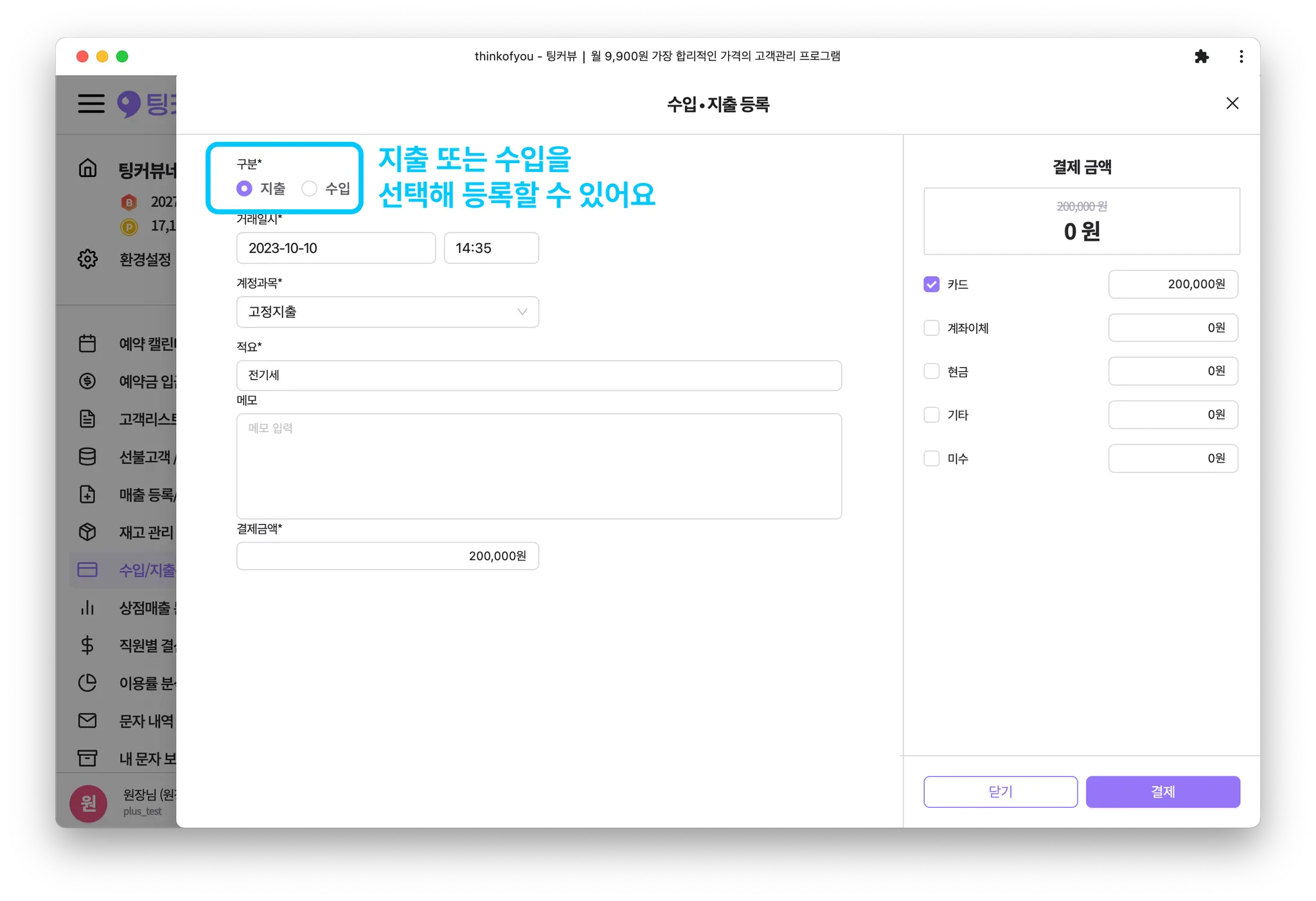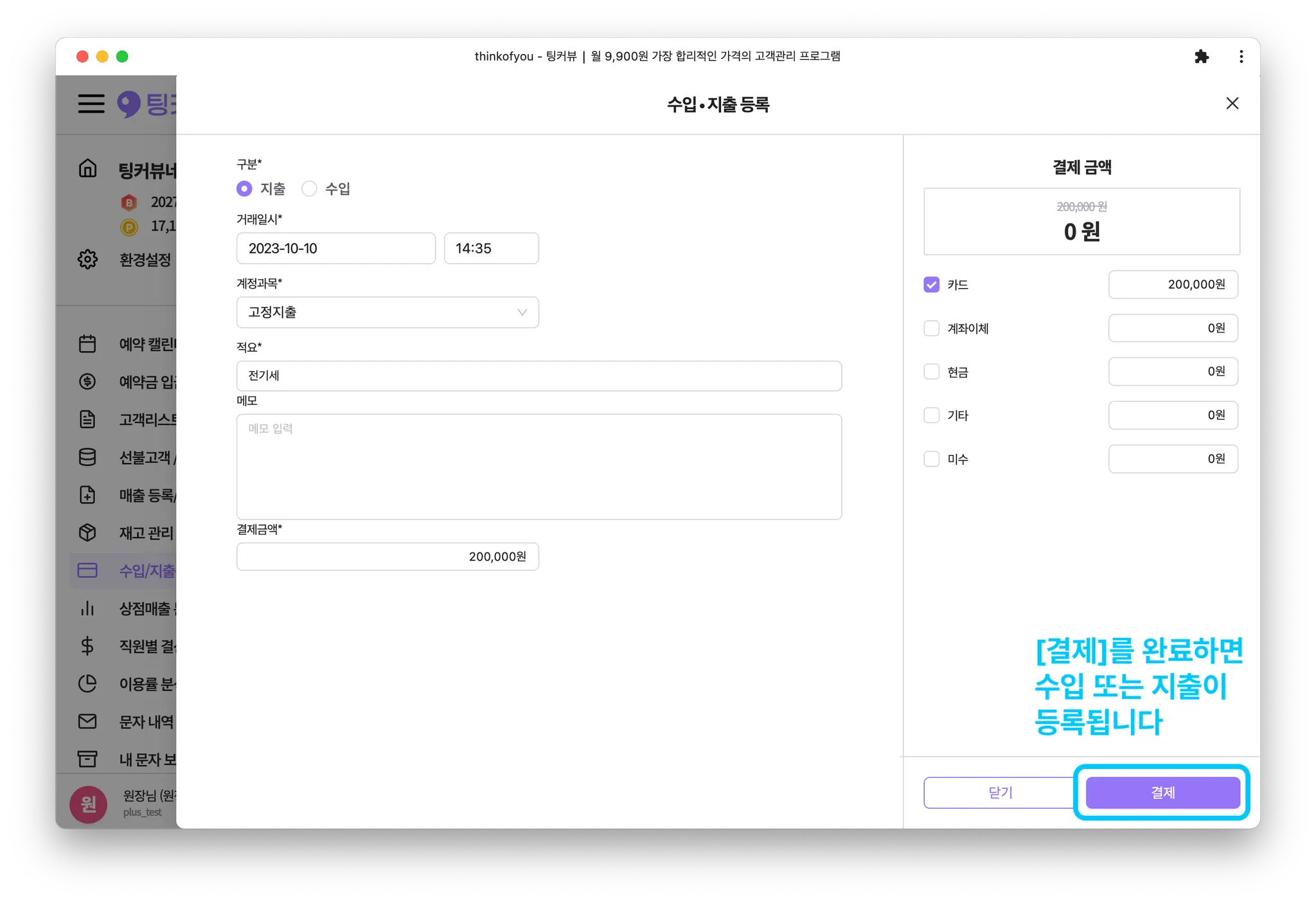 [결제]버튼을 클릭해 수입 또는 지출 등록을 완료하세요.