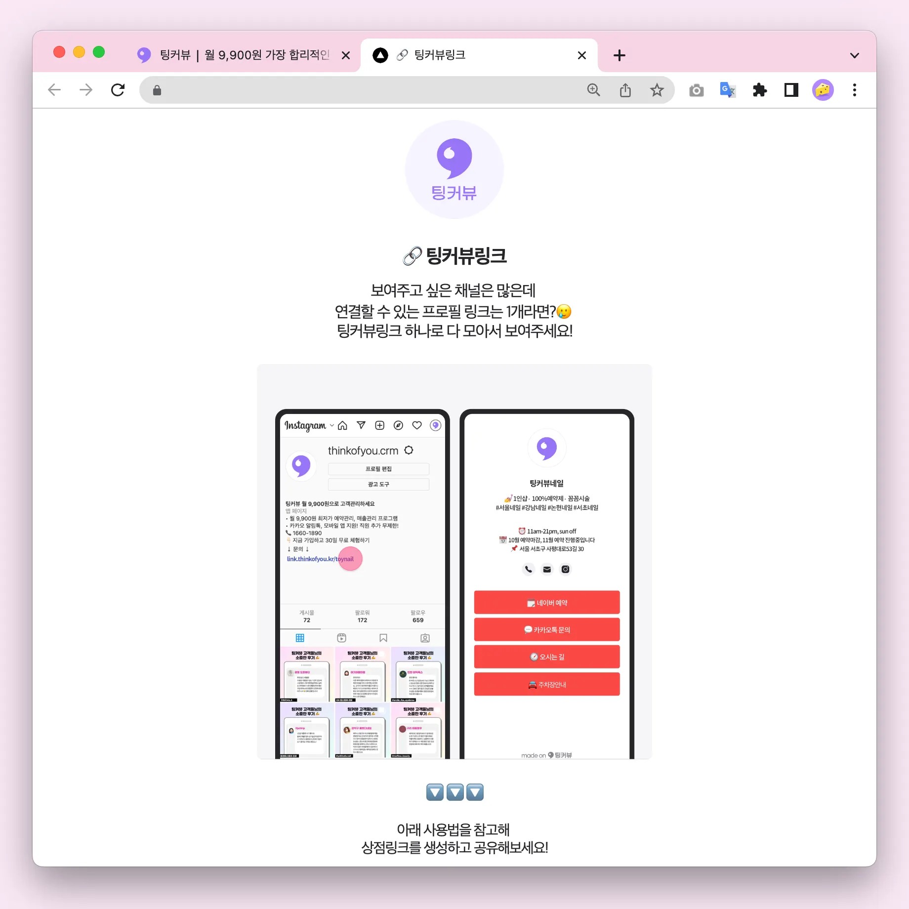 팅커뷰링크 기능을 이용해 상점의 홈페이지를 생성하고 공유해보세요! 인스타처럼 프로필링크를 1개만 등록할 수 있을 때 팅커뷰링크를 이용하면 여러개의 채널을 모두 연결할 수 있어요