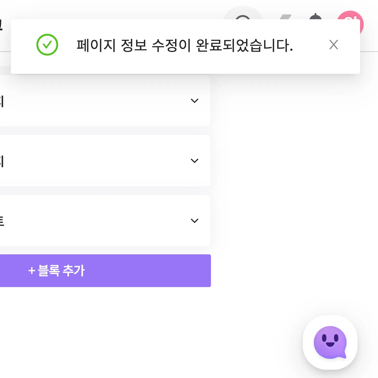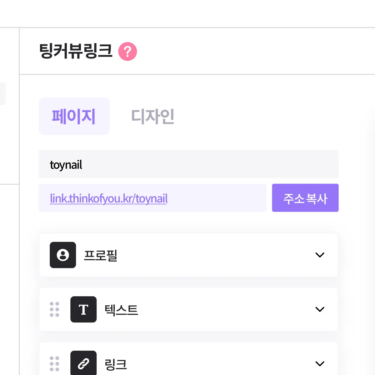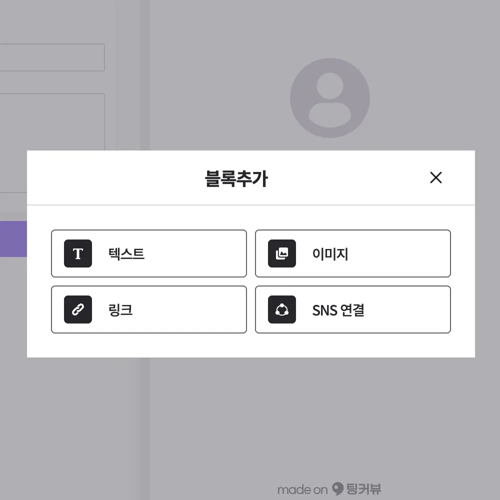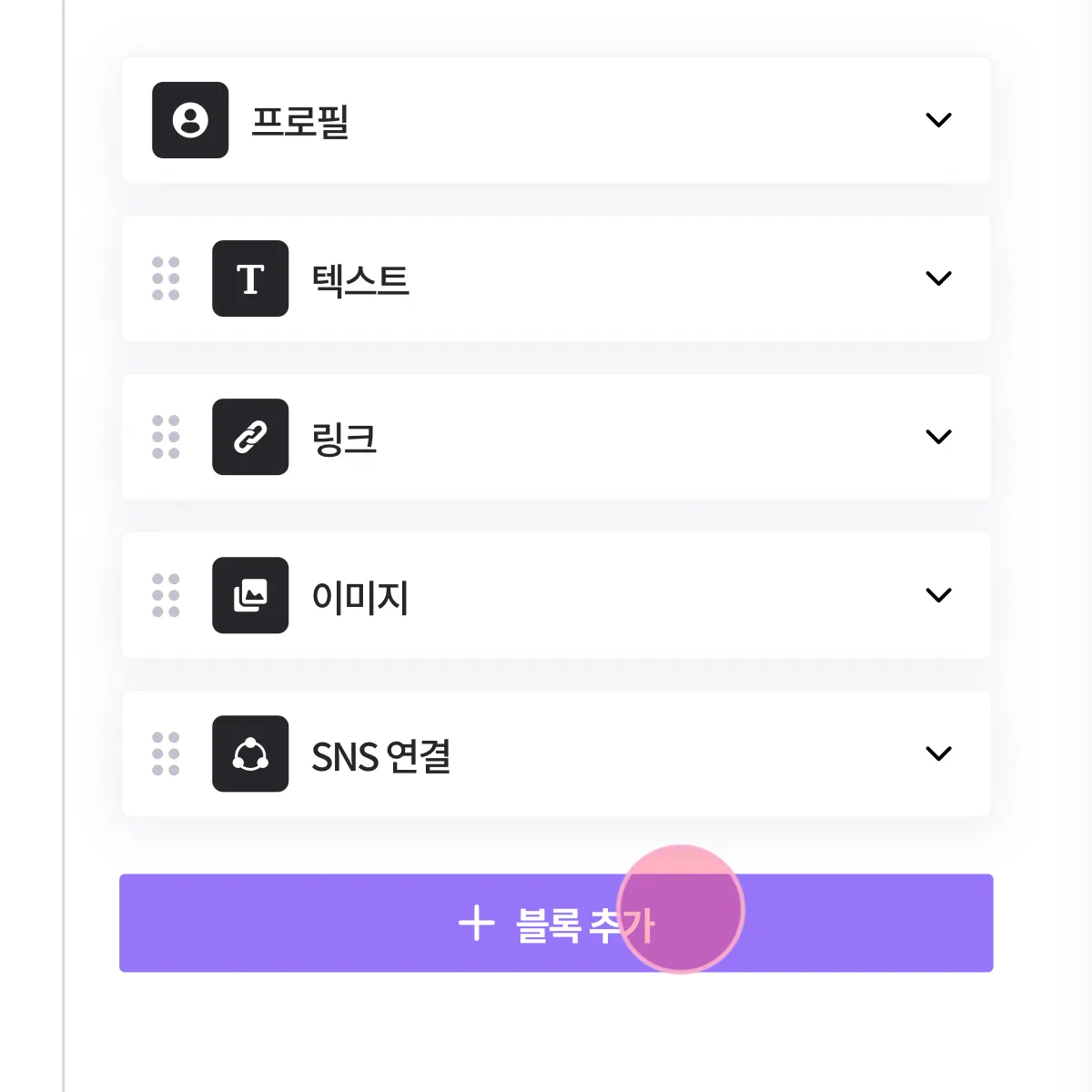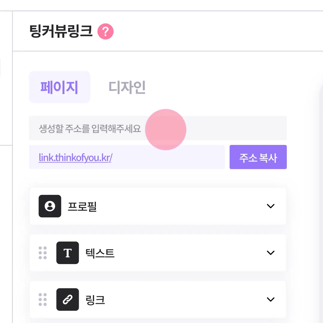 [ 페이지 ] 탭에서 프로필을 수정하거나 블록을 추가해 텍스트, 이미지, 링크, SNS채널을 등록할 수 있어요!