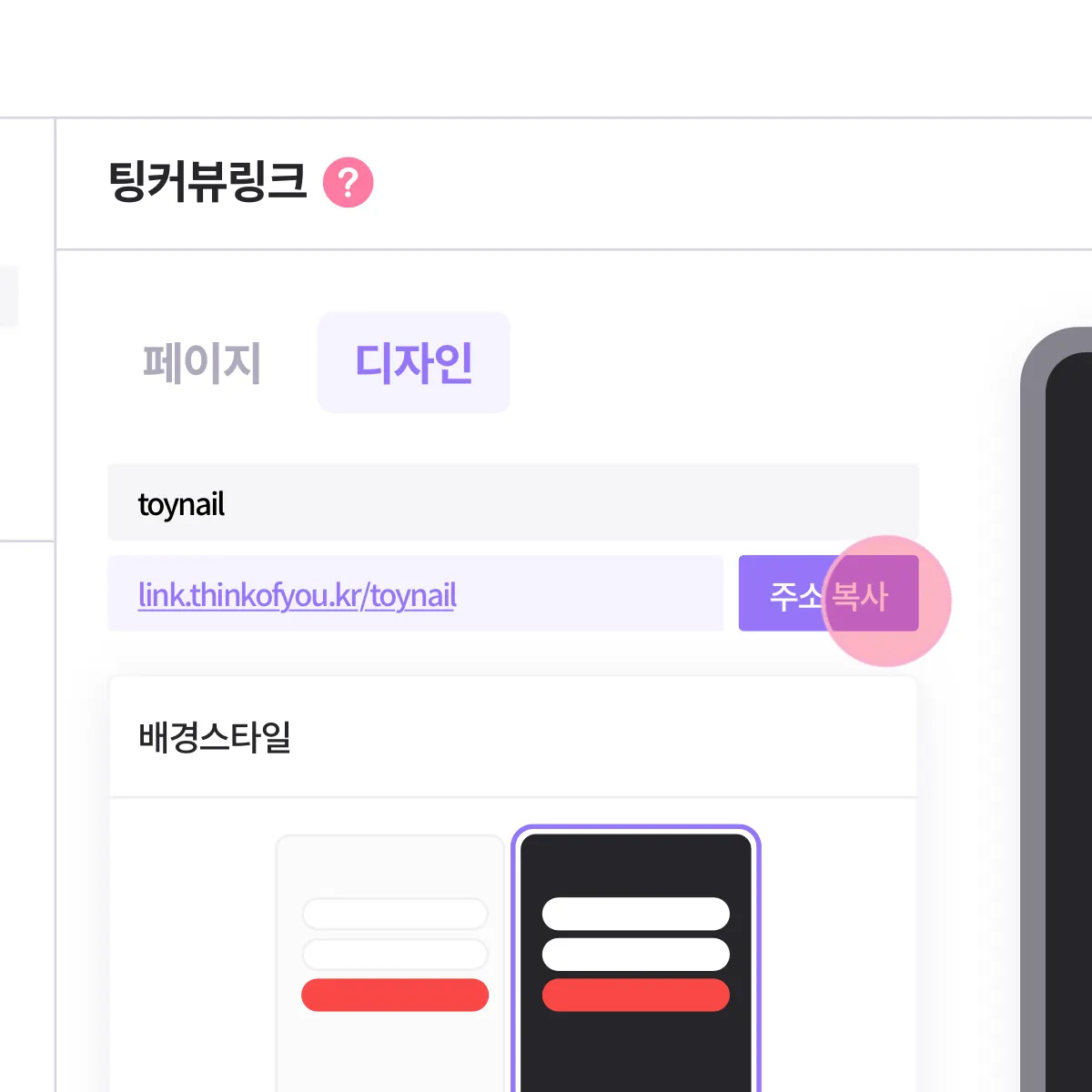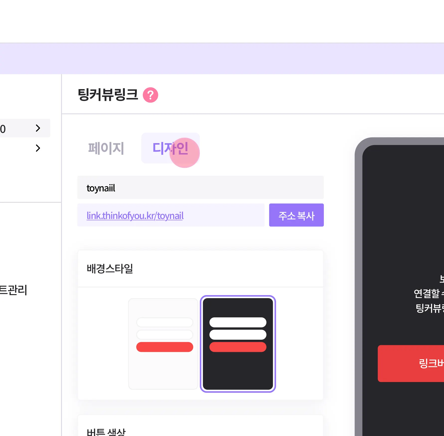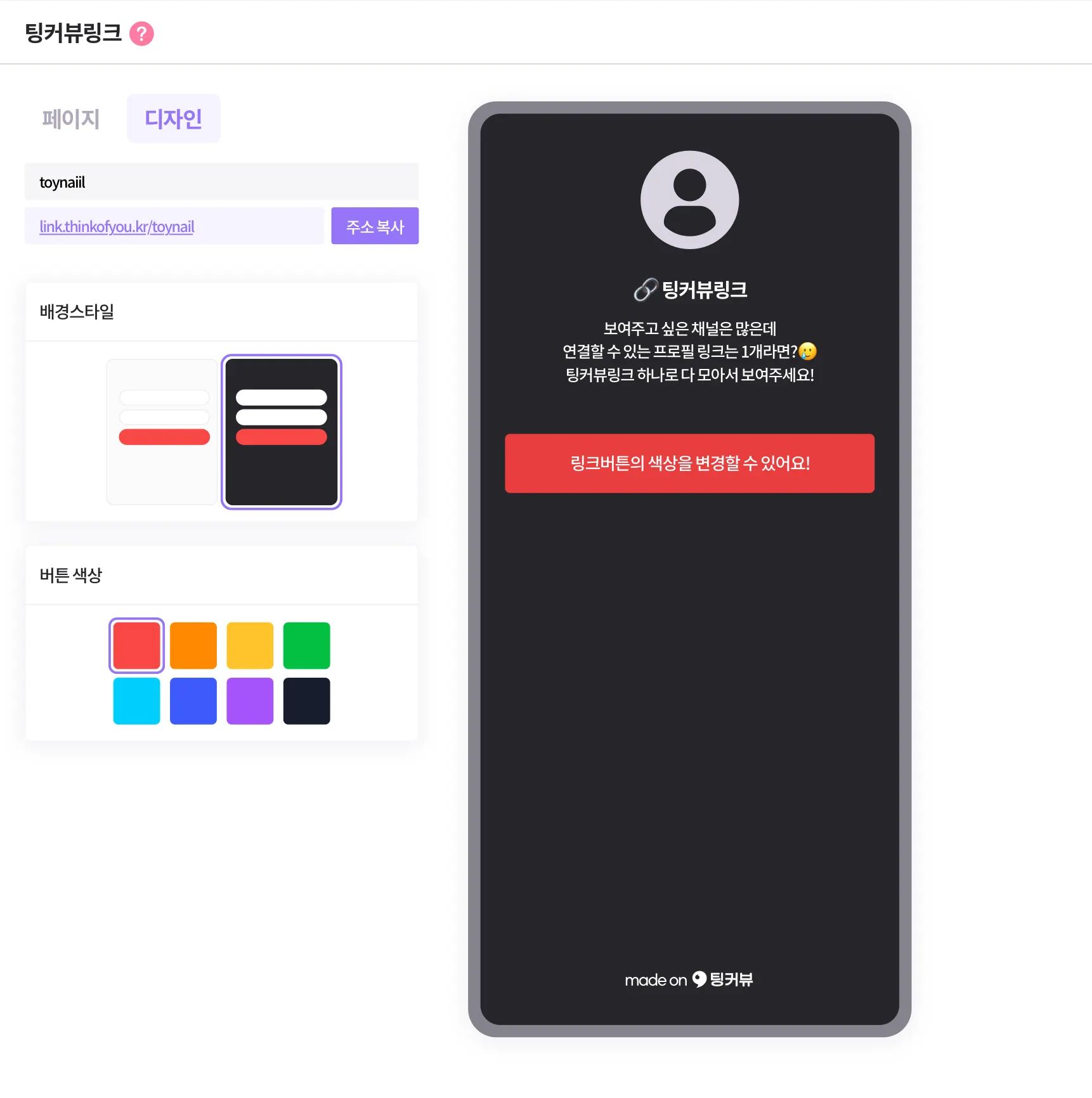 배경컬러, 버튼컬러를 변경해 페이지를 꾸며보세요! 상단의 [ 디자인 ] 탭에서 디자인을 변경할 수 있어요!