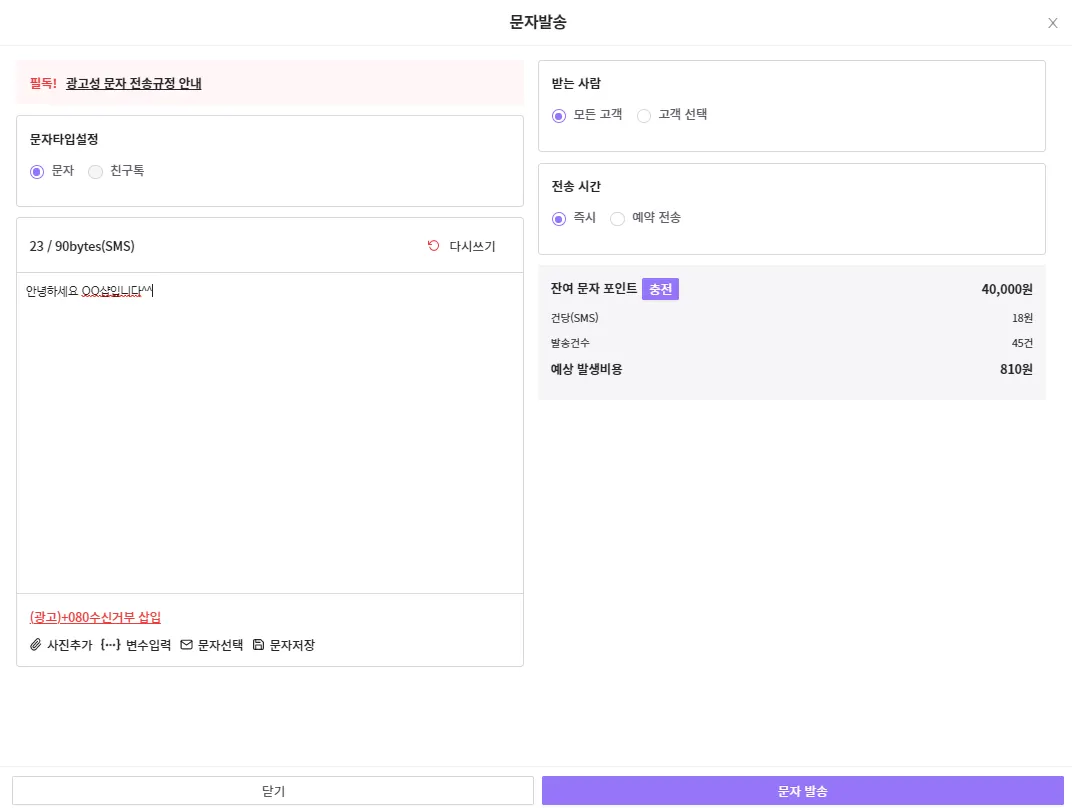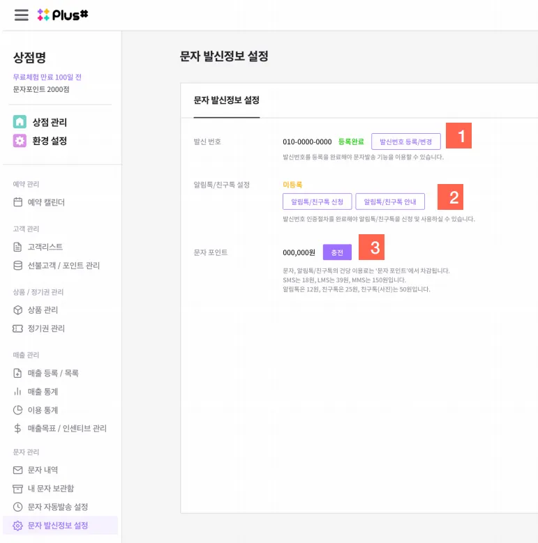문자 발송을 하기 위해서는 발신번호를 등록하고 문자 포인트를 충전해야 해요. 이미 완료하셨다면 다음 단계로 넘어가도 되세요.