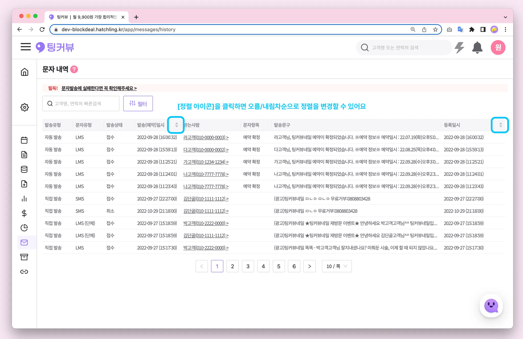 발송(예약)일시, 등록일시는 우측의 정렬아이콘을 클릭해 오름/내림차순으로 정렬할 수 있어요!