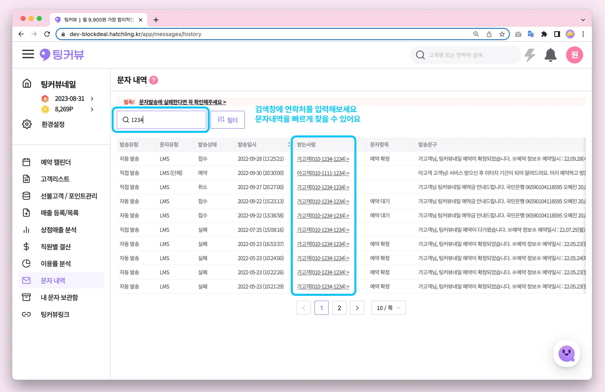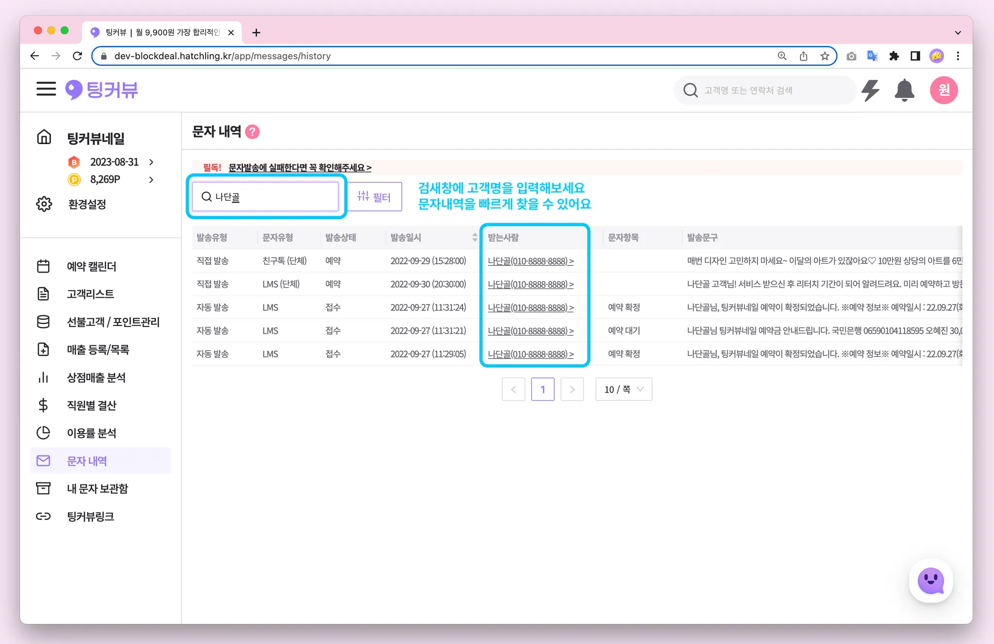 검색창에 고객명 또는 연락처를 검색해보세요! 확인하고자 하는 문자내역을 빠르게 검색할 수 있어요