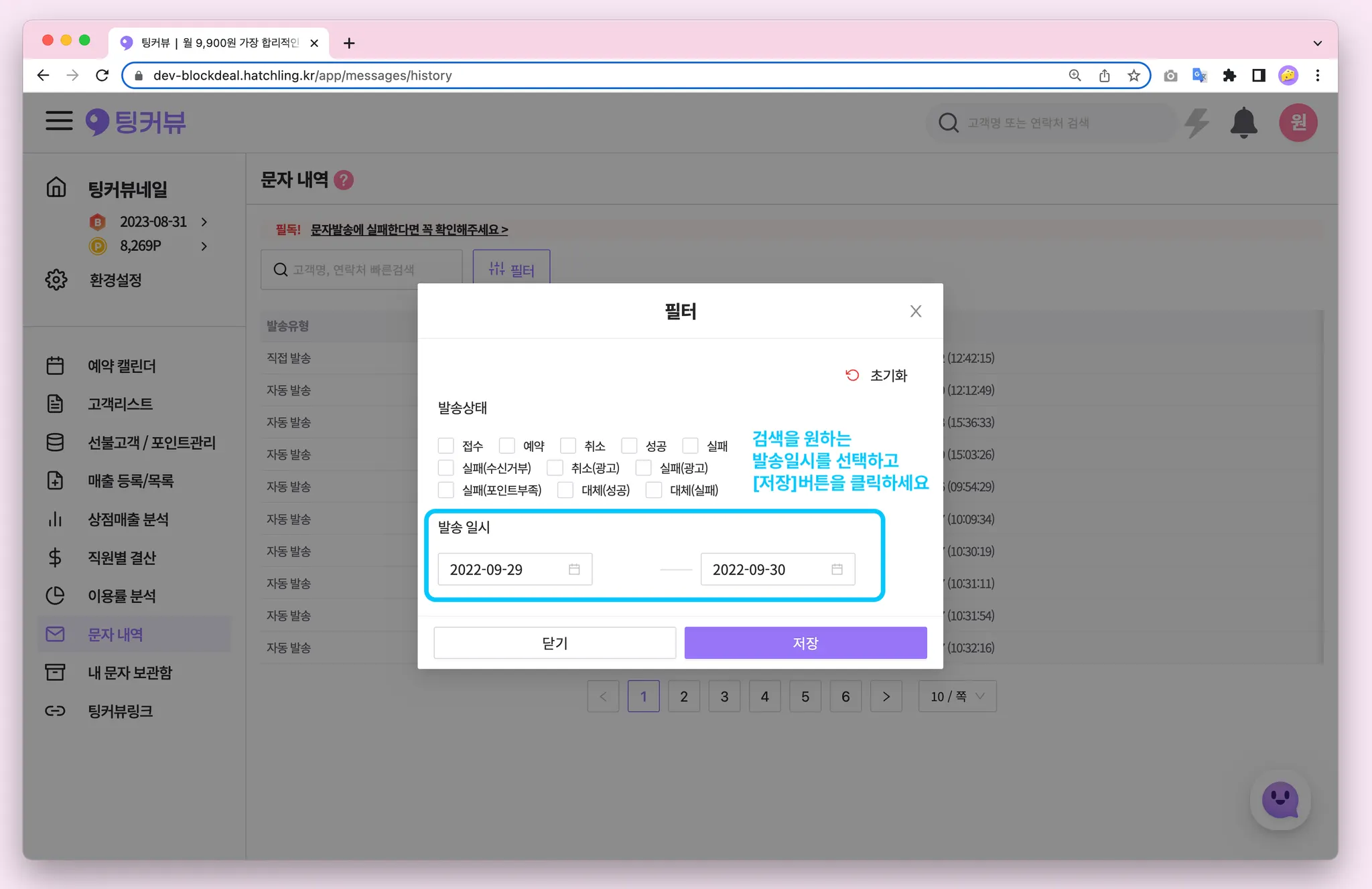 발송일시 필터에서 원하는 시작일과 종료일을 선택하세요.