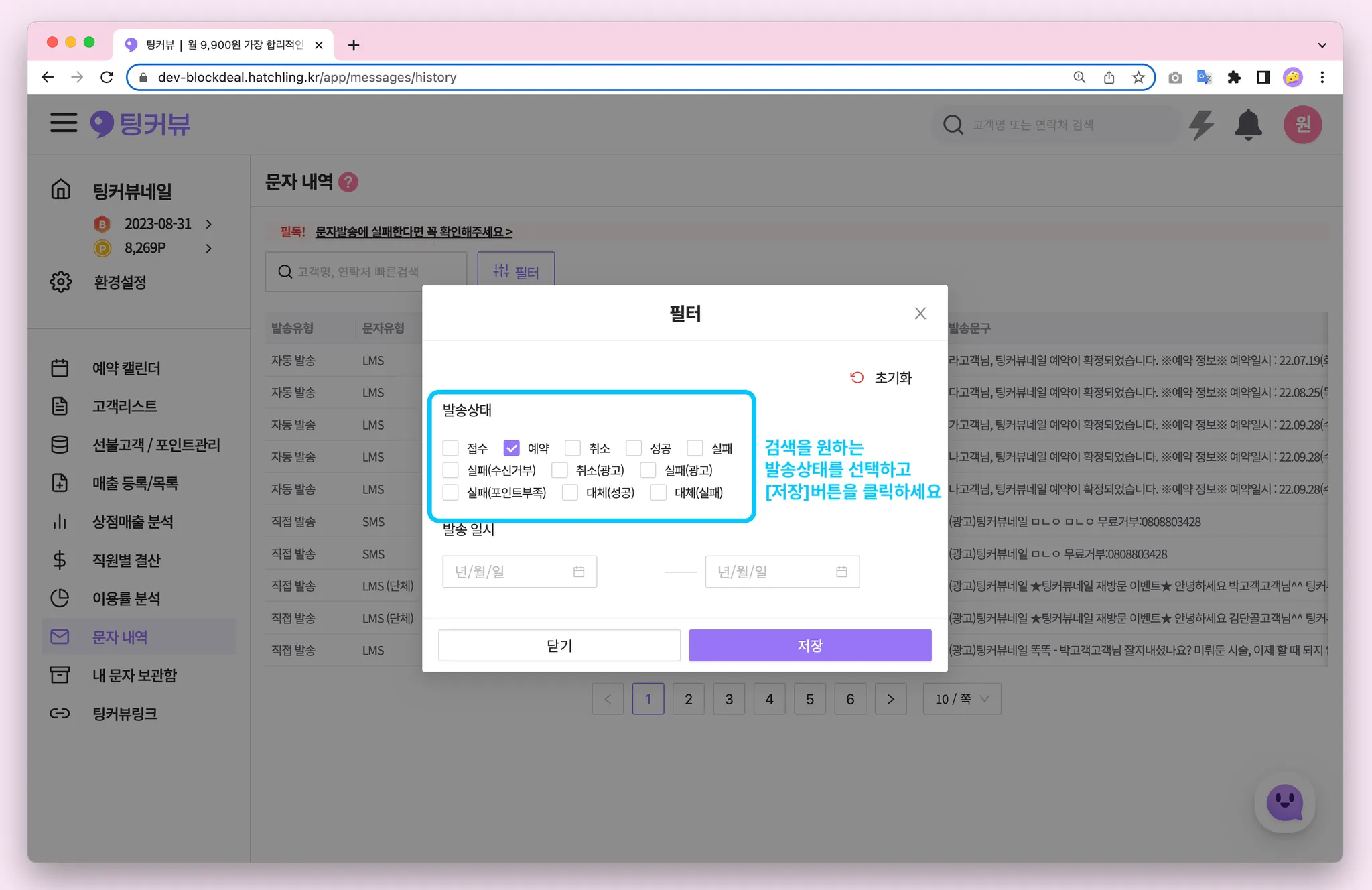 [저장]버튼을 클릭하면 원하는 발송상태의 문자만 조회할 수 있어요!