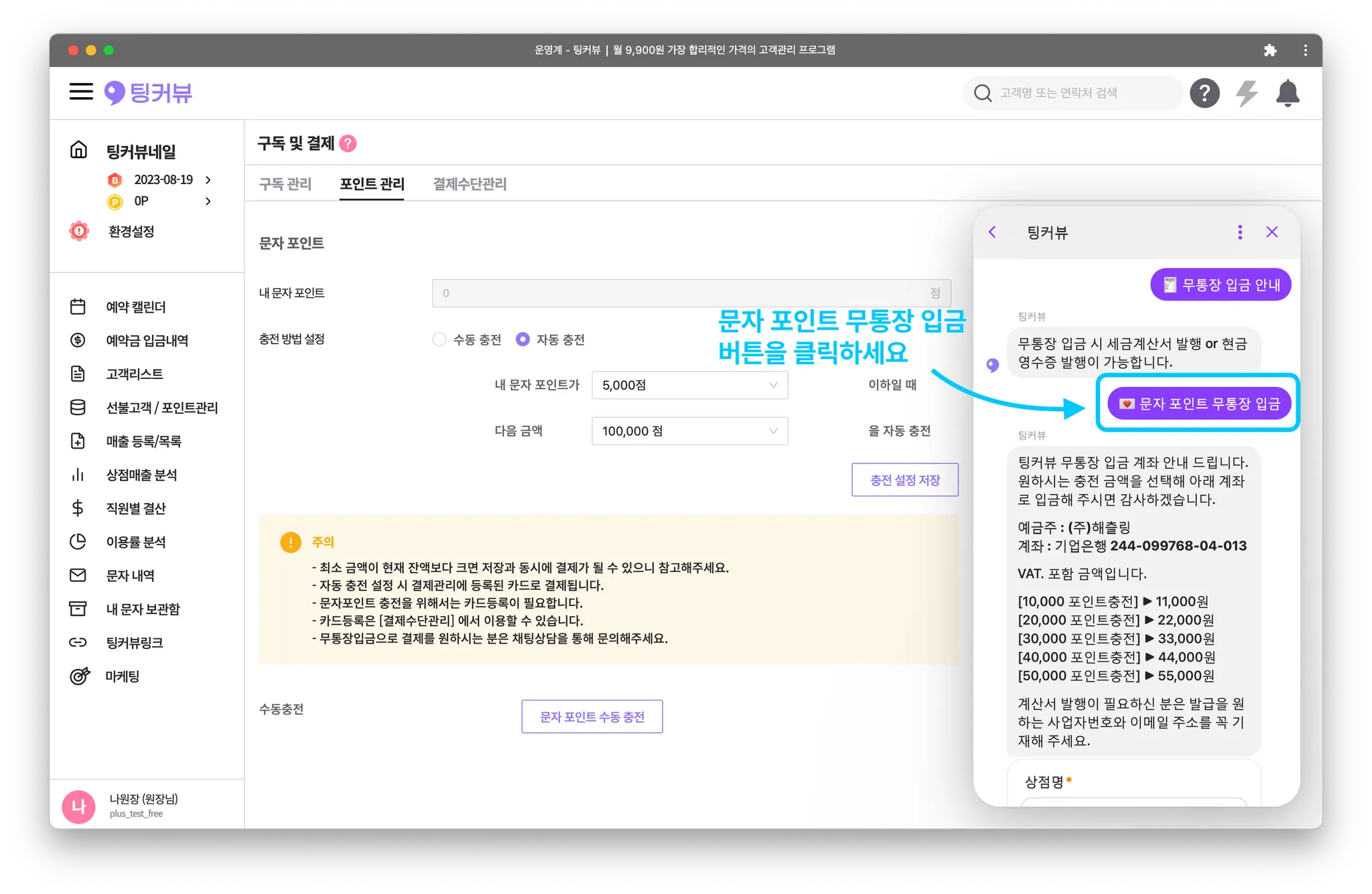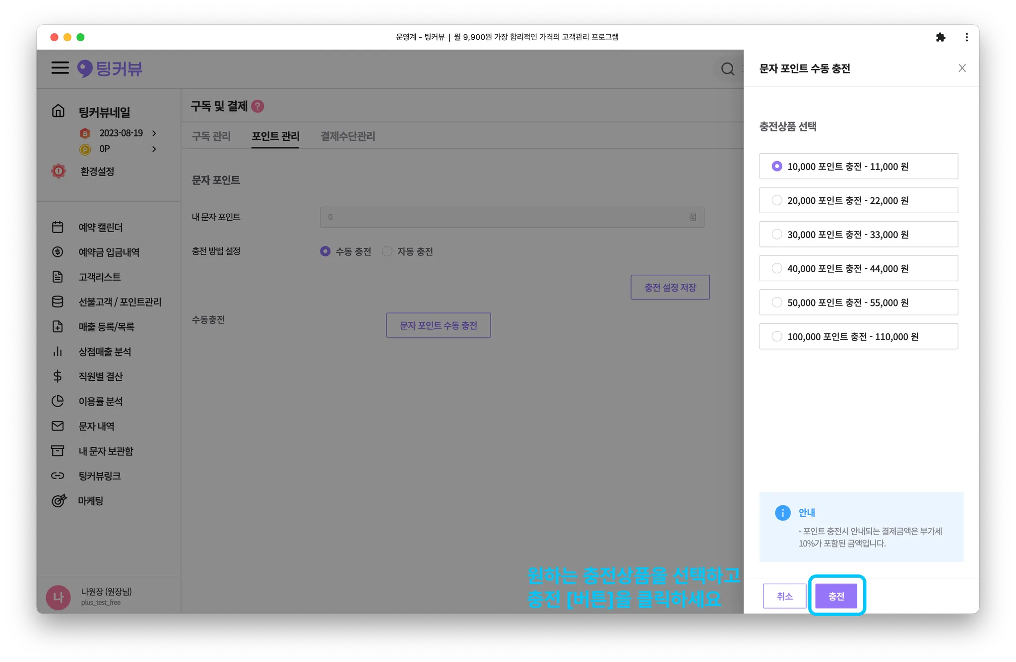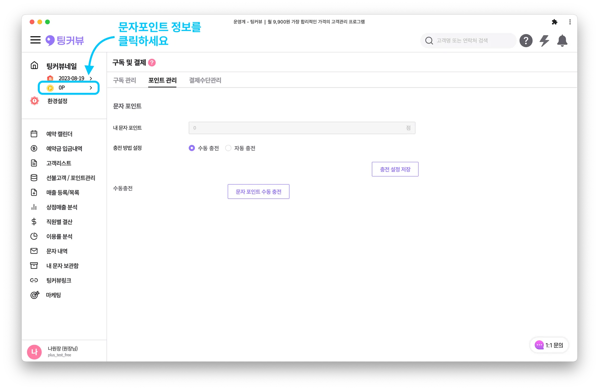 문자발송기능을 사용하려면 문자포인트를 충전해야겠죠? 필요할 때마다 원하는 만큼 충전해서 사용하는 수동충전방법을 알려드릴게요!