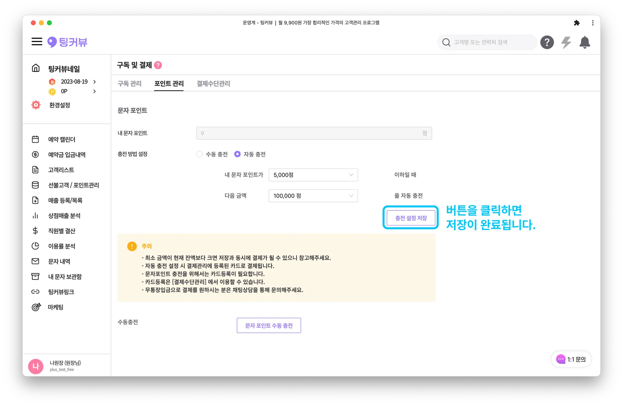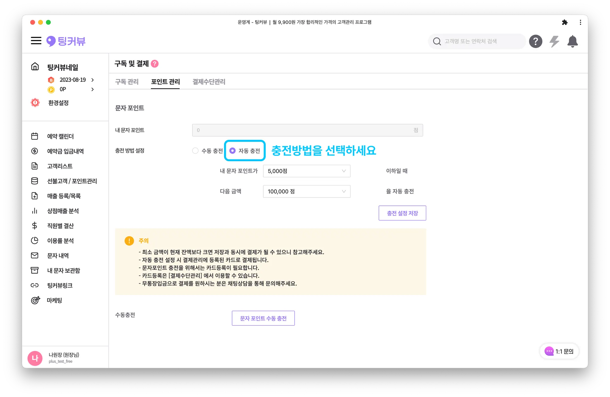 필요할 때마다 수동충전하거나 자동으로 충전되도록 설정해보세요! 포인트가 부족해 문자발송이 취소되는 불편함을 덜 수 있어요
