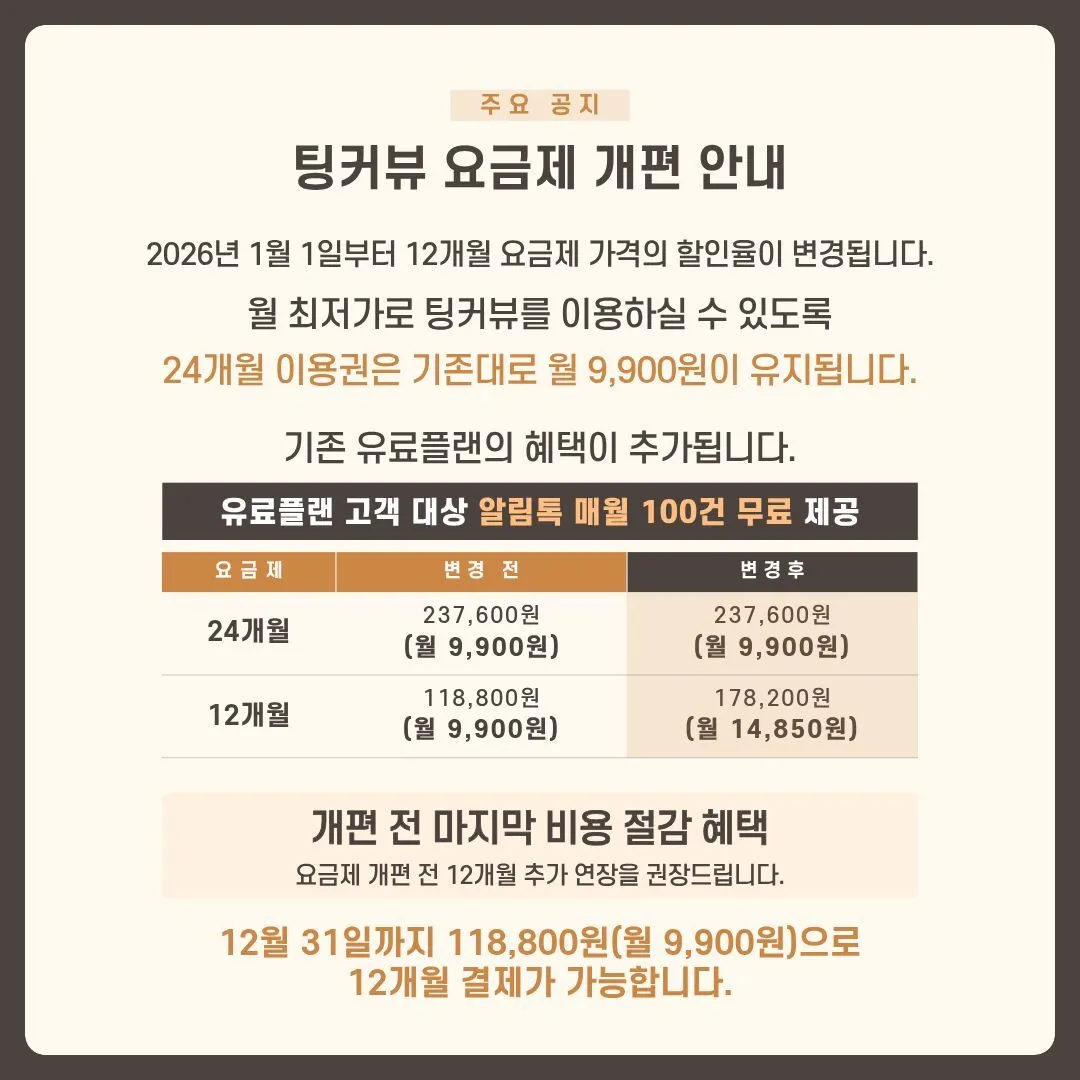 *알림톡 무료 제공 혜택은 2026년 1분기 팅커뷰 업데이트 일정에 맞춰 적용될 예정이며, 기존에 잔여 문자포인트가 있는 경우 무료 알림톡 혜택이 먼저 적용되고, 무료 100건이 소진된 후 잔여 포인트가 차감됩니다. 업데이트 일정은 추후 안내 드리겠습니다.