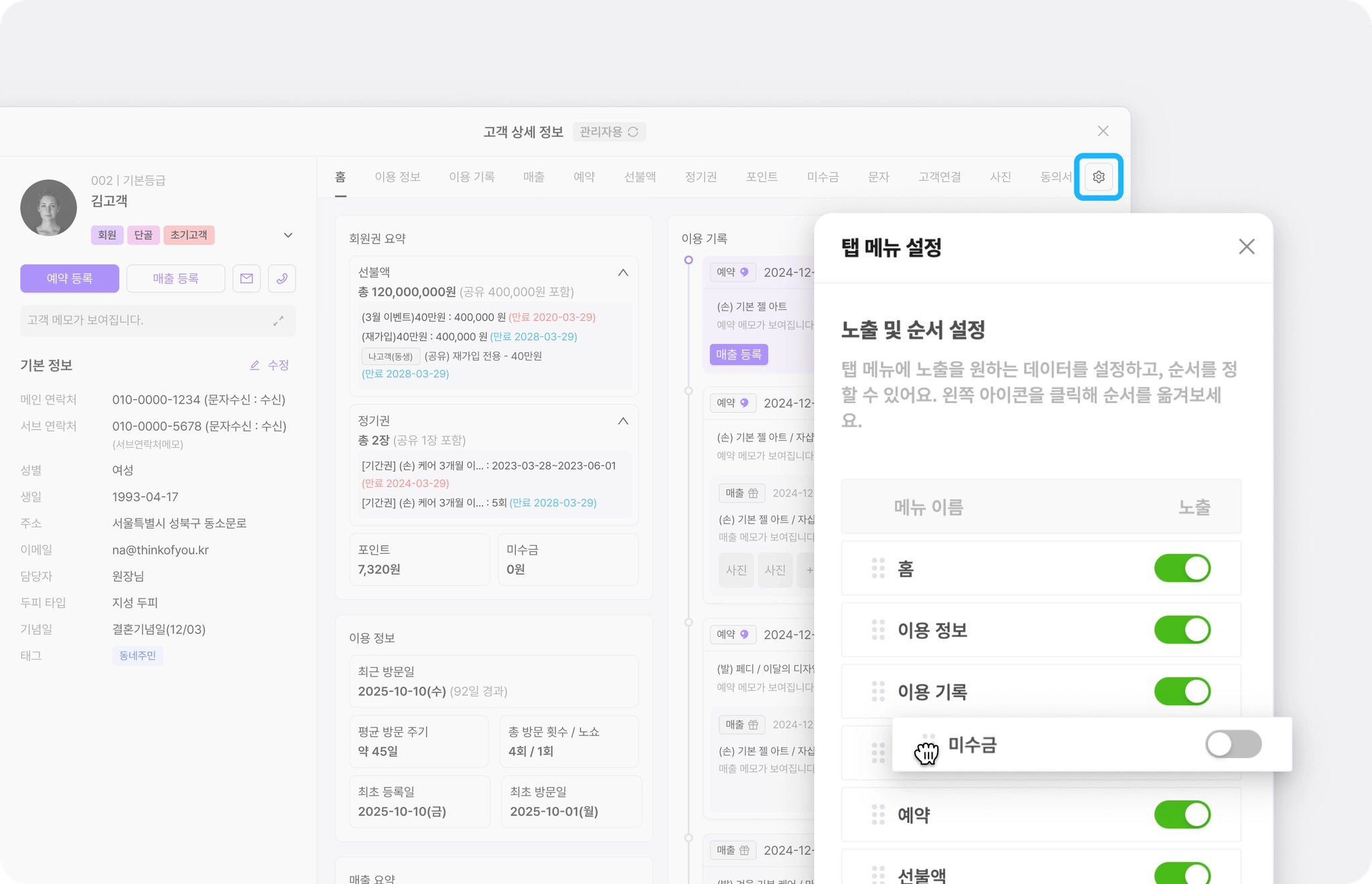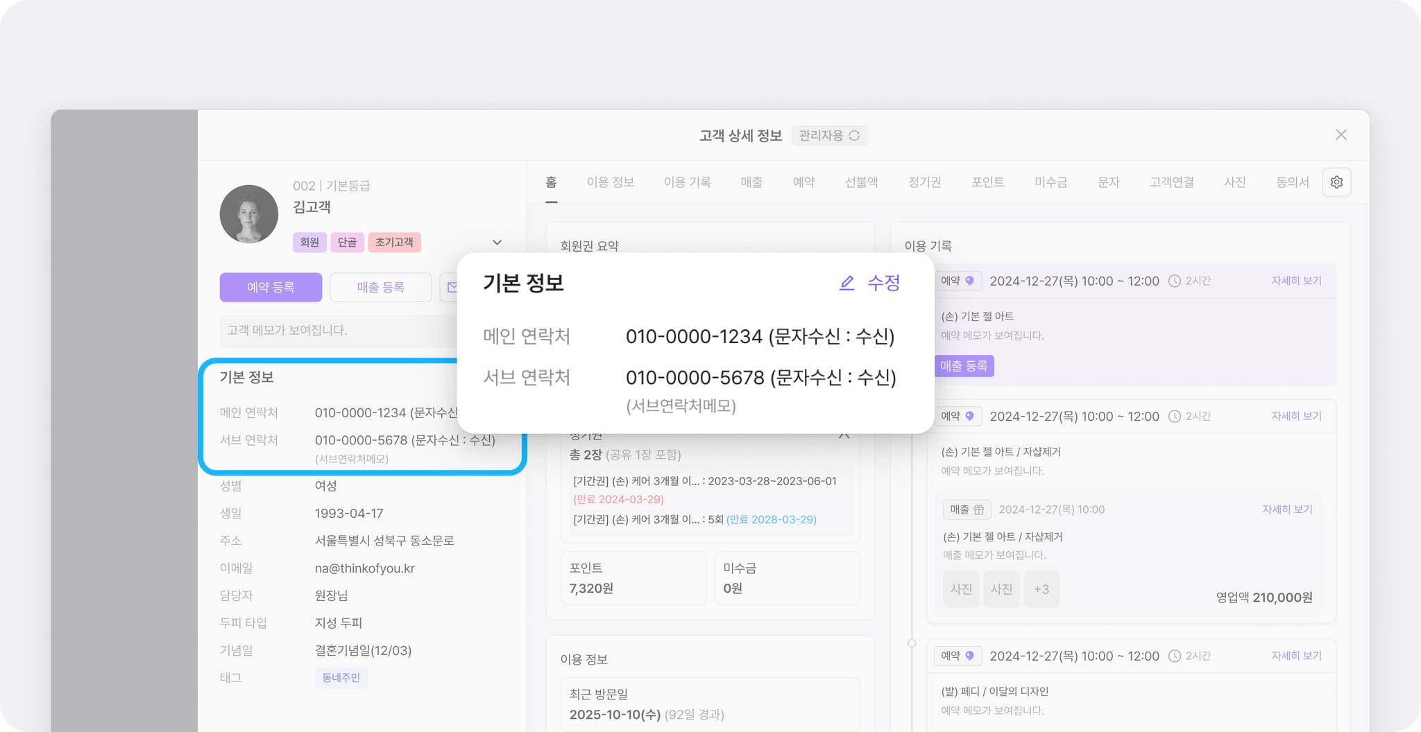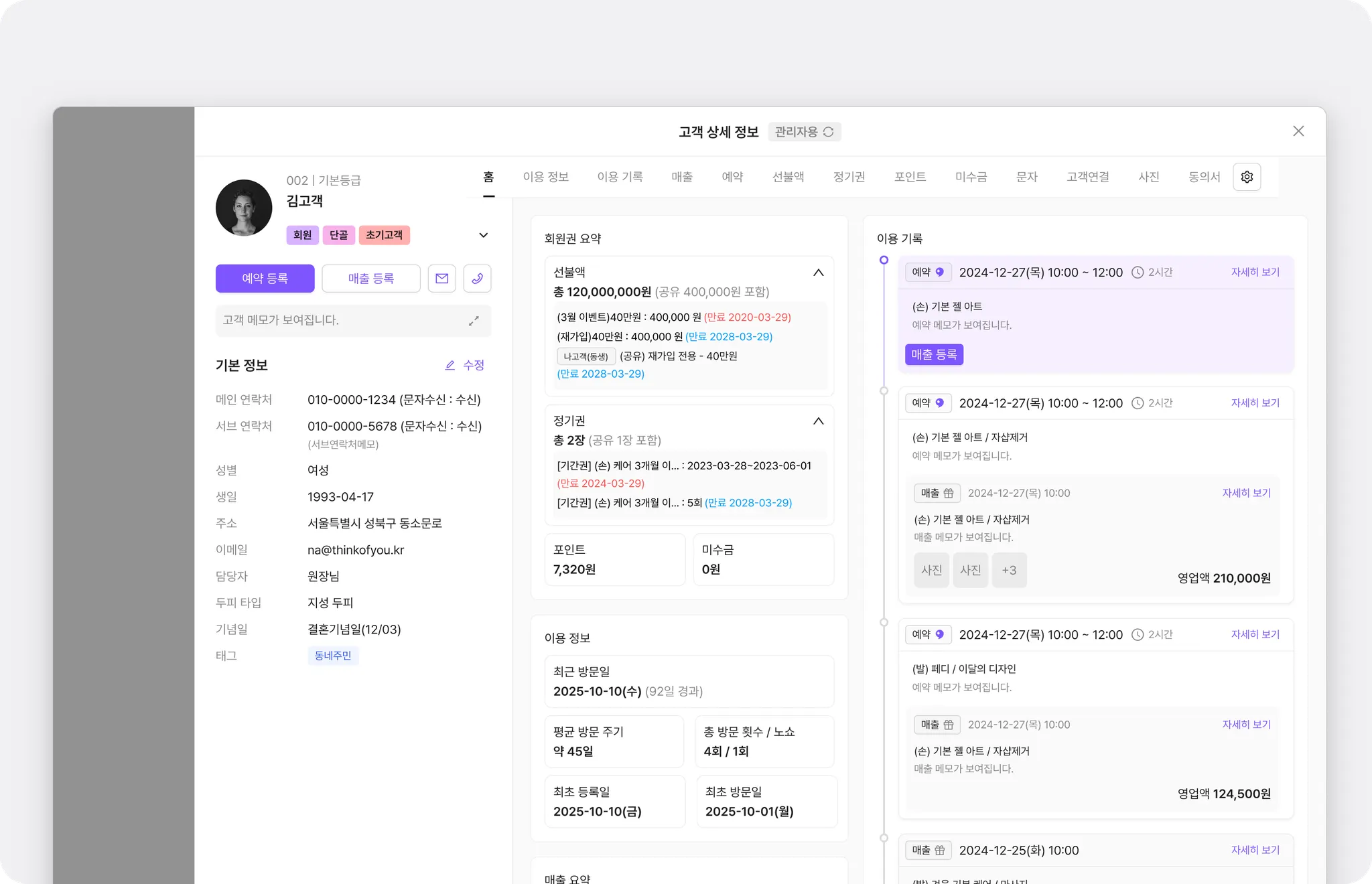 [고객 상세 정보] - [홈]에서 고객의 기본 정보부터 이용 현황, 매출 요약, 최근 이용 기록까지 한번에 확인할 수 있어요.