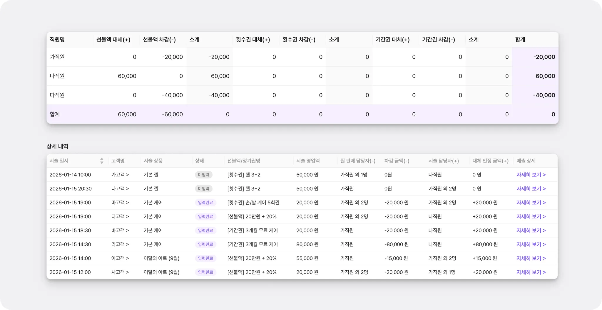 회원권을 판매한 직원과 시술을 진행한 직원이 달라 인센티브를 어떻게 지급해야 할지 애매했던 적 있으셨나요? 판매 실적과 시술 실적이 섞여 관리하기 어려웠을 거예요.