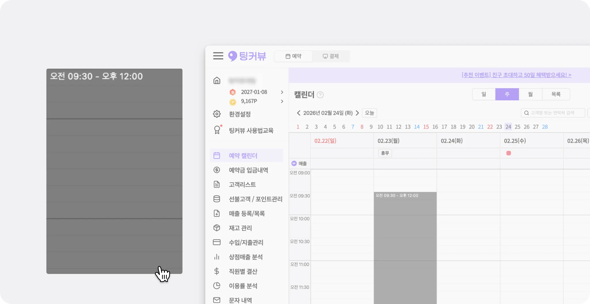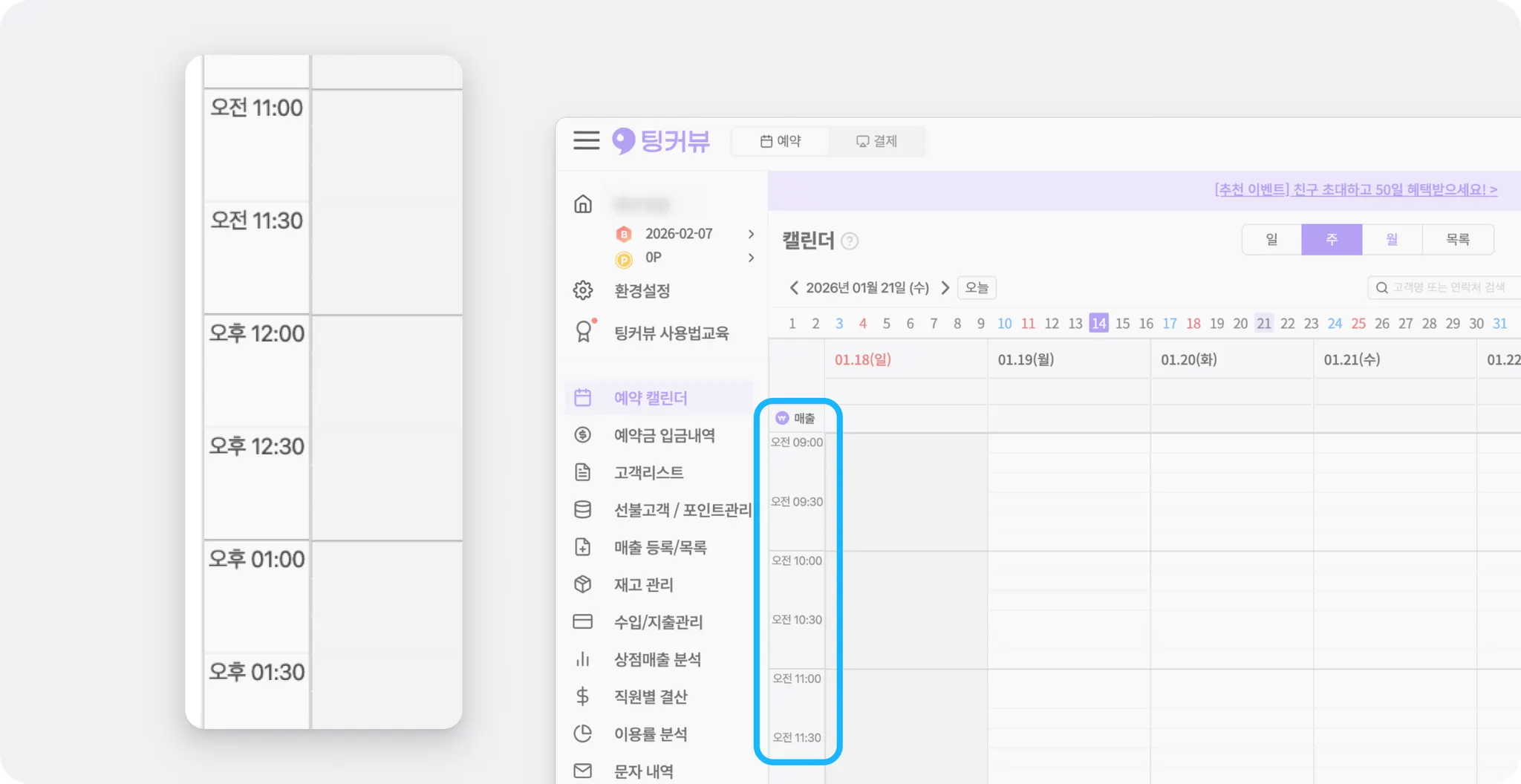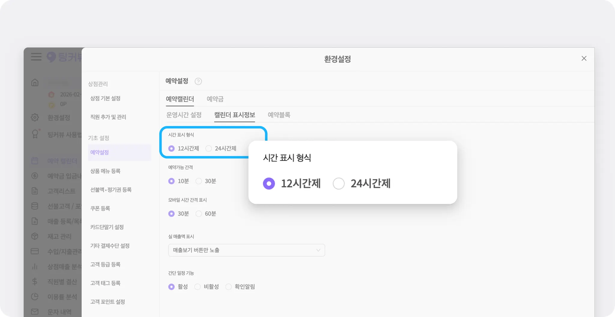 [환경설정] - [예약설정] - [예약캘린더] - [캘린더 표시정보]에서 시간 표시 형식을 12시간제 또는 24시간제로 선택할 수 있어요. 매장에서 익숙한 시간 표기에 맞춰 설정해 보세요.