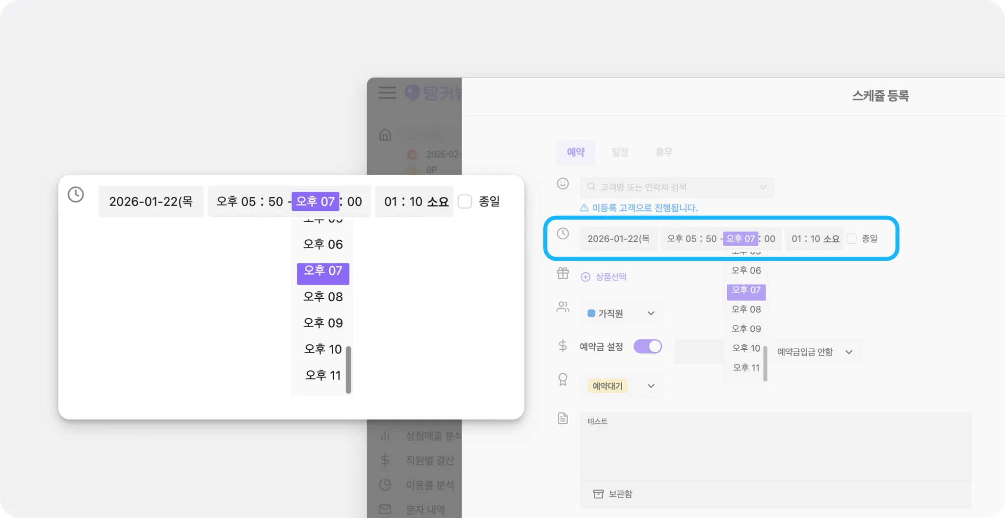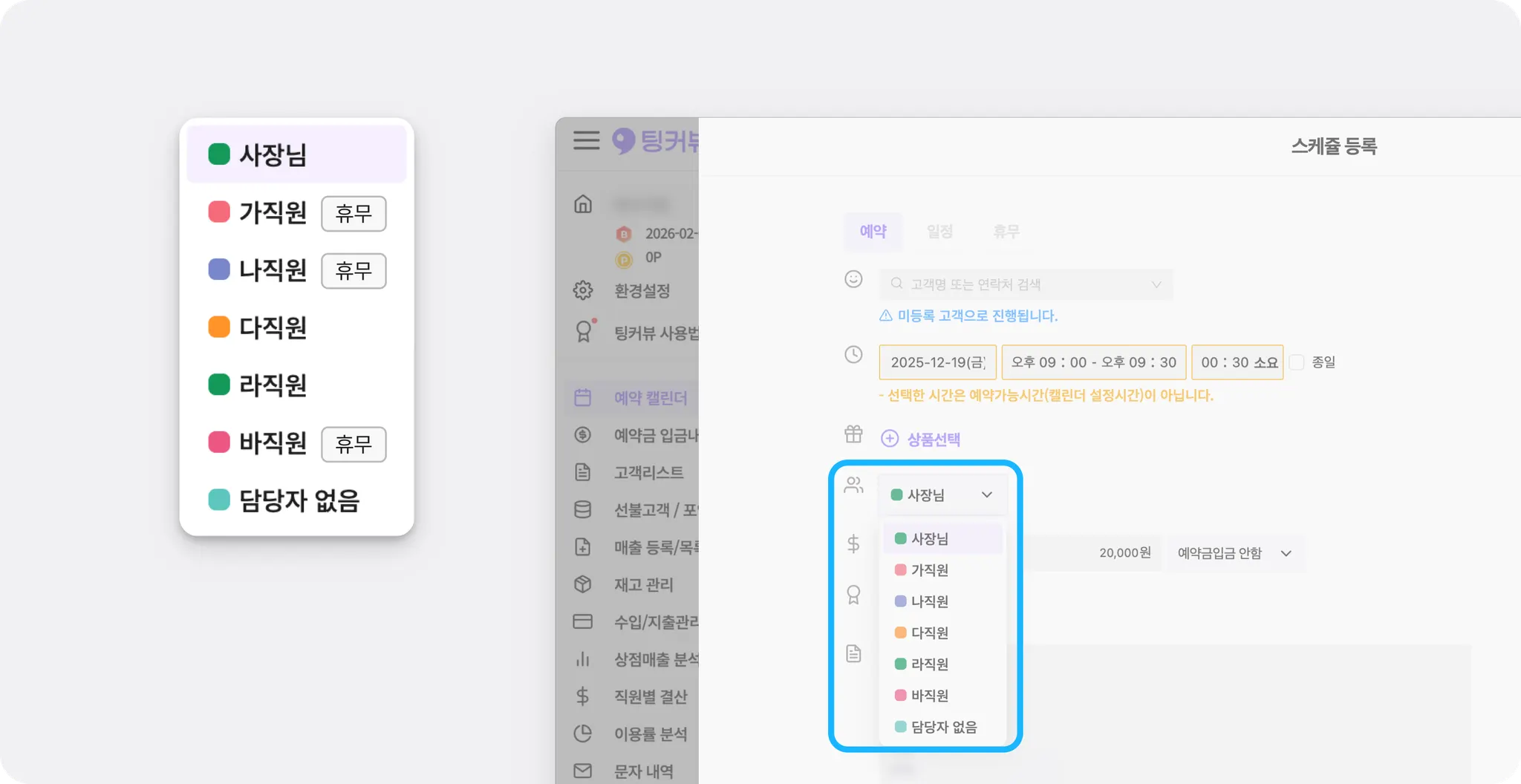 스케줄을 등록하다가 휴무인 직원을 모르고 선택하거나, 이미 일정이나 예약이 있는 시간대에 중복으로 등록해버린 적 있으셨나요? 현장에서 바로바로 확인하기 어려워 실수가 생기기 쉬웠을 거예요.