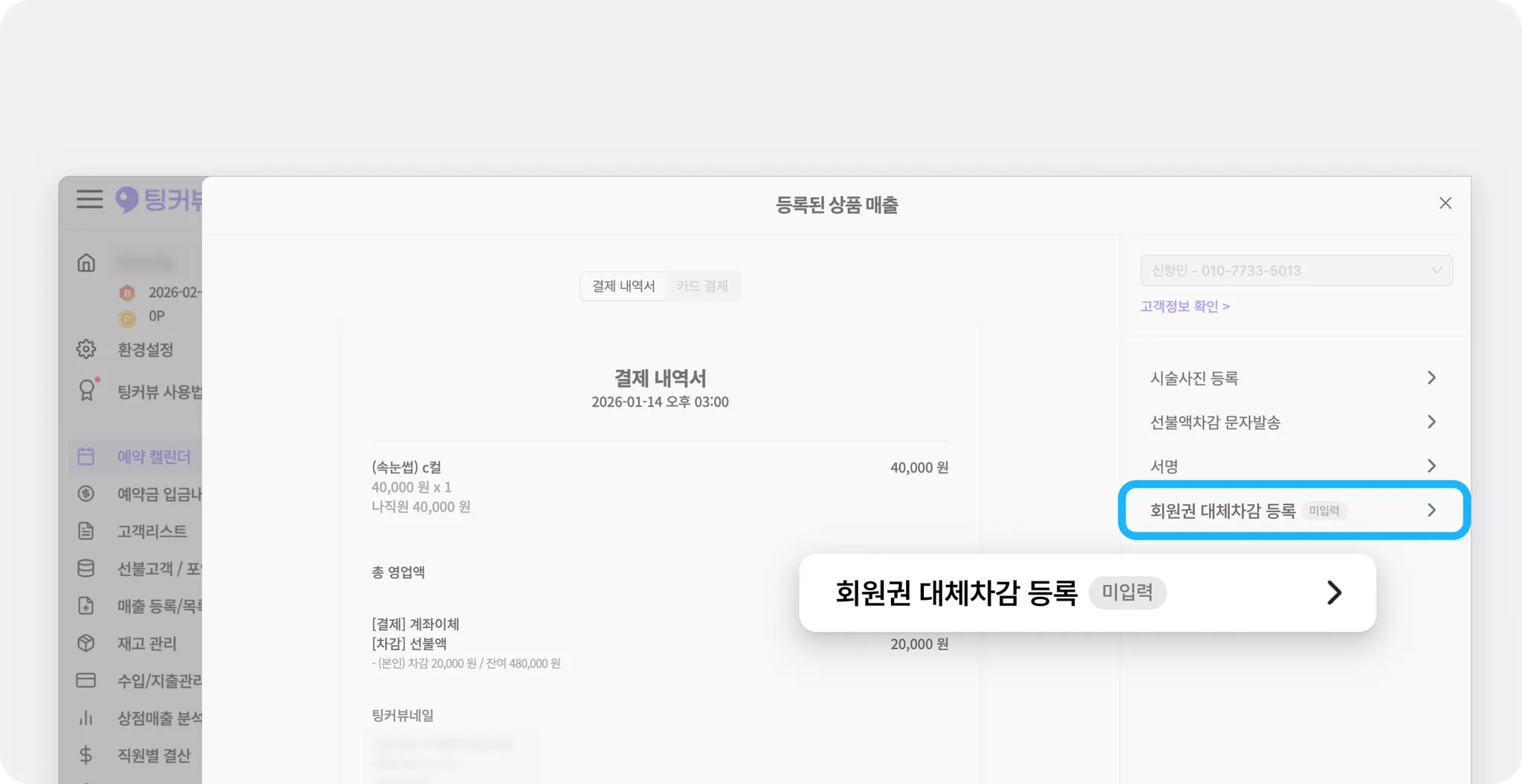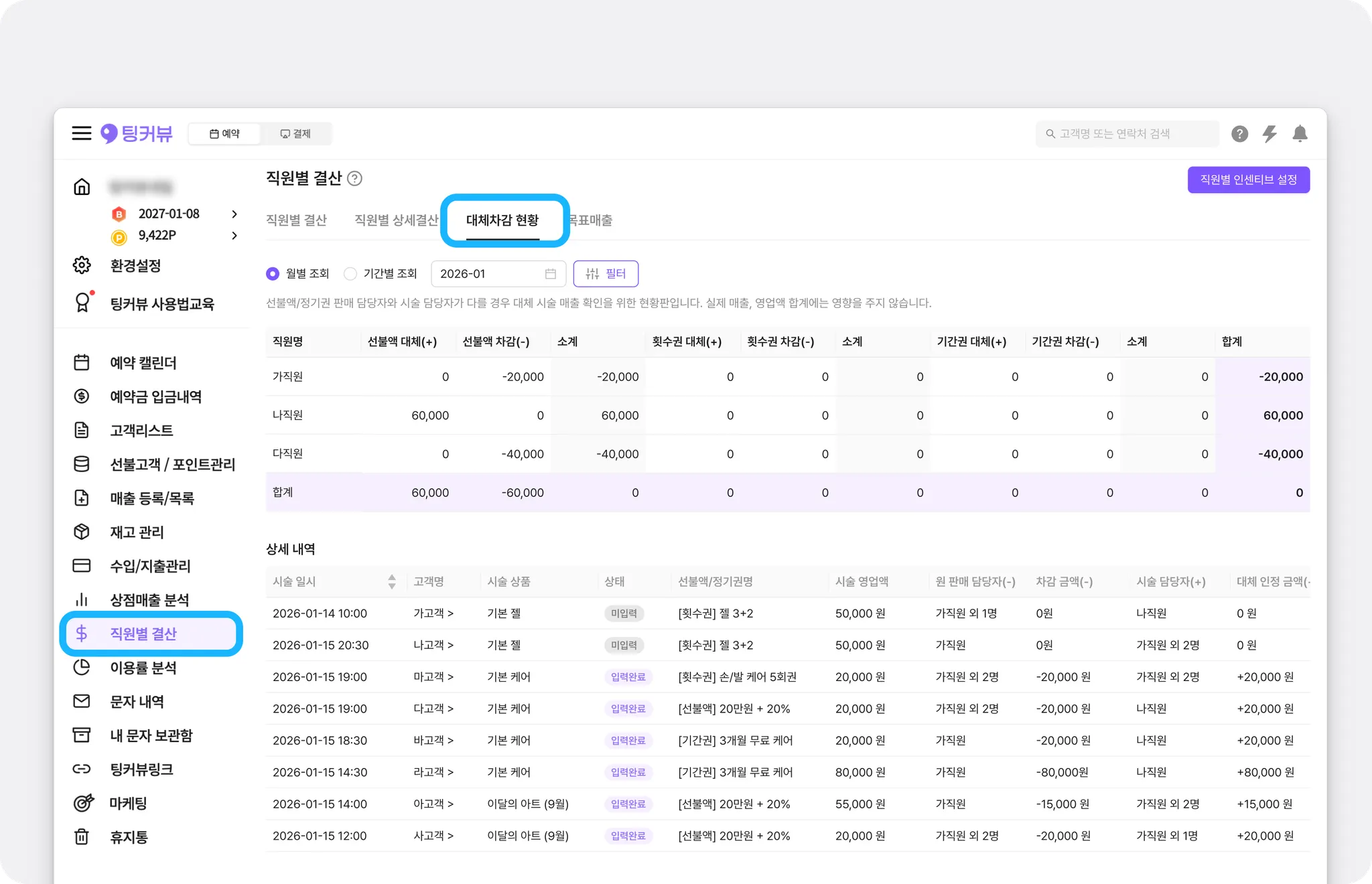 회원권 대체차감 기능을 통해 각 직원의 회원권 판매·시술 실적을 명확하게 관리하고 인센티브를 정확히 지급하는 데 활용해 보세요!