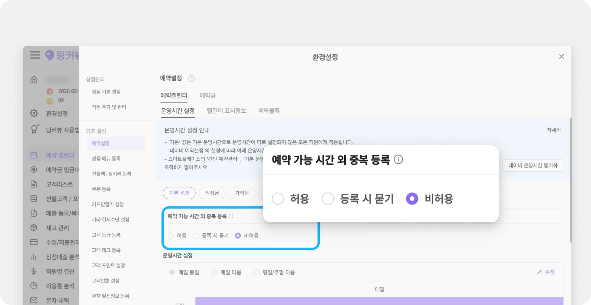 [환경설정 - [예약설정] - [운영시간 설정] - [예약 가능 시간 외 중복 등록]에서 기존 스케줄이 있을 때 예약 중복 등록을 허용할 지 선택할 수 있어요. (기본값: 허용)