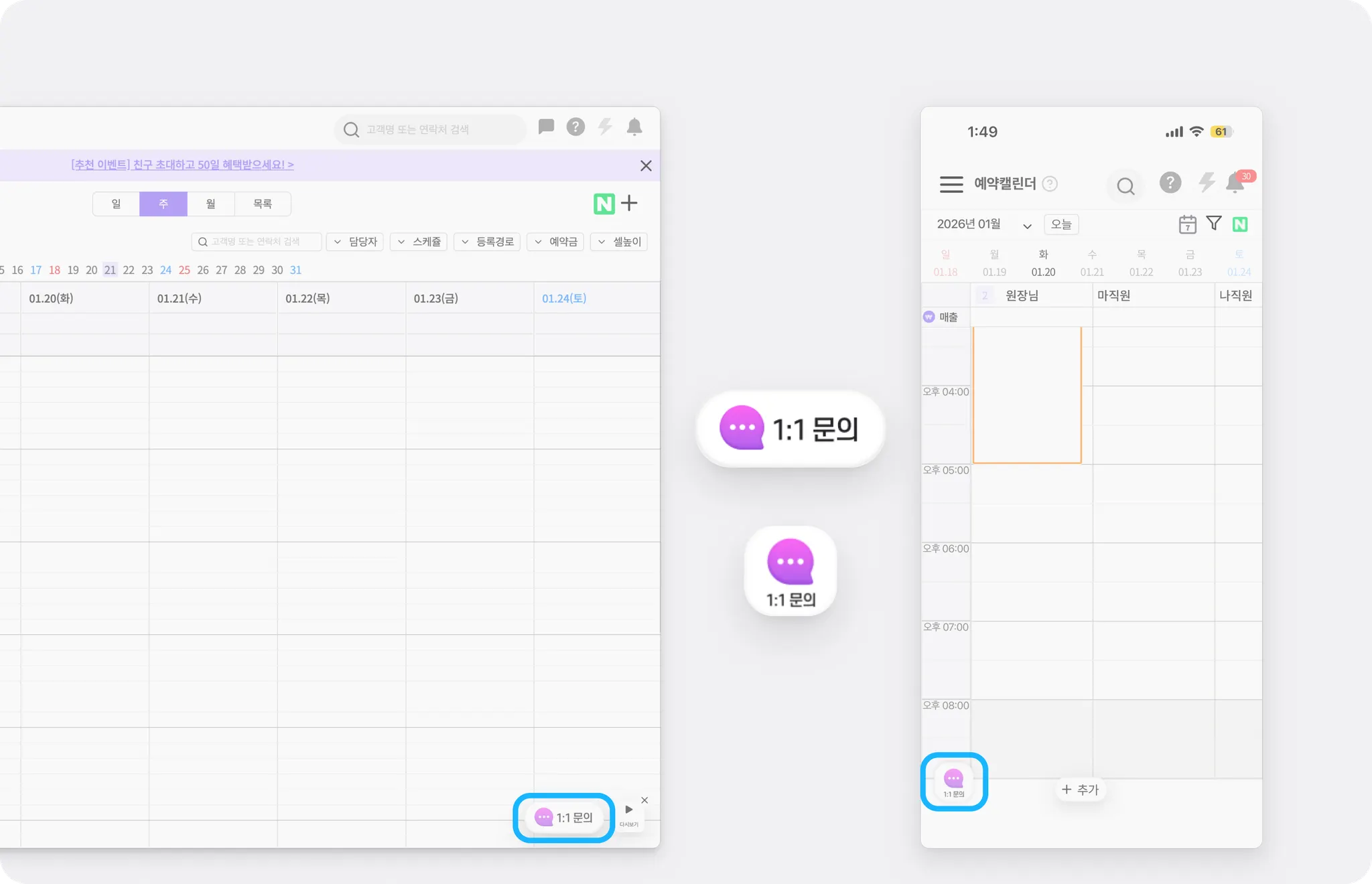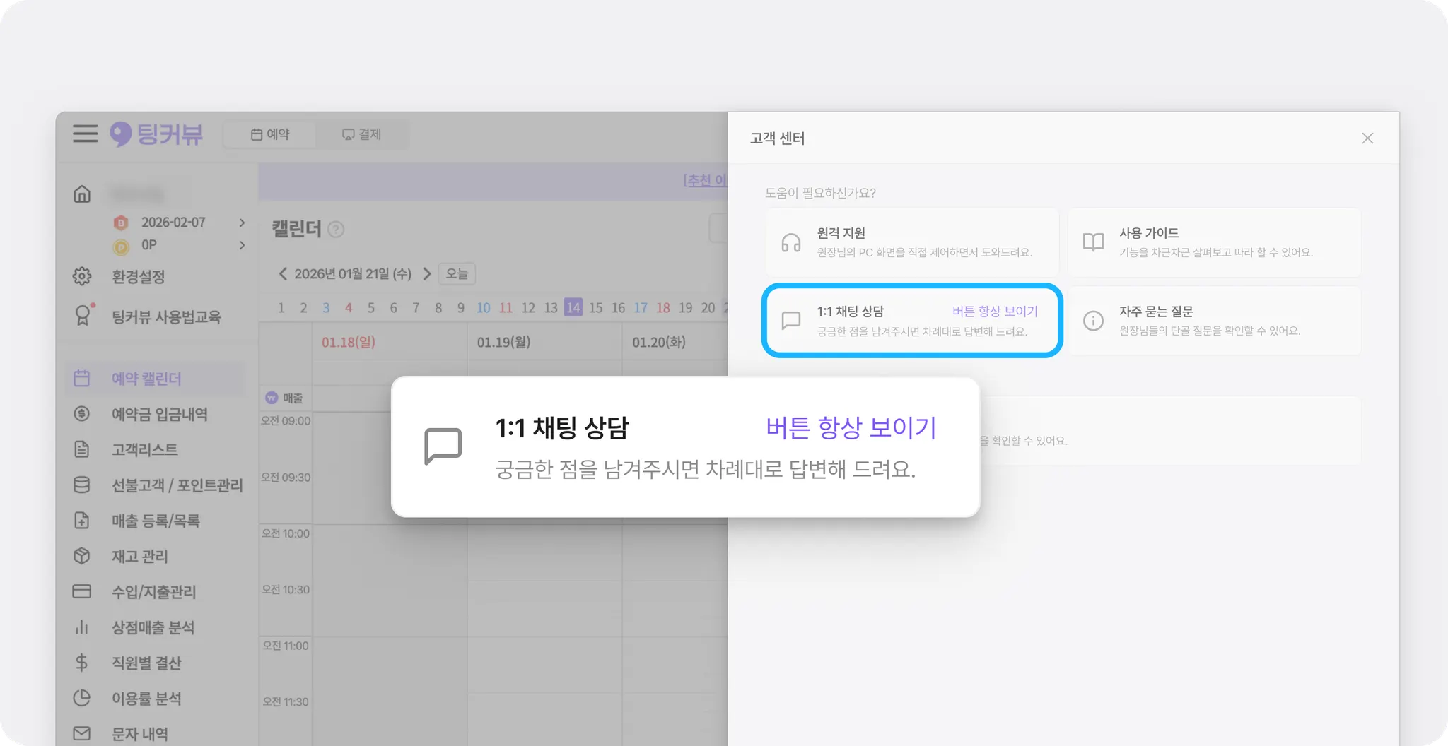 모바일에서 캘린더를 보다가 1:1 문의 플로팅 버튼이 화면을 가려 불편했던 적 있으셨나요? 자주 쓰지 않는 매장이라면, 오히려 화면만 복잡해 보였을 수도 있어요.