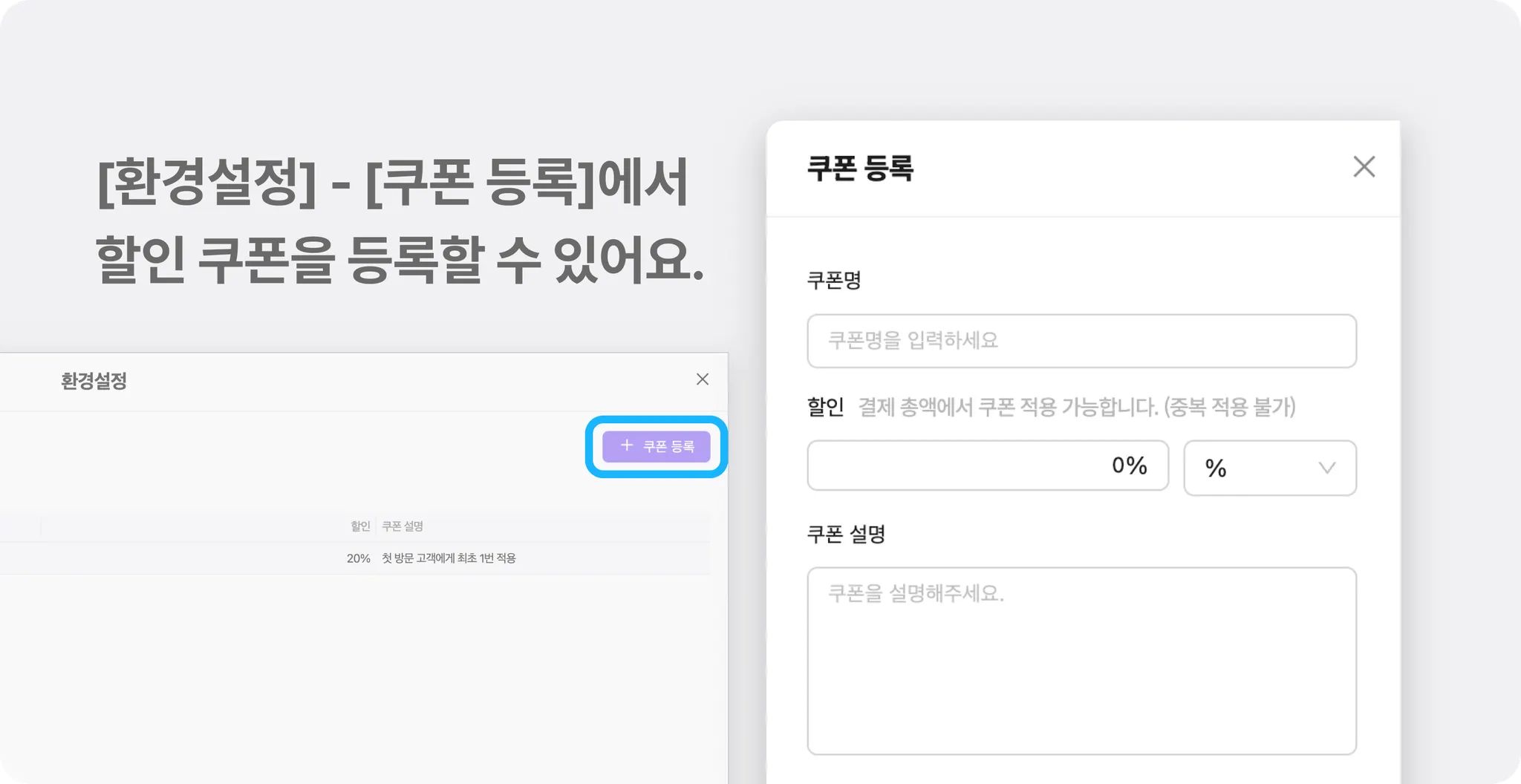 [환경설정] → [쿠폰 등록]에서 자주 쓰는 할인 쿠폰을 미리 등록해 두고, 결제 시에는 쿠폰으로 빠르고 깔끔하게 할인 적용을 진행해 보세요!