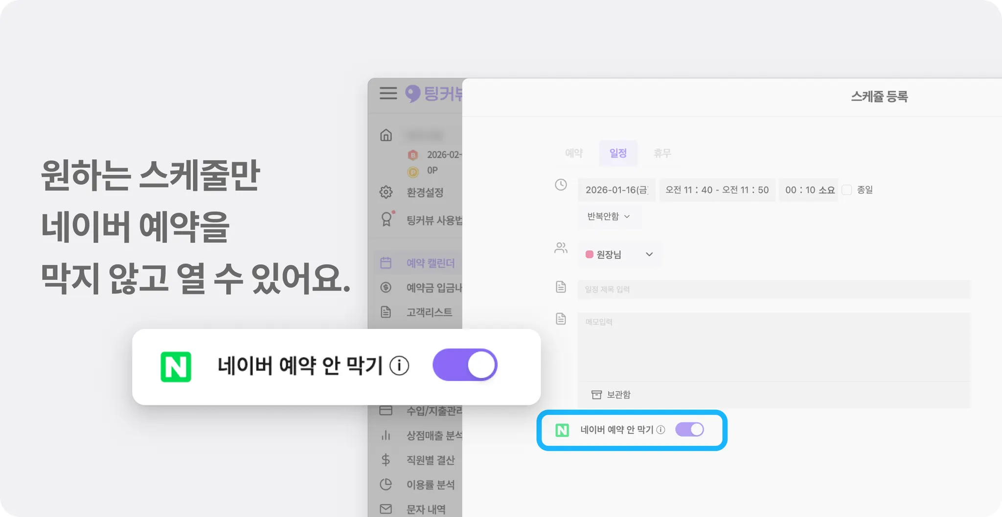 이제 [네이버 예약 안 막기] 옵션으로 특정 일정·휴무만 선택적으로 네이버 예약을 열어둘 수 있어요.